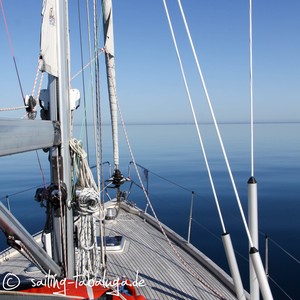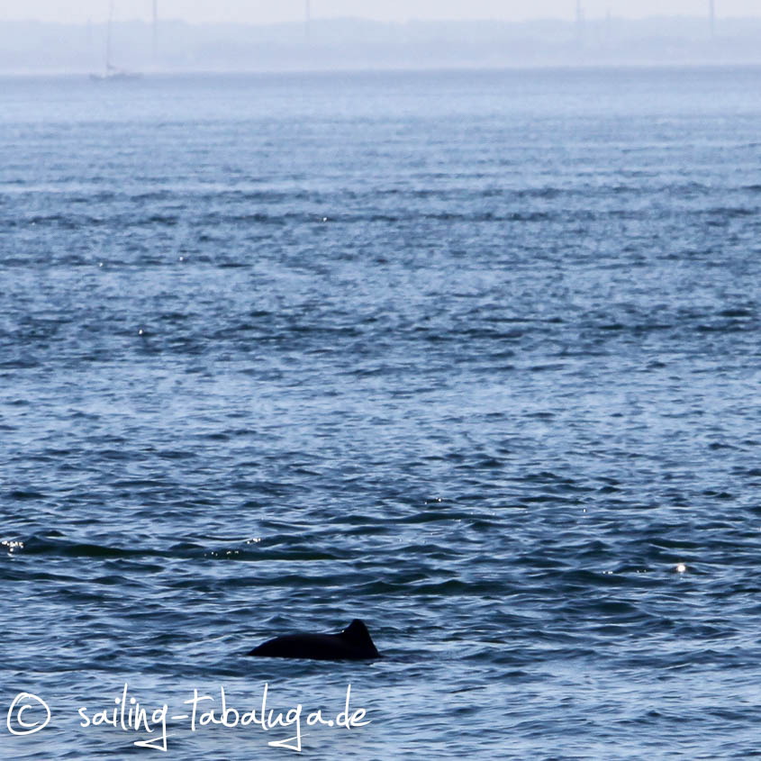 Wir tuckern also doch unter Motor durch eine blaue Welt. Blauer Himmel, blaues Wasser, kein Wölkchen, kein Wellchen. Dafür Schweinswale, bestimmt 10-15 waren es heute. Auch wenn man nur hier und da eine Rückenflosse sieht, so weiß man doch, dass da ein paar lustige Gesellen in Delphingestalt durch die Ostsee schwimmen und kann sich darüber freuen.