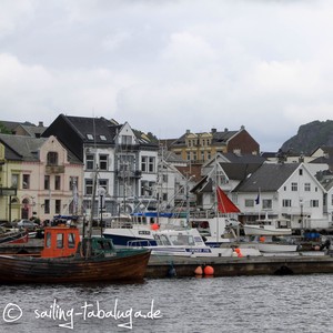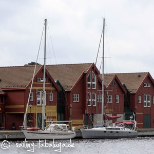 Gegen Nachmittag beschließen die Skipper, dass Zeit für den Aufbruch ist, schließlich wollen wir ja noch mehr von Norwegen entdecken. Die Rede ist von 30 Seemeilen in Richtung eines geschützten Hafens. Dass es hinterher auch noch 30kn Wind werden, war nicht so ganz zu ahnen. Unsere Tabaluga und wir geben alles, haben Geschwindigkeiten von bis zu 8kn mit den Wellen und merken das erste Mal, dass es hier doch ein bisschen rauer ist als in unserer gewohnten Ostsee. Die Wellen sind letztendlich aber besser zu ertragen, zum einen fahren wir mit ihnen, zum anderen sind sie einfach länger als in der Ostsee. Dennoch: für empfindliche Mägen wäre es jetzt nichts mehr. Kaum kommen wir in den Schutz der vorgelagerten Inseln ist Ruhe. Wir legen vor Cybèle direkt hinter ein paar höheren Häusern an, alles gut, alles heile.