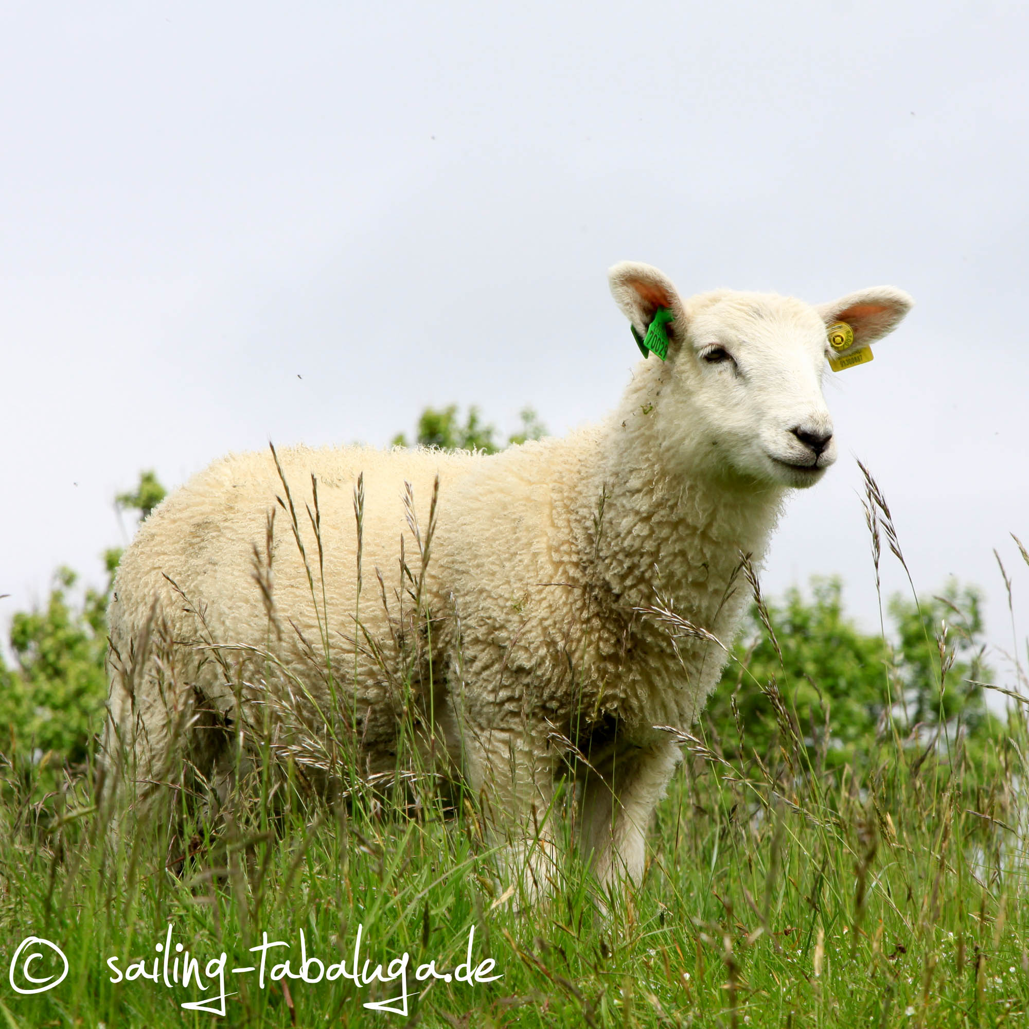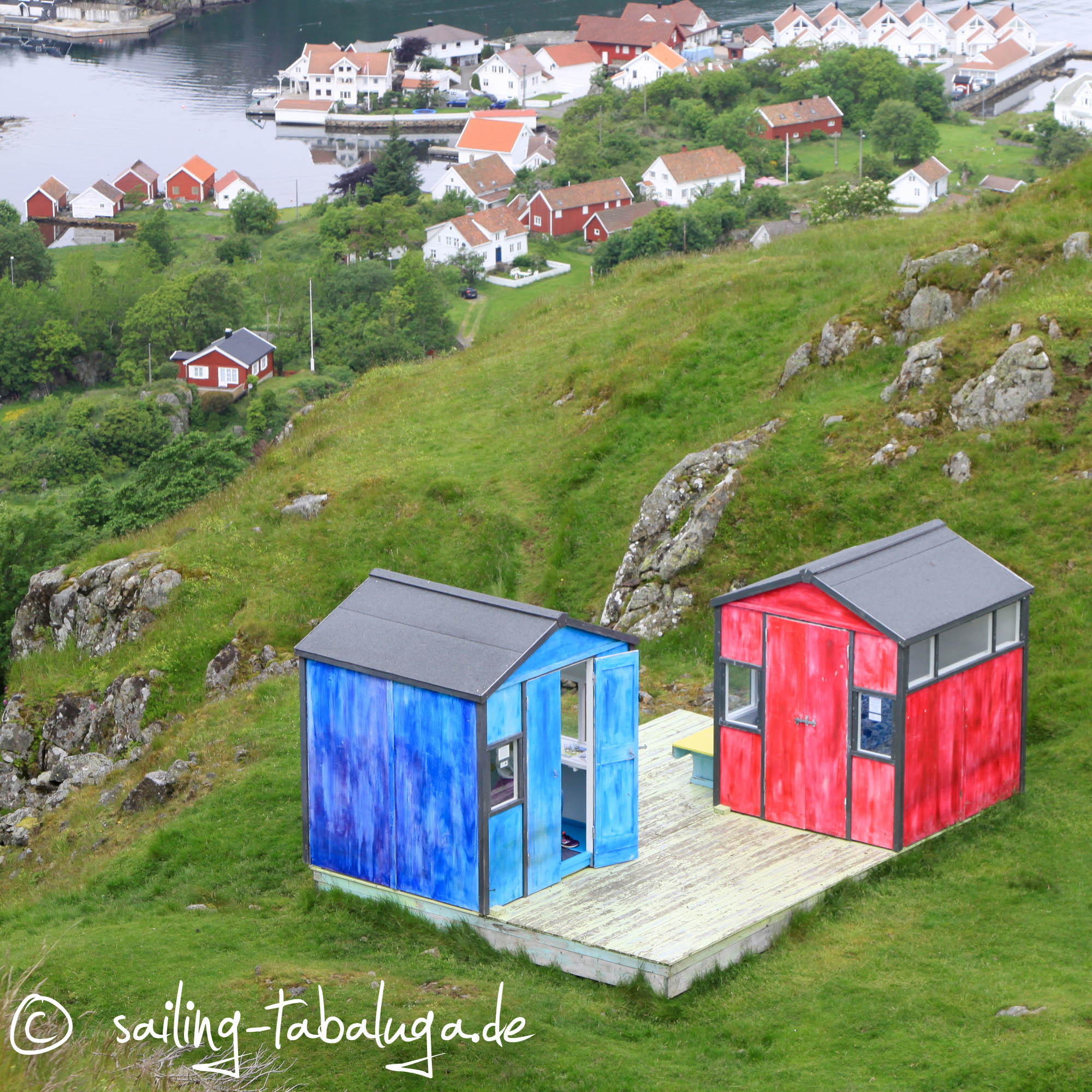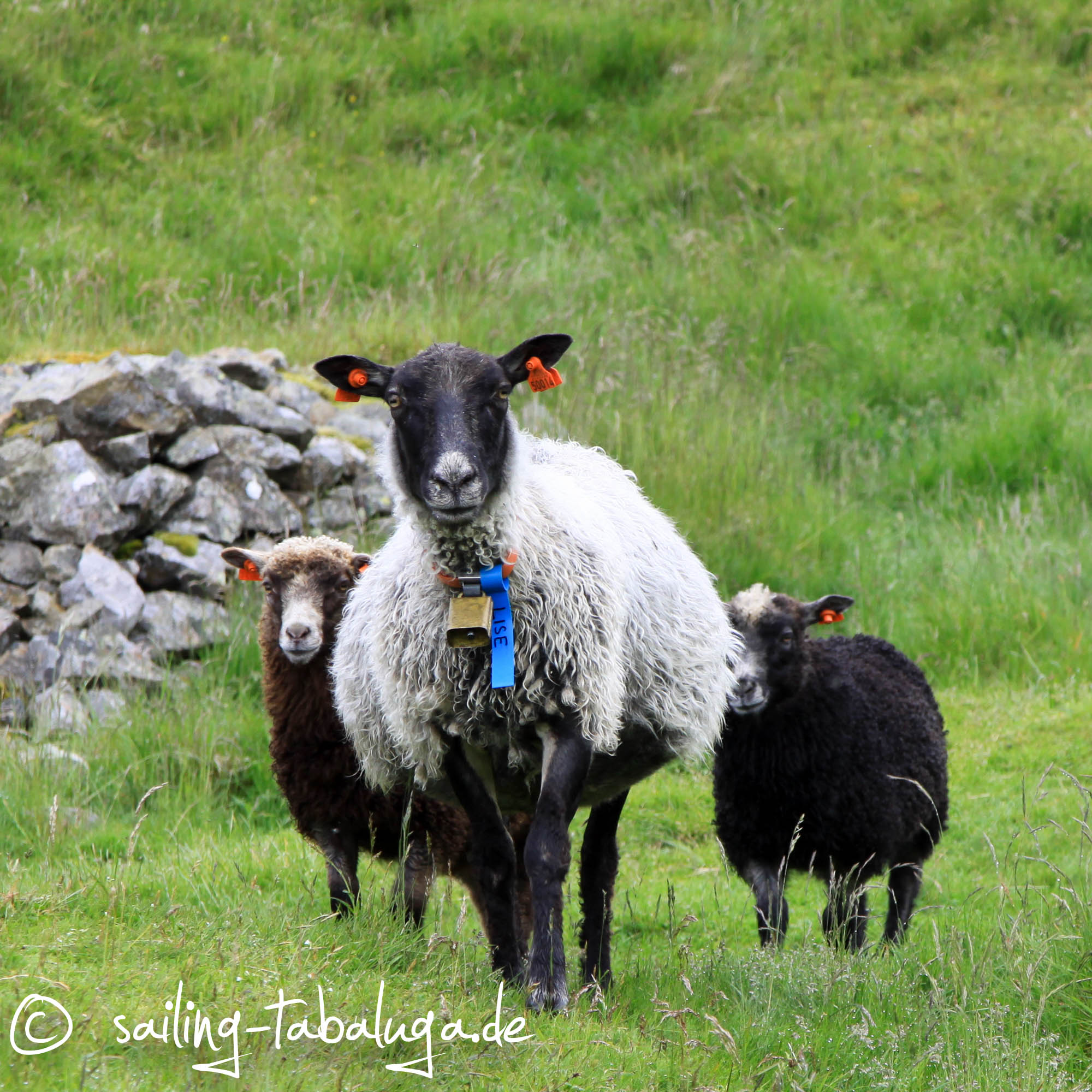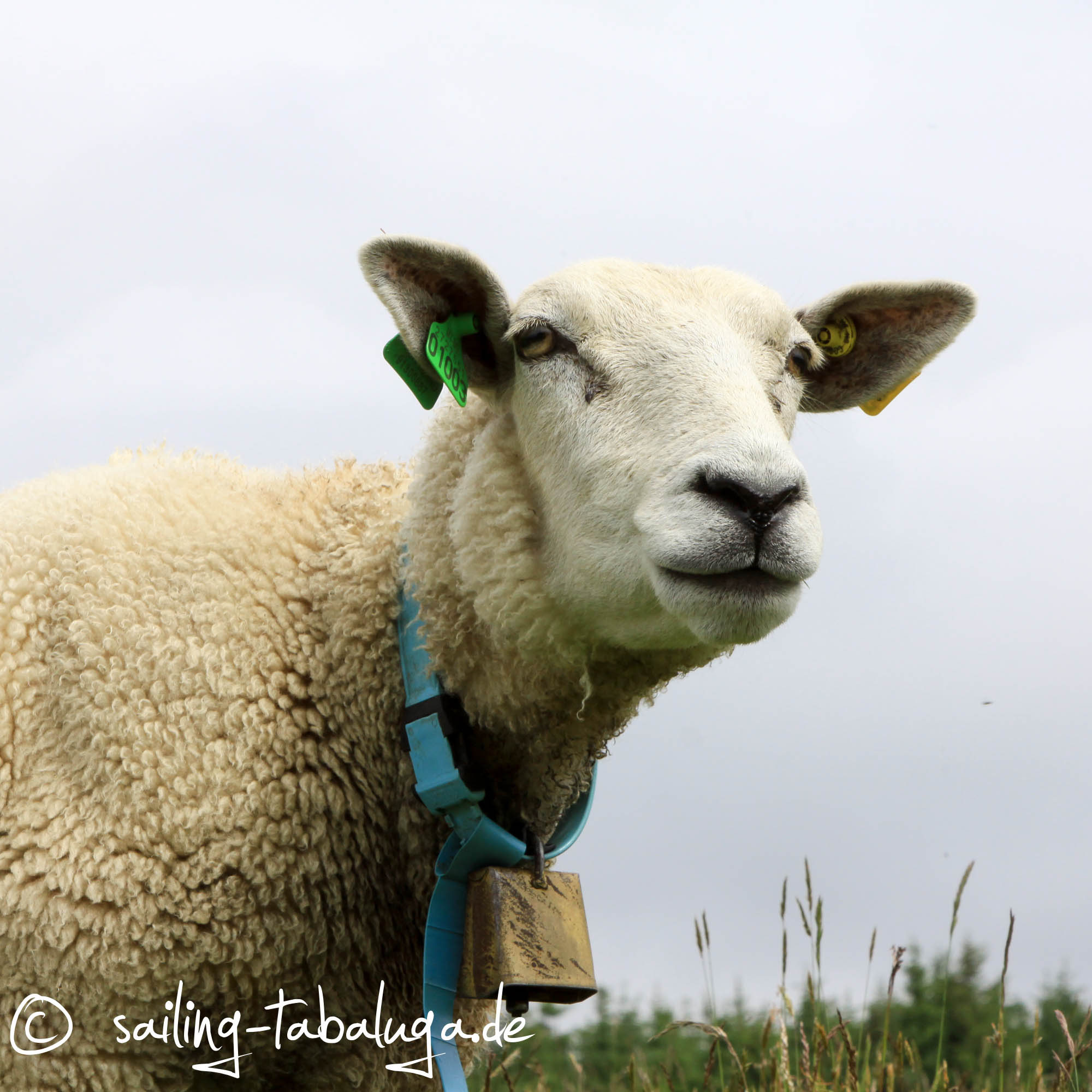 Heute freuen wir uns aber über besagte Schafe, die wunderbare Aussicht und zwei niedliche Hütten, in der Roten kann man übernachten, in der Blauen Kaffee kochen! Wir erklimmen den Gipfel von 140m, was insofern spannend ist, als dass wir unsere Boote noch sehen können. Man erahnt also, wie schnell es vom Wasser aus nach oben geht.