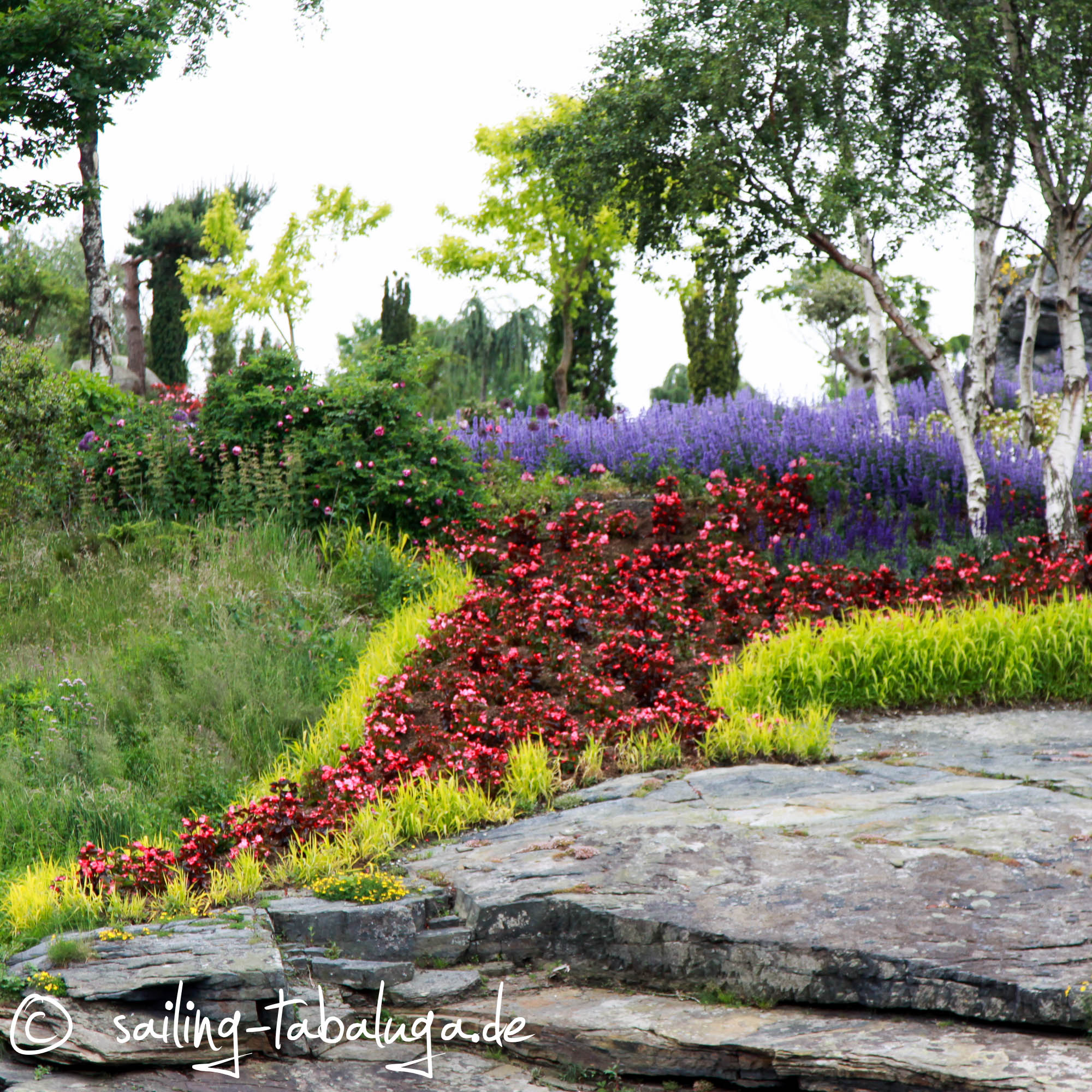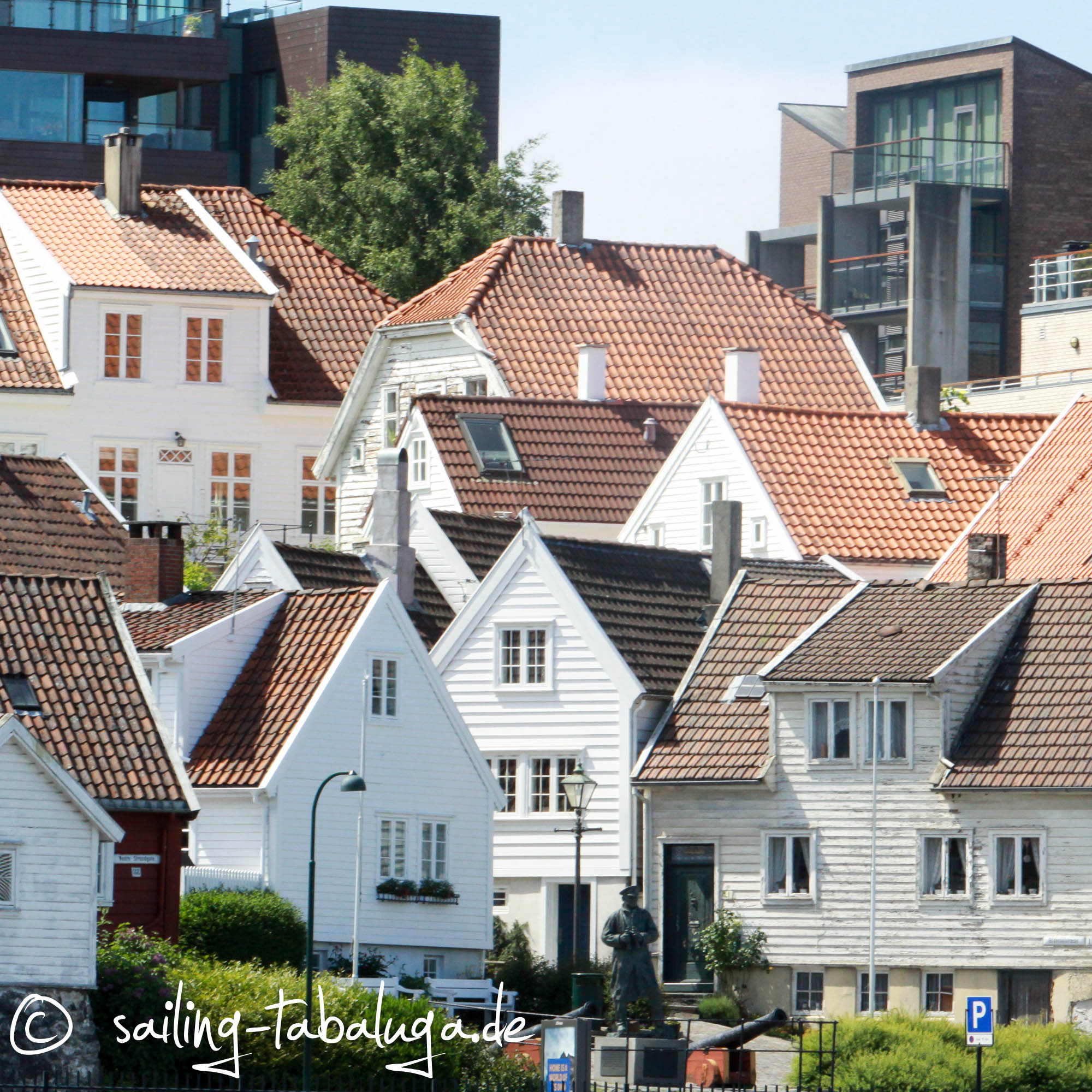 In Stavanger wollen wir doch noch einmal kurz anlegen, da kein Kreuzfahrtschiff im Hafen ist und wenigstens ein Eis essen. Aber der Wind drückt mit 20kn und anstatt der Großen liegen nun ein paar private Motoryachten dort, so dass uns das zu kniffelig wird und wir weiter fahren. Auf dem weiteren Weg sehen wir ein schwimmendes Haus. Ja, wirklich. Ein Haus, rot gestrichen mit Giebeln und Gaube. Ein Hausboot, wie es scheint, an dem die ringförmigen Gittern einer Fischzucht befestigt sind. Irgendwo lese ich, das bei zu vielen Fischen in einem Ring zu wenig Platz zum Schwimmen ist, daher die Tiere zu schlapp und im Geschmack nicht so der Hit sind. Ist halt wie überall mit der Massentierhaltung 🙁. Immerhin haben sie hier sauberes Wasser!