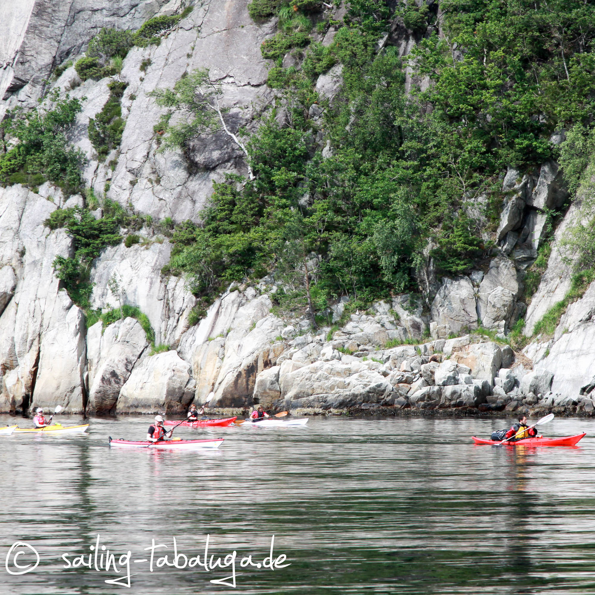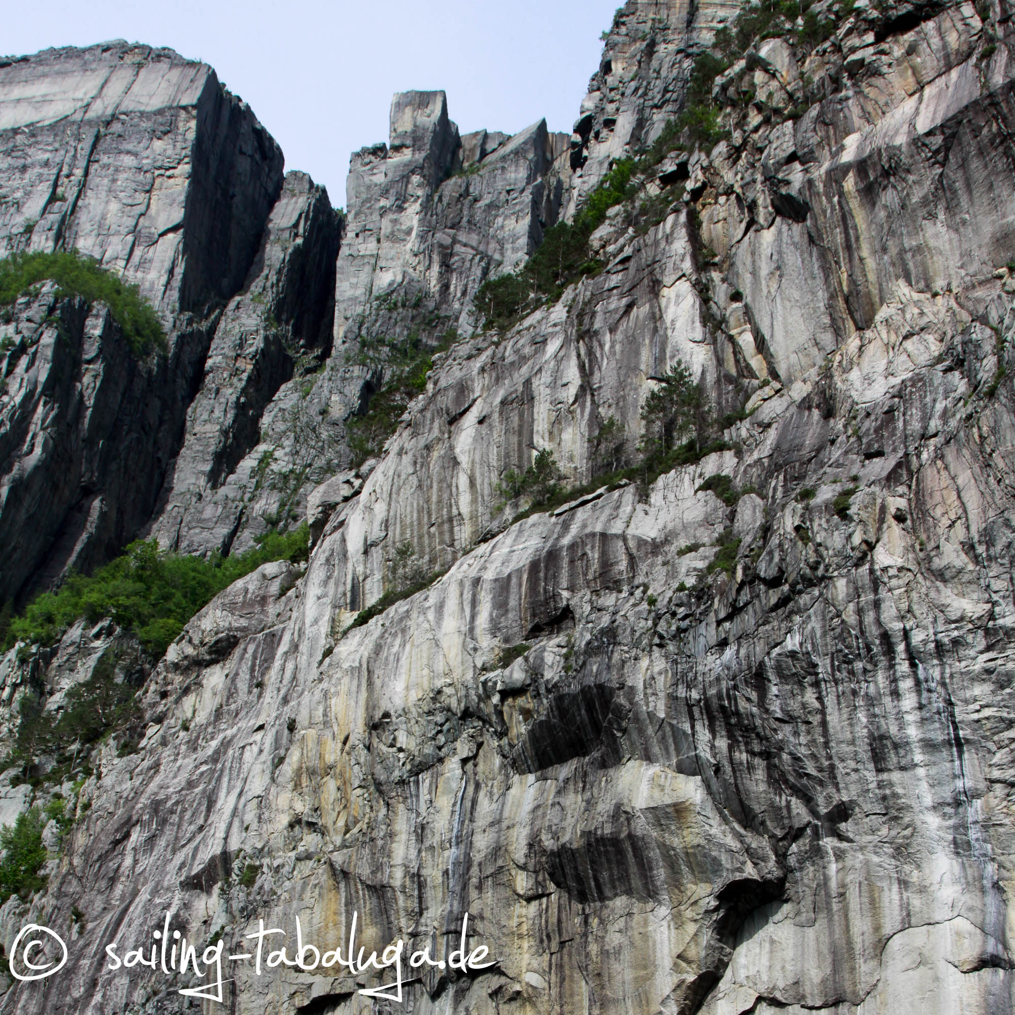 Der helle Fjord, der seinen Namen von den hellen Granitwänden hat, ist einfach nur atemberaubend. Wir starten früh, um möglichen Ausflugsfähren so gut es geht aus dem Weg fahren zu können. Wir sind ganz alleine, es ist windstill und die Sonne kommt heraus. Ganz dicht fahren wir an die Felsen heran und dennoch gibt unser Tiefenmesser 100m Tiefe an. Unglaublich! Den Preikestolen, eine natürliche Aussichtsplattform erkennen wir von unten und Wasserfälle säumen den Weg. Wir legen kurz an einem kleinen Steg an und stellen fest, dass das wohl ein Fähranleger ist. Zumindest gibt es einen Fahrplan. An einem Samstag hält aber nur morgens und abends ein Schiff 😉. Es wird warm, kurze Hose und Sonnentop werden heraus geholt. Uns kommt eine Gruppe Kajakfahrer entgegen, die fröhlich winken. Wir kommen uns schon klein vor, wie muss es denen erst gehen angesichts dieser gigantischen Kulisse? Auf einer Wiese am Fjordrand entdecken wir drei Ziegen - und sie uns! Sie hoppeln begeistert in unsere Richtung und scheinen um eine Mitfahrgelegenheit zu bitten 😀. Da sie Ohrmarken tragen, werden sie wohl da für die Sommerzeit hingebracht worden sein.