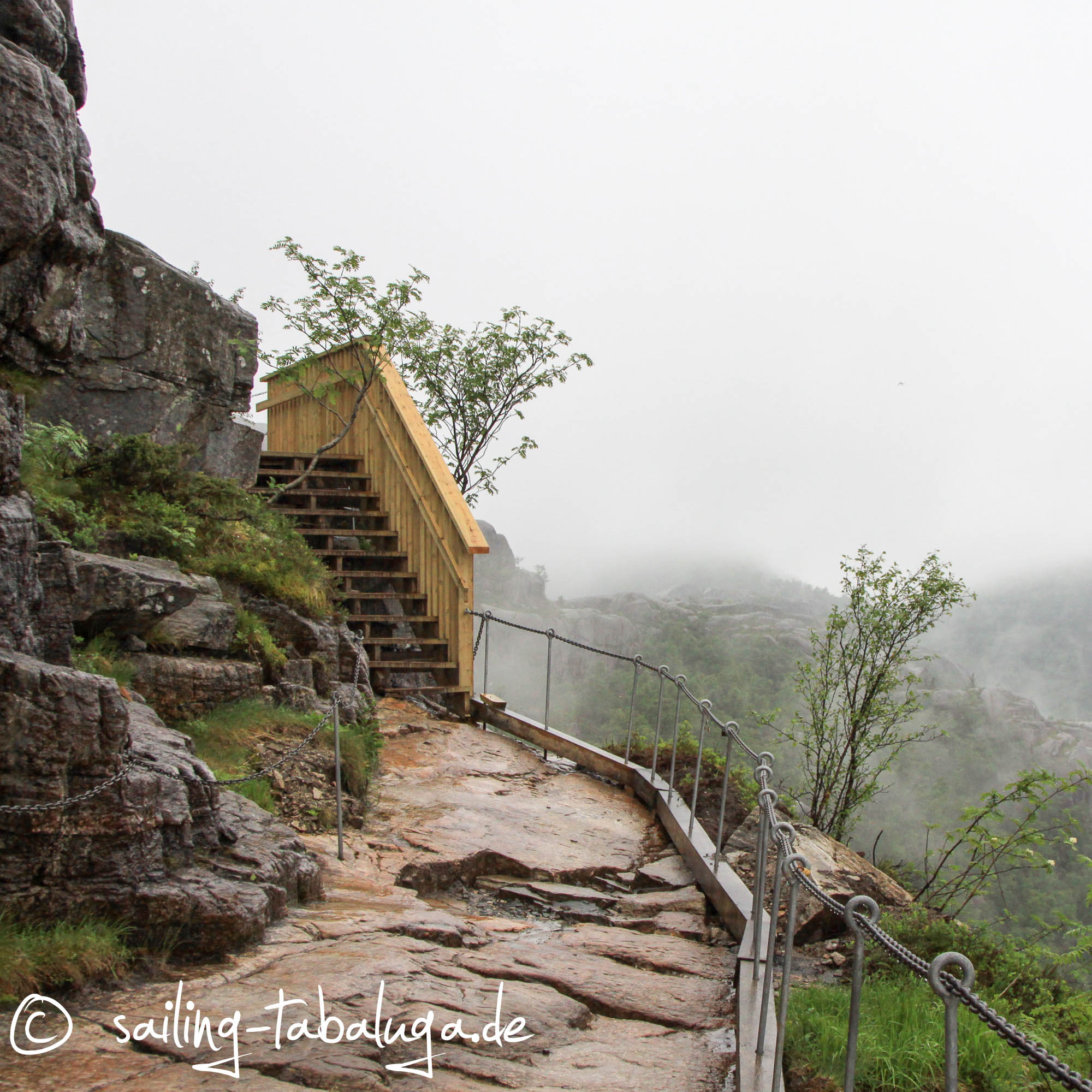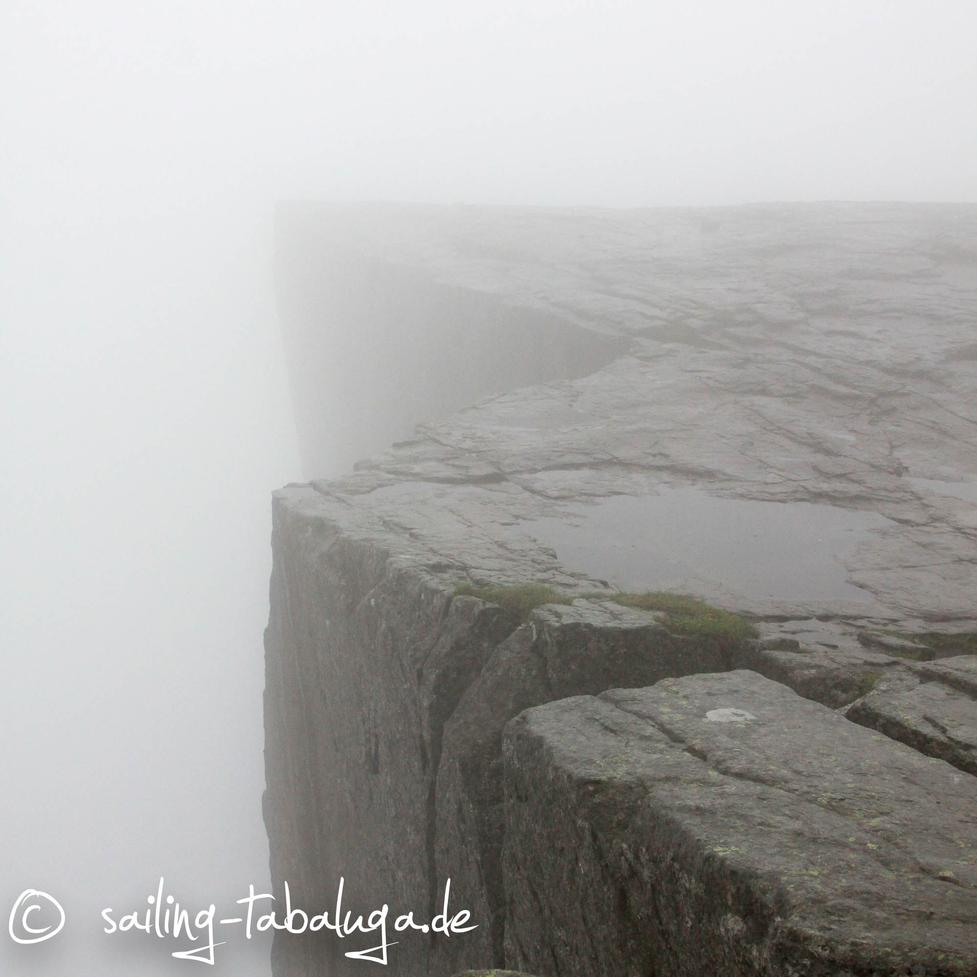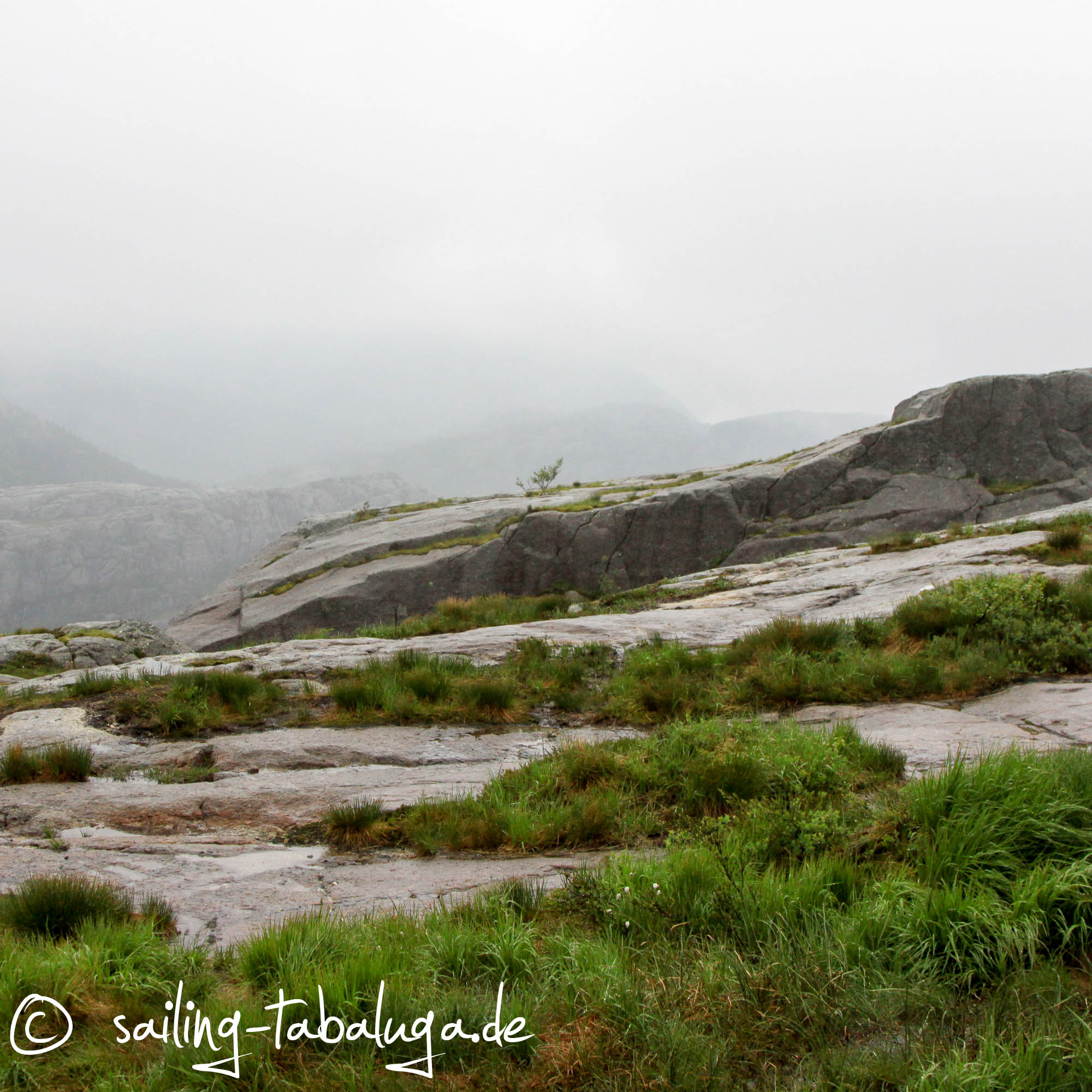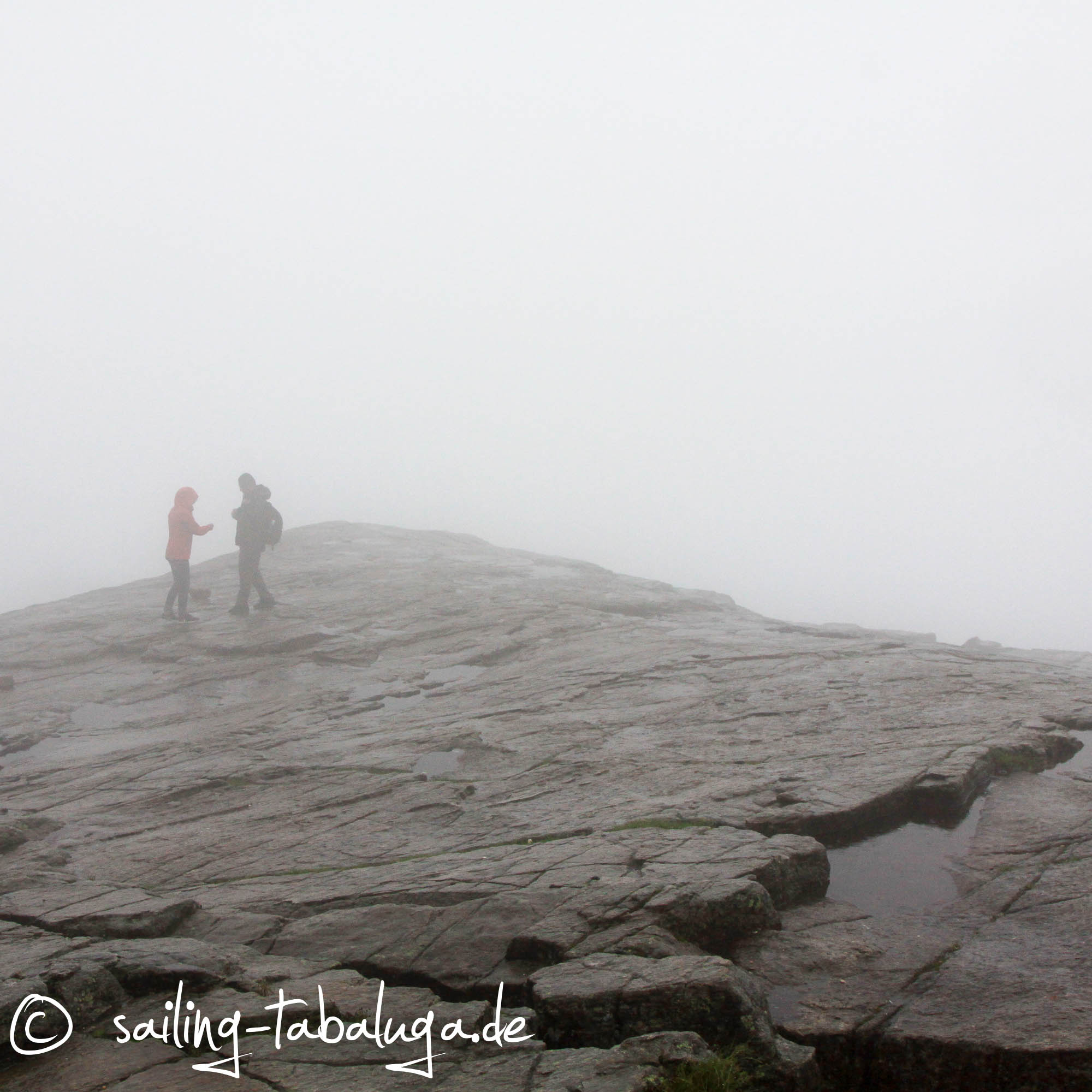 Nachdem wir die Menschenmengen hinter uns gelassen haben, kommt dann das nächste Problem. Der Regen. Nichts als Regen. Oben angekommen sehen wir genau: NICHTS. Kein Fjord, keine Felzkanzel, wir hängen mitten in den Wolken 😔. Wirklich schade, aber auf einen lichten Moment warten können wir auch nicht, es wird dann doch sehr schnell zu kalt. Der Rückweg geht zügig, aber man muss sich höllisch konzentrieren, um auf keinem nassen Stein auszurutschen. Unten angekommen sind wir nass bis auf die Haut, die Windstopperjacken haben nicht mehr gereicht. Wir schalten die Sitzheizung an, Klimaanlage auf 25 Grad und sind froh, nicht mit einem Bus fahren zu müssen. Bibbernd kaufen wir noch schnell was ein und dann ab aufs Boot, in die warmen Wollsocken.