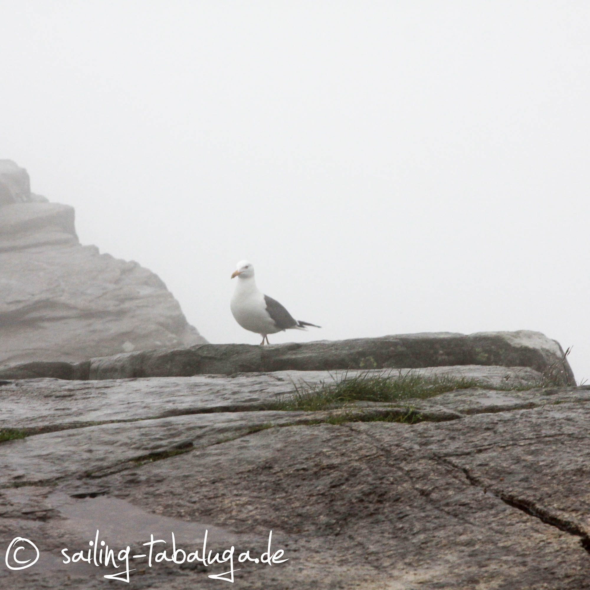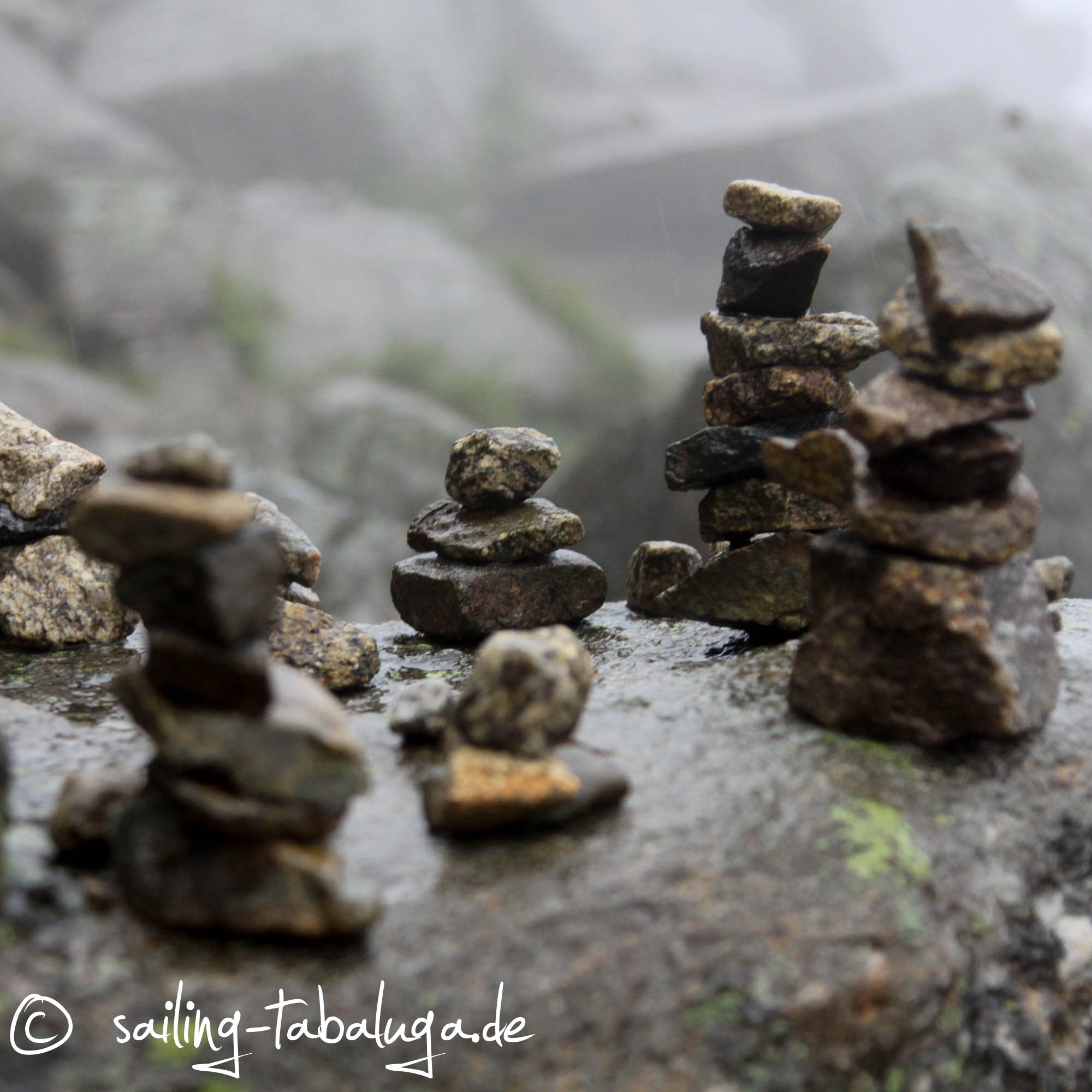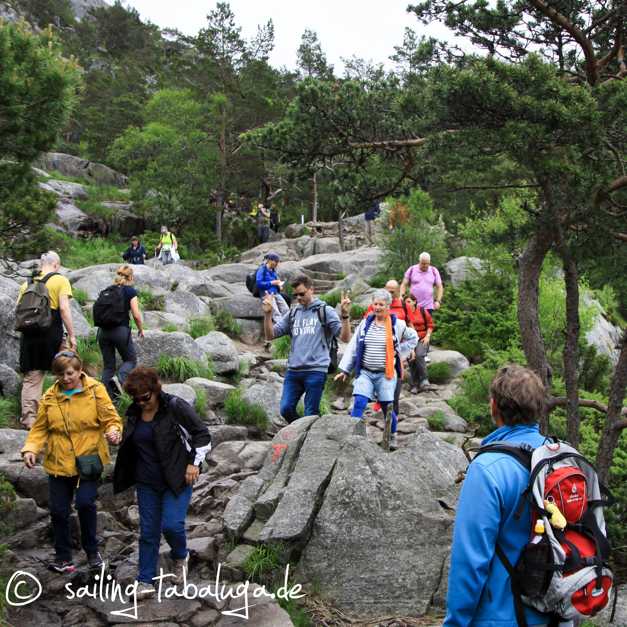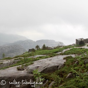 Nachdem wir die Menschenmengen hinter uns gelassen haben, kommt dann das nächste Problem. Der Regen. Nichts als Regen. Oben angekommen sehen wir genau: NICHTS. Kein Fjord, keine Felzkanzel, wir hängen mitten in den Wolken 😔. Wirklich schade, aber auf einen lichten Moment warten können wir auch nicht, es wird dann doch sehr schnell zu kalt. Der Rückweg geht zügig, aber man muss sich höllisch konzentrieren, um auf keinem nassen Stein auszurutschen. Unten angekommen sind wir nass bis auf die Haut, die Windstopperjacken haben nicht mehr gereicht. Wir schalten die Sitzheizung an, Klimaanlage auf 25 Grad und sind froh, nicht mit einem Bus fahren zu müssen. Bibbernd kaufen wir noch schnell was ein und dann ab aufs Boot, in die warmen Wollsocken.