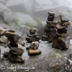 Erstmal kommen aber Touristen. Viele Touristen! Um genau zu sein: 978 kommen uns vom Berg entgegen. Ja, ihr lest richtig, meine Mathegenie hat mitgezählt 😉! Ich schätze, ca. 90% davon Italiener vom Kreuzfahrtschiff. In teilweise haarsträubender Ausrüstung und vor allem körperlicher Verfassung. Der Weg geht gerade am Anfang recht steil bergan, man geht von Stein zu Stein, es ist anstrengend auch mit guter Kondition und den richtigen (Wander-!)Schuhen. Zum Glück sind wir recht spät, so dass die meisten Menschen schon bald an uns vorbei sind, sie müssen ja schließlich pünktlich zum Essen wieder auf dem Schiff sein. Wirklich amüsiert habe ich mich allerdings über die Guides, die ihre typischen Schilder hoch hielten. Wo bitte sollen denn die Leute hin, es gibt nur einen Weg….?