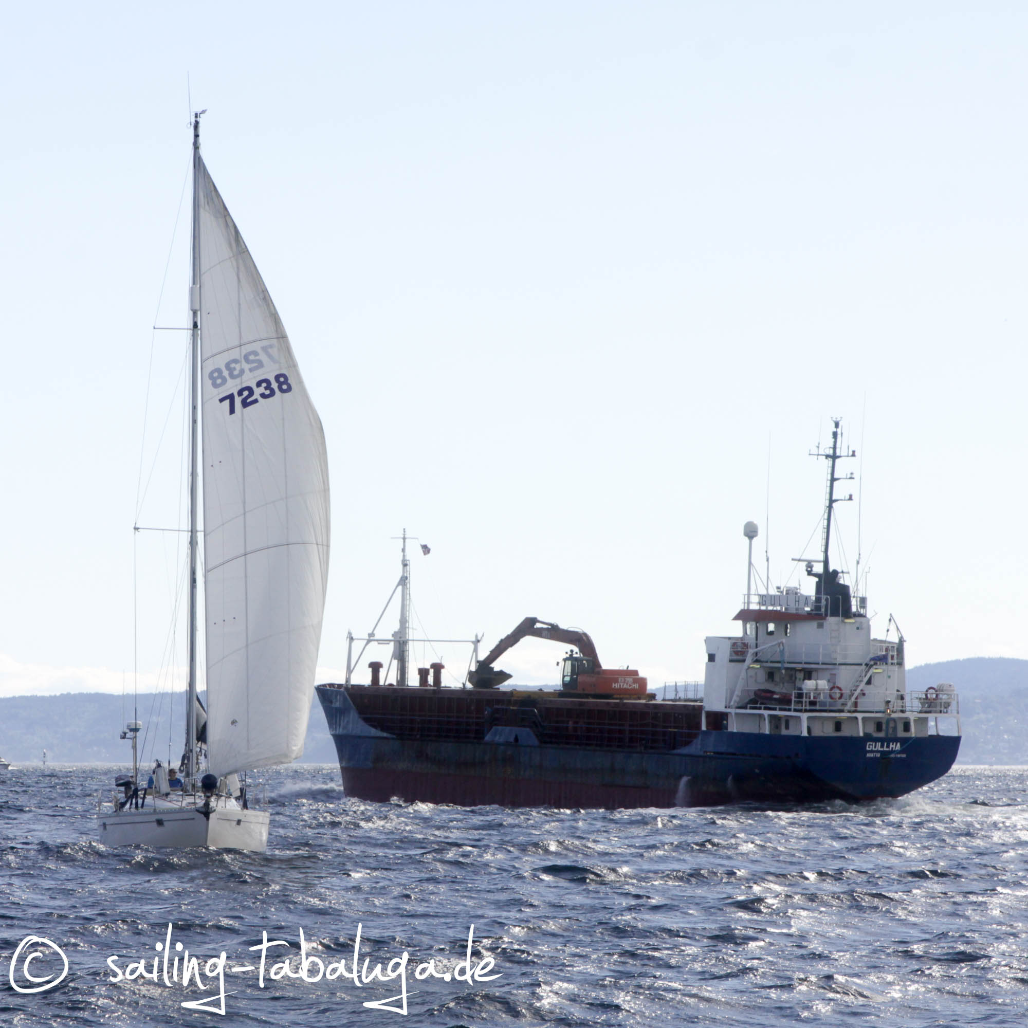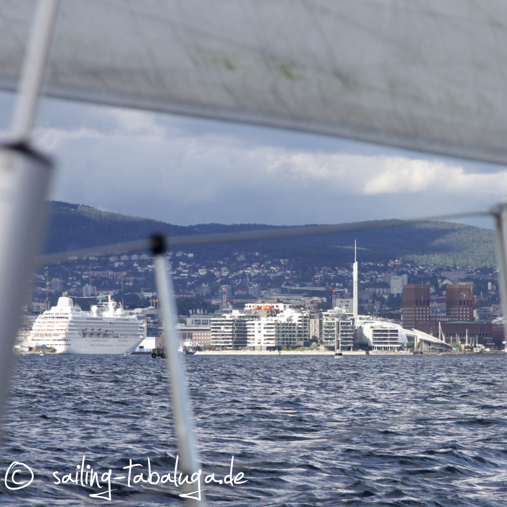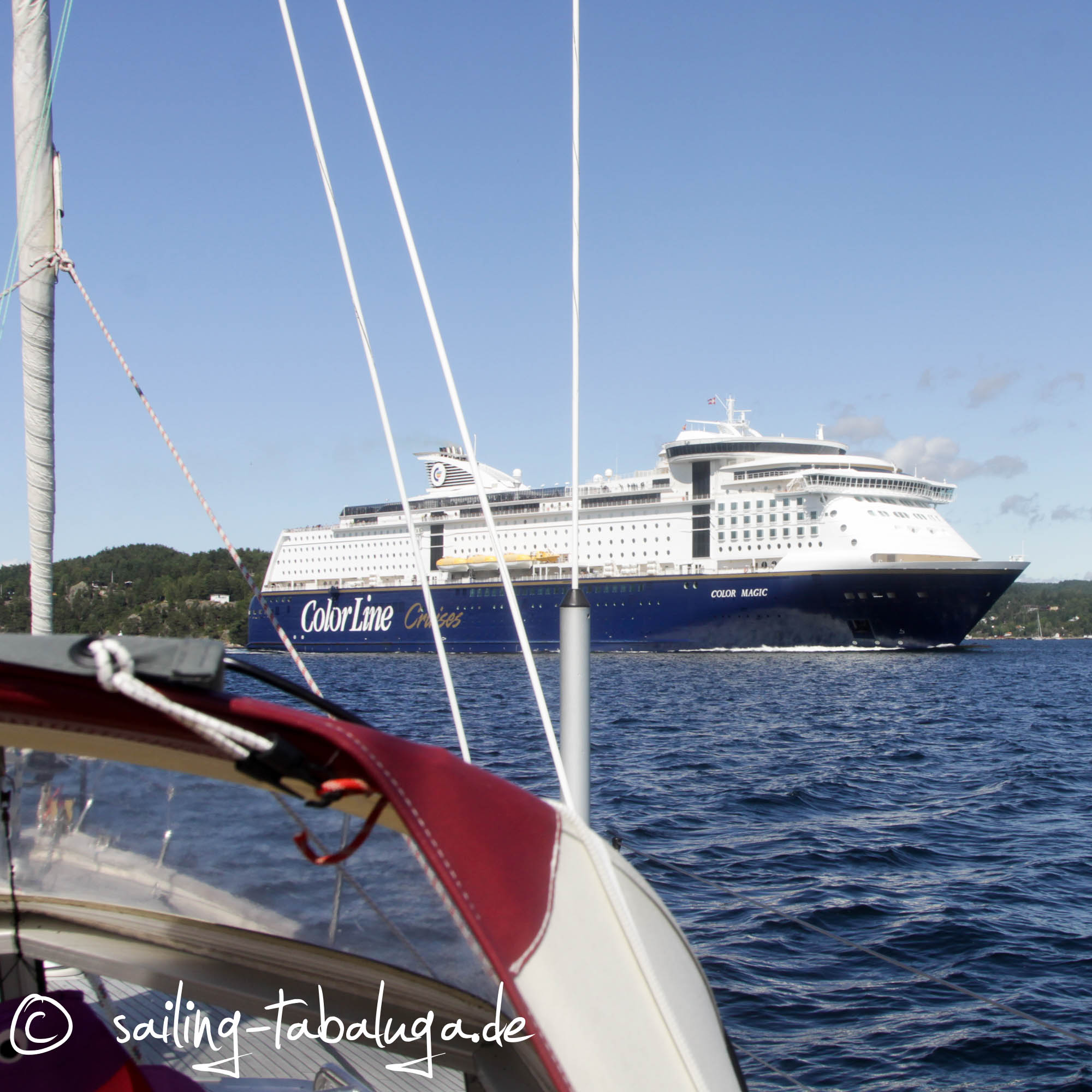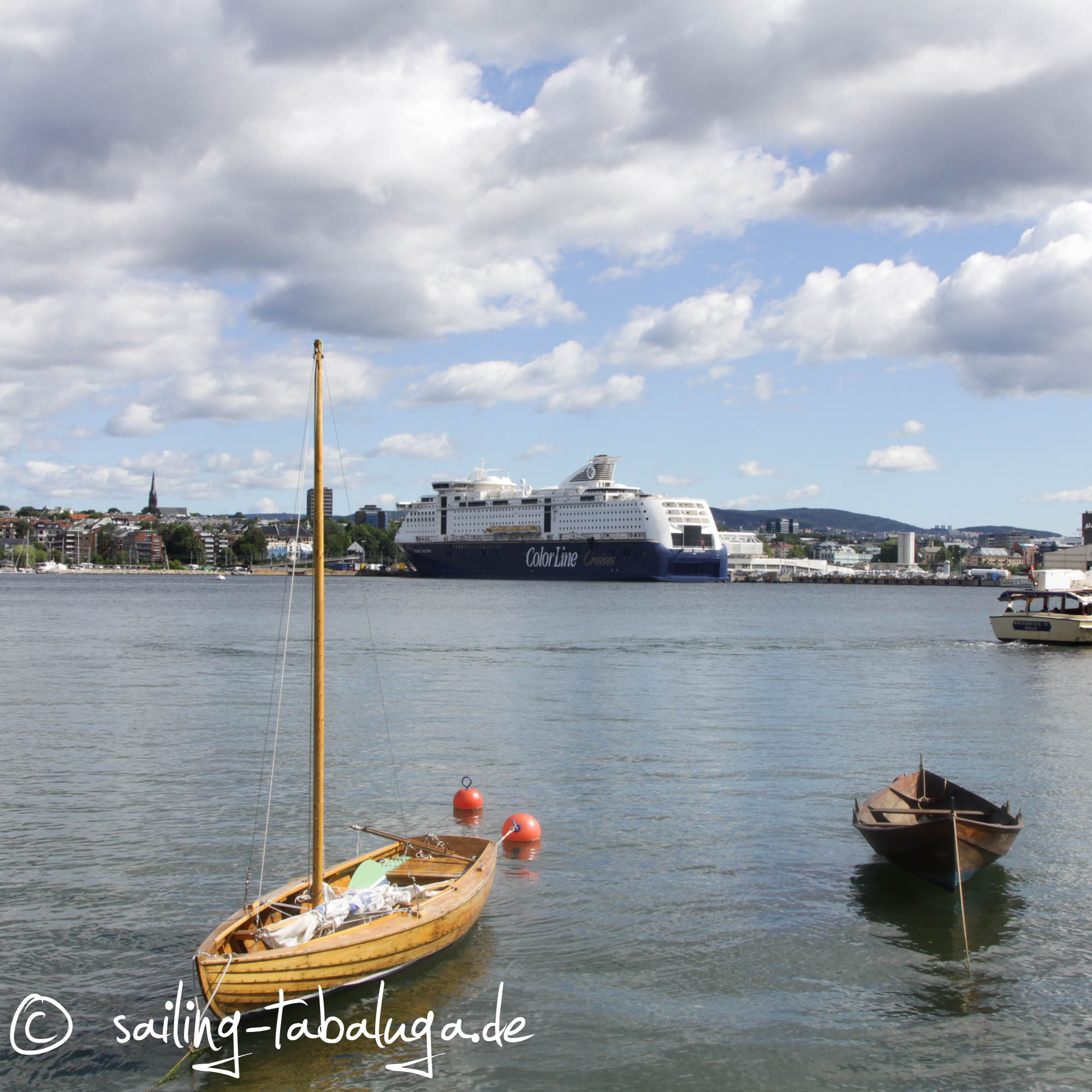 Heute läuft es! Anfangs noch ruhig, hinterher mit 20kn vorm Wind, Tabaluga flitzt mit 8kn durchs Wasser und Schlauchi surft regelrecht hinterher. Wir rauschen bei herrlichem Sonnenschein durch den Oslofjord gleich durch bis Oscarsborg, der Festungsinsel, von der aus im zweiten Weltkrieg ein deutsches Kriegsschiff versenkt wurde. Kurz bevor wir im Hafen sind, kommt uns auf der anderen Seite der Insel die Color Fantasy entgegen, sie kämpft nicht so sehr gegen die Wellen wie so mancher Segler.