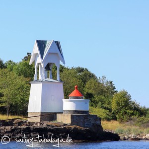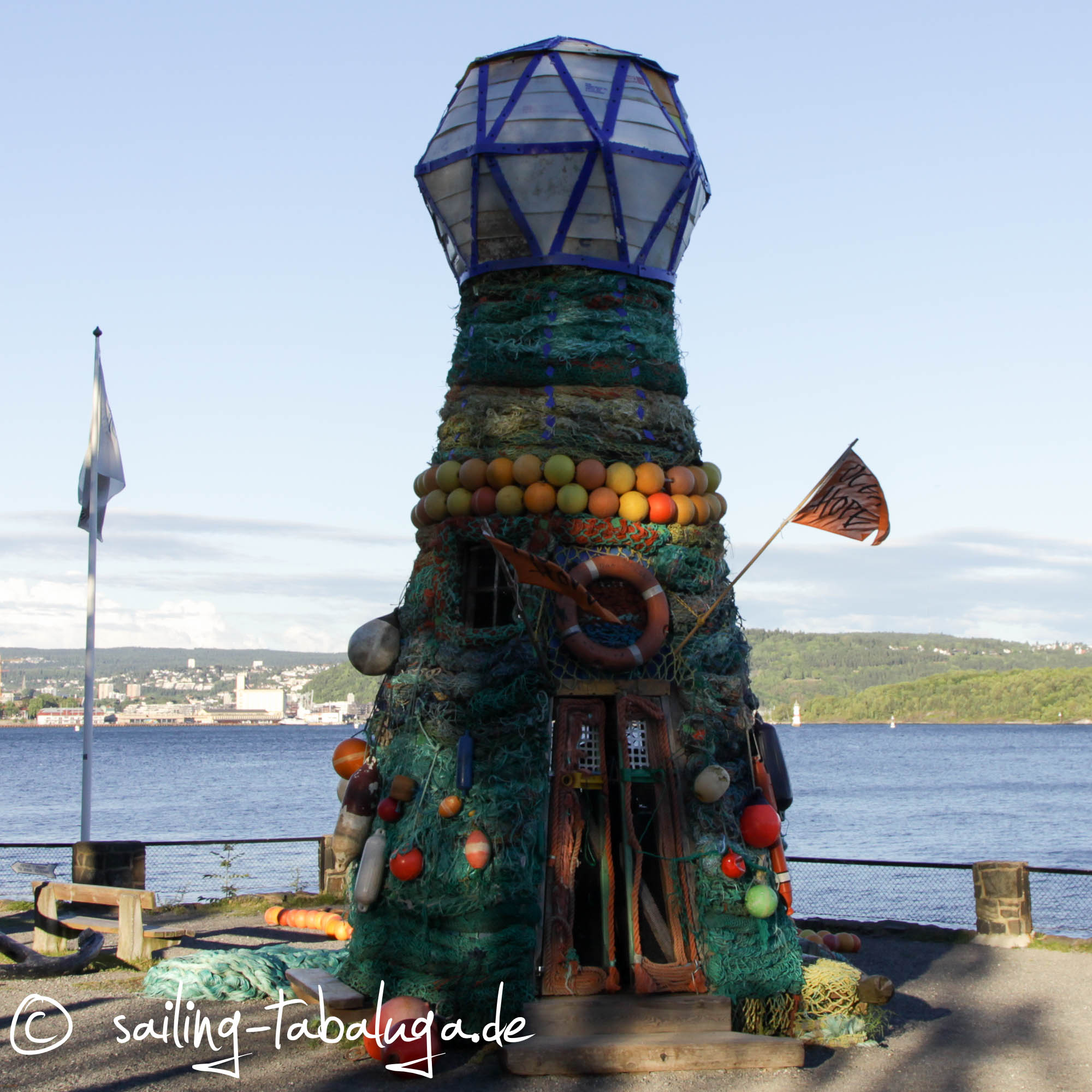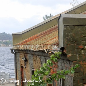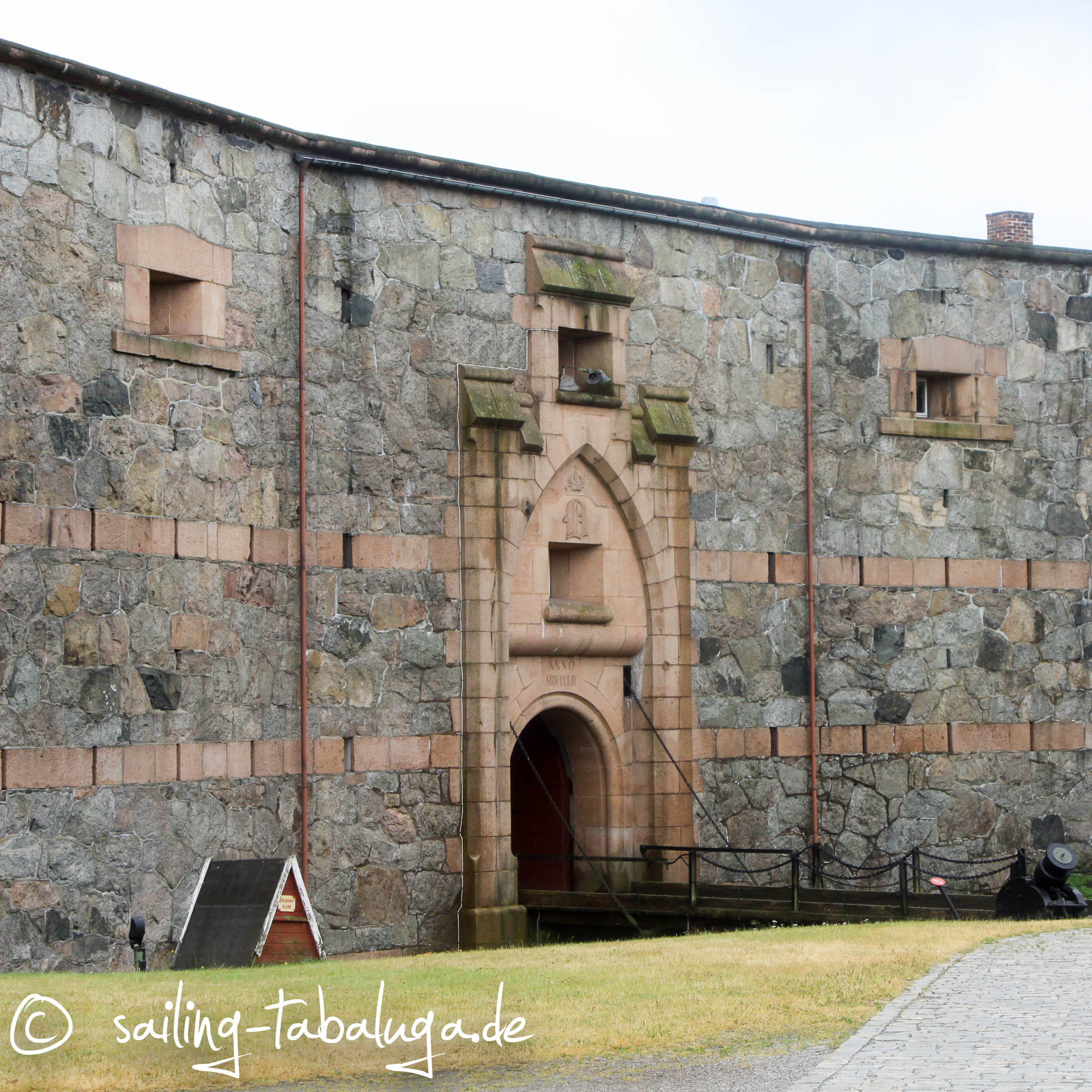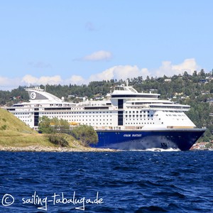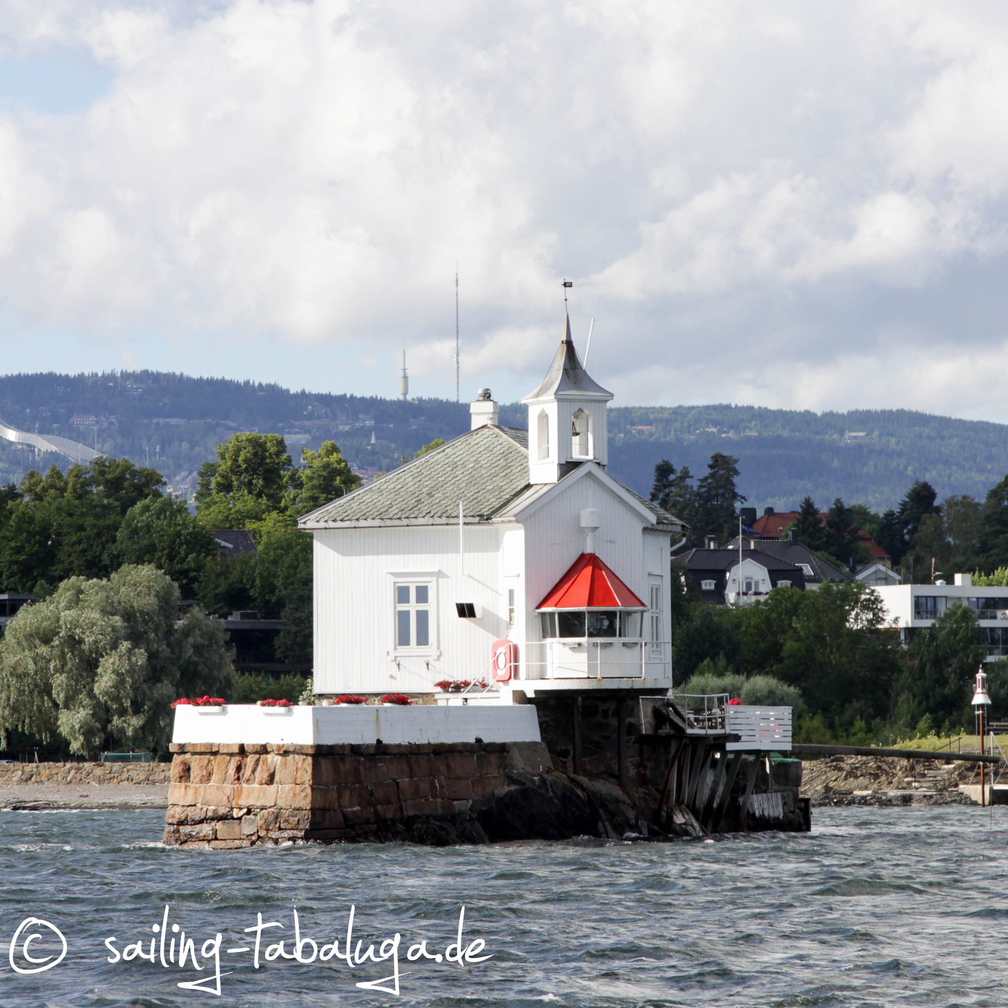 Heute läuft es! Anfangs noch ruhig, hinterher mit 20kn vorm Wind, Tabaluga flitzt mit 8kn durchs Wasser und Schlauchi surft regelrecht hinterher. Wir rauschen bei herrlichem Sonnenschein durch den Oslofjord gleich durch bis Oscarsborg, der Festungsinsel, von der aus im zweiten Weltkrieg ein deutsches Kriegsschiff versenkt wurde. Kurz bevor wir im Hafen sind, kommt uns auf der anderen Seite der Insel die Color Fantasy entgegen, sie kämpft nicht so sehr gegen die Wellen wie so mancher Segler.