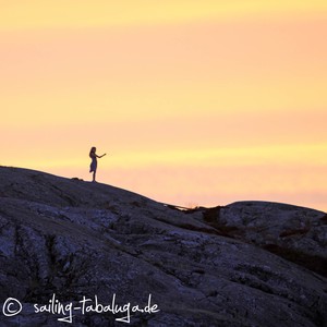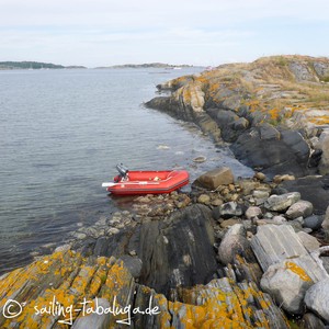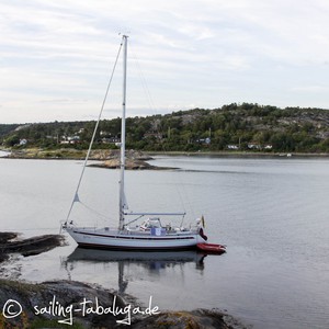Der Wind frischt auf, wir sehen zu, dass wir zur Tabaluga zurück kommen. Durch den Wind von der Seite liegt sie auf einmal bedenklich nah am Felsen, so dass wir schleunigst die Biege machen. Die Leinen müssen erstmal an Land bleiben, wir machen sie los, der Wind ist so stark, wir treiben seitlich weg. Bernd holt die Leinen und Haken mit Schlauchi, als wir sicher im Wind liegen. Ganz schön spannend immer noch, die Sache mit den Felshaken und den Leinen. Aber die Schweden und Norweger praktizieren es alle so, wir werden den Dreh auch irgendwann raushaben!