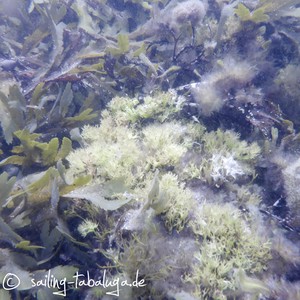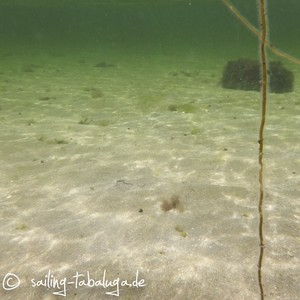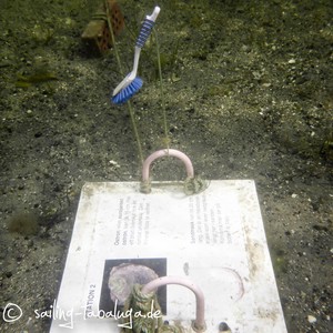 Wir sehen Bojen, auf denen vor Tauchern gewarnt wird, hier muss es sein. Und es ist wirklich süß gemacht. Unter Wasser finden wir verschiedene Stationen, Platten mit Beschreibungen, die mit Seilen verbunden sind. Damit man auch lesen kann, was drauf steht, hängt an jeder Platte eine Spülbürste zum Abschrubben 😀! Leider ist es nur in Schwedisch geschrieben, wie alles hier auf der Insel, aber die Idee ist wirklich nett.