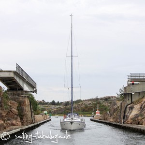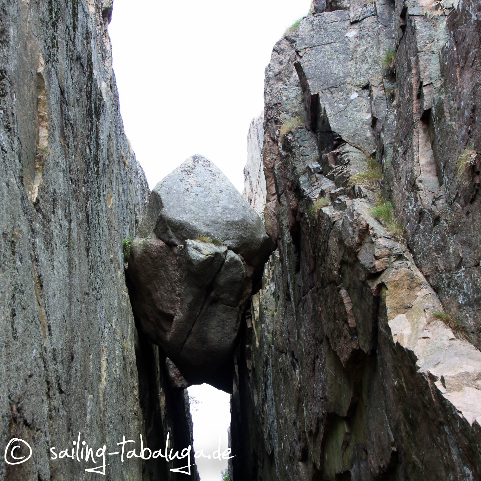 Nach dem kleinen Rundgang fahren wir weiter und begeben uns durch den nächsten Engpass, den Sotekanalen. Dieser Kanal wurde in den 1930ern von Menschenhand aus dem Fels gesprengt, um es Schiffen zu ermöglichen, die gefährlichen Stellen rund um die Halbinsel Sotenäs zu umgehen. Außerdem wurde dadurch eine zu der Zeit herrschende hohe Arbeitslosigkeit bekämpft.