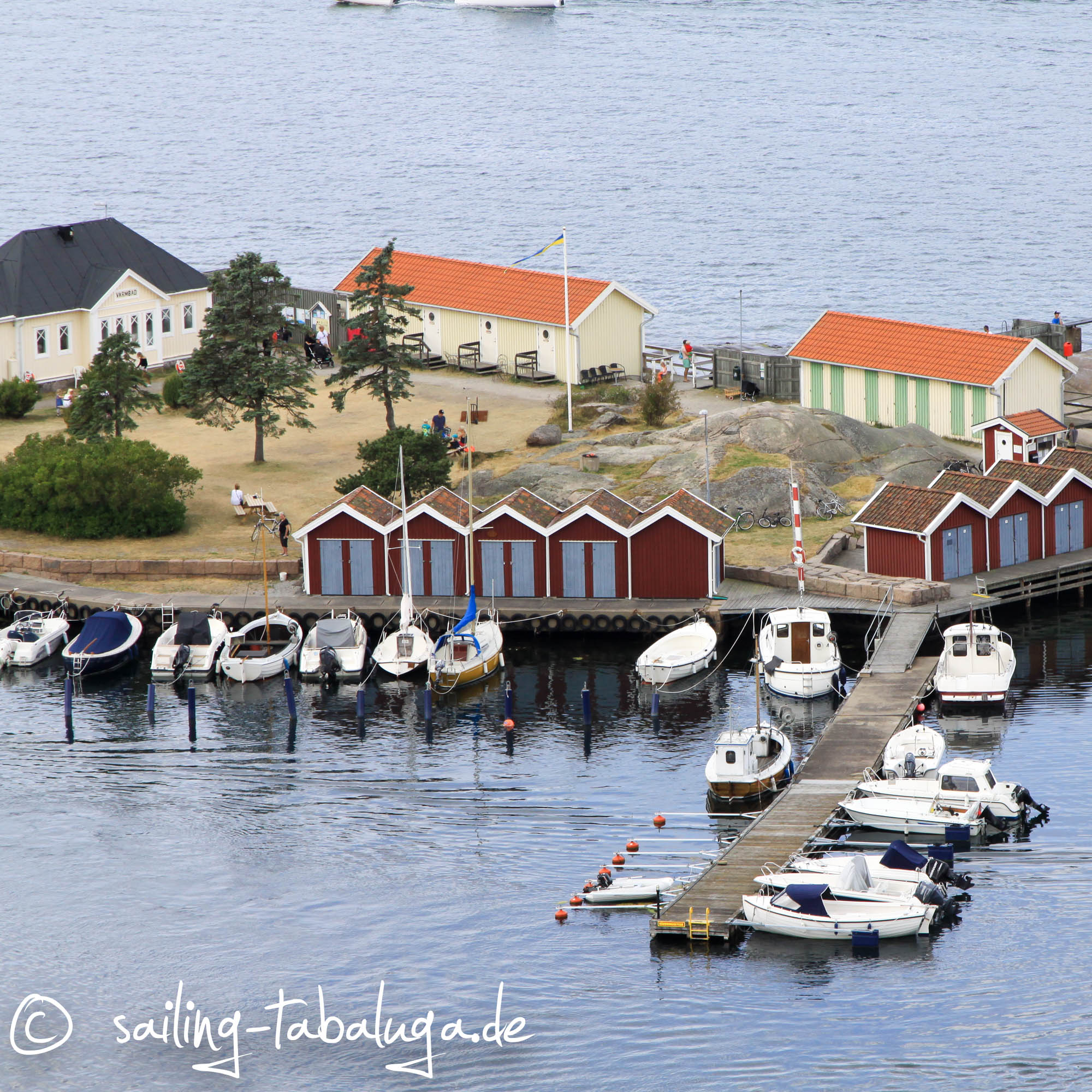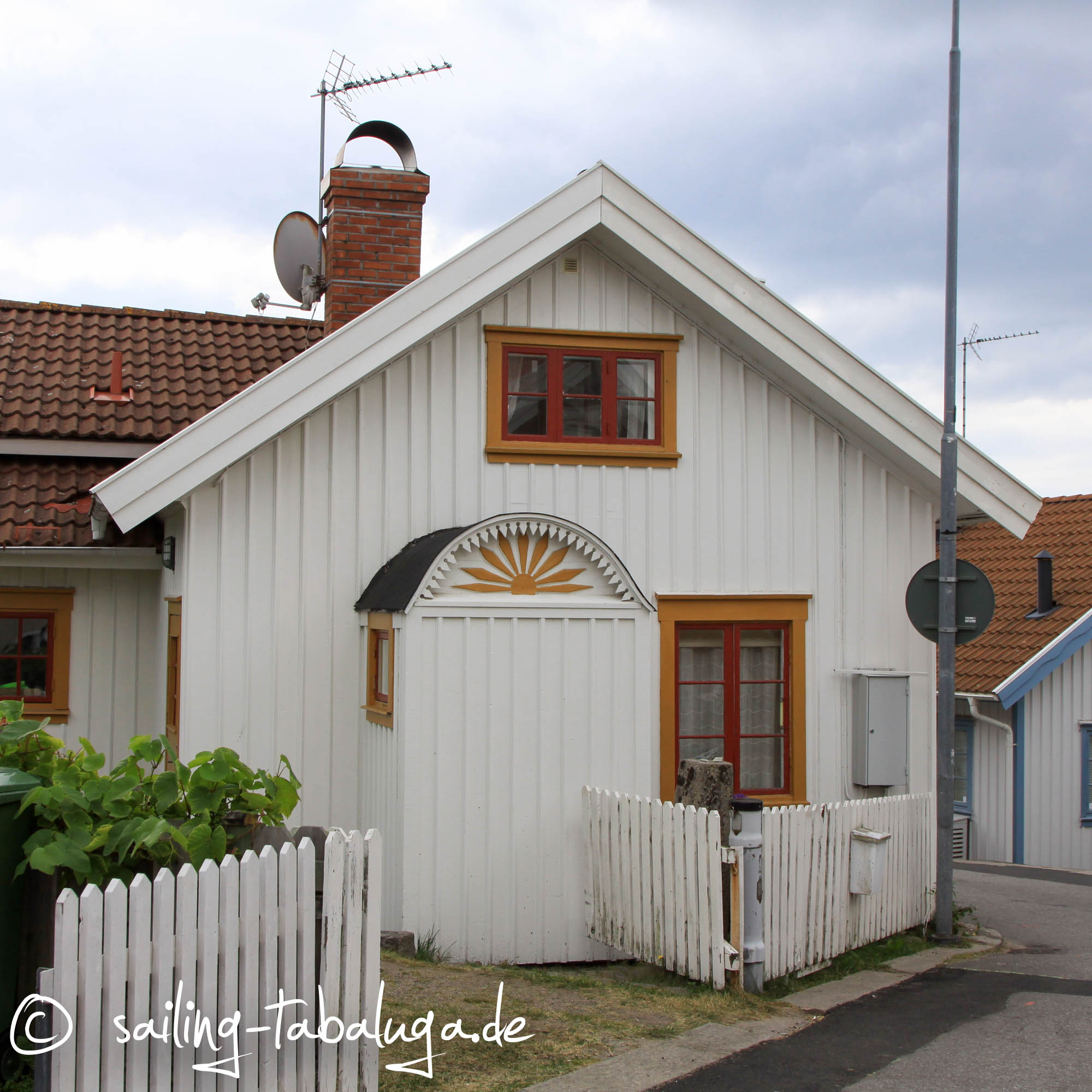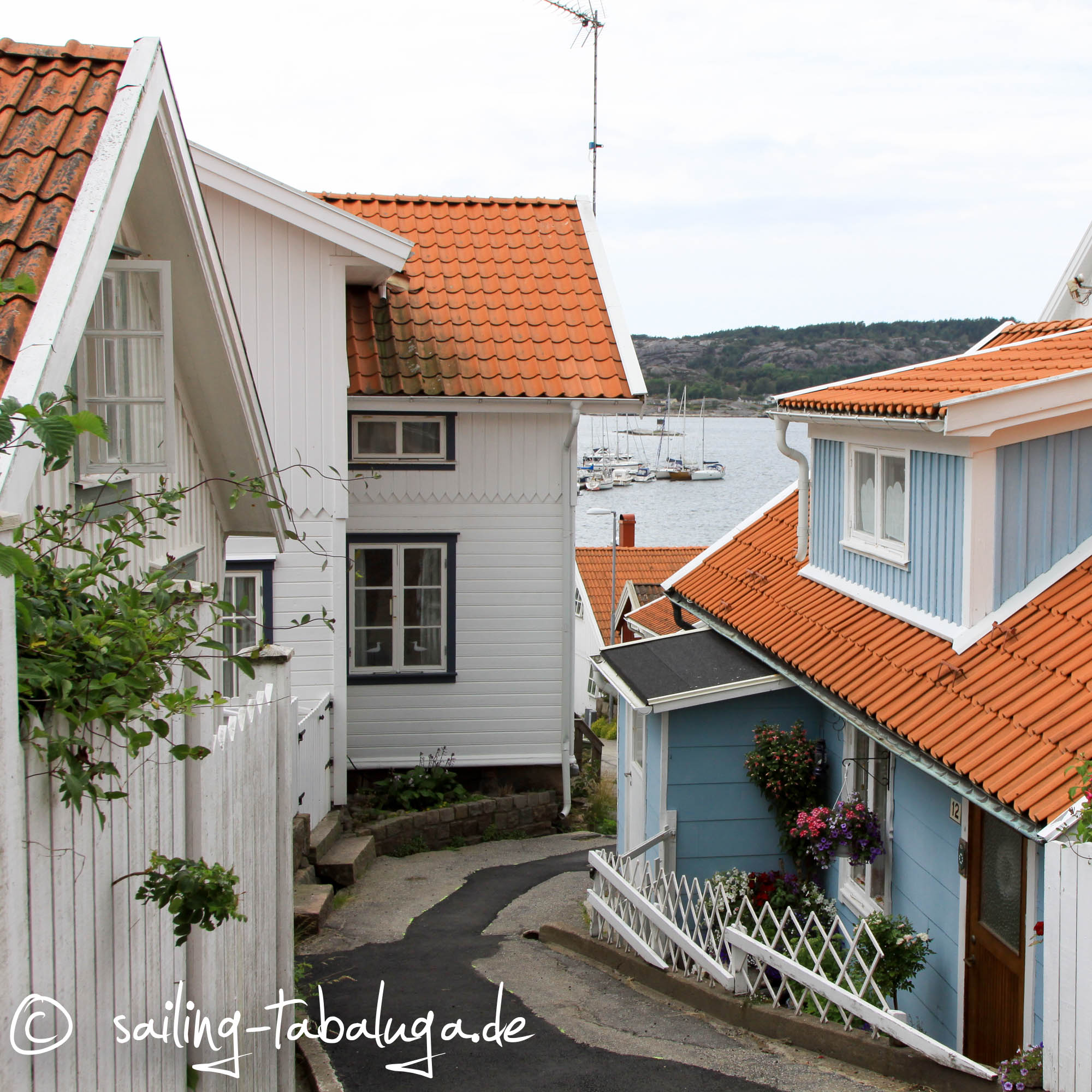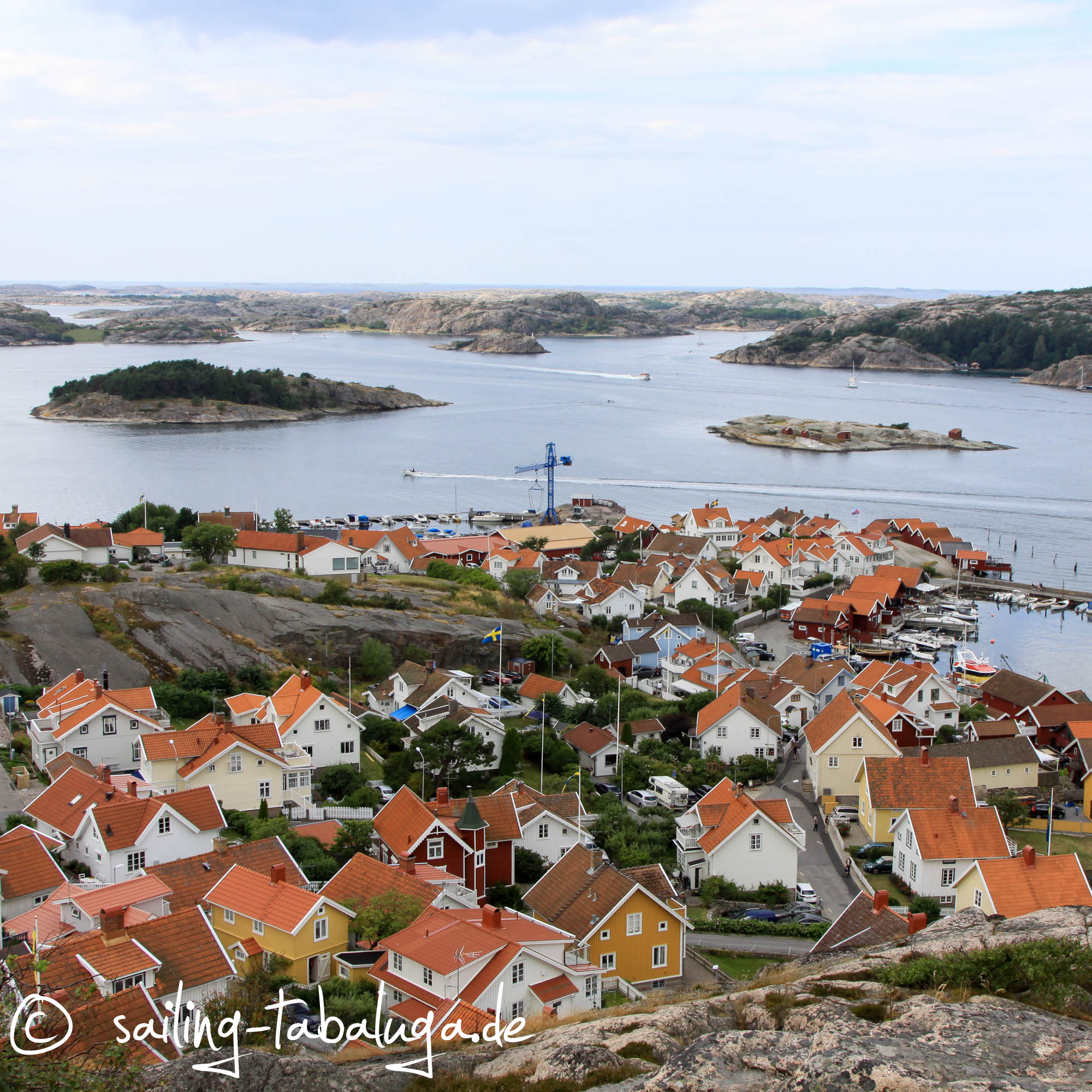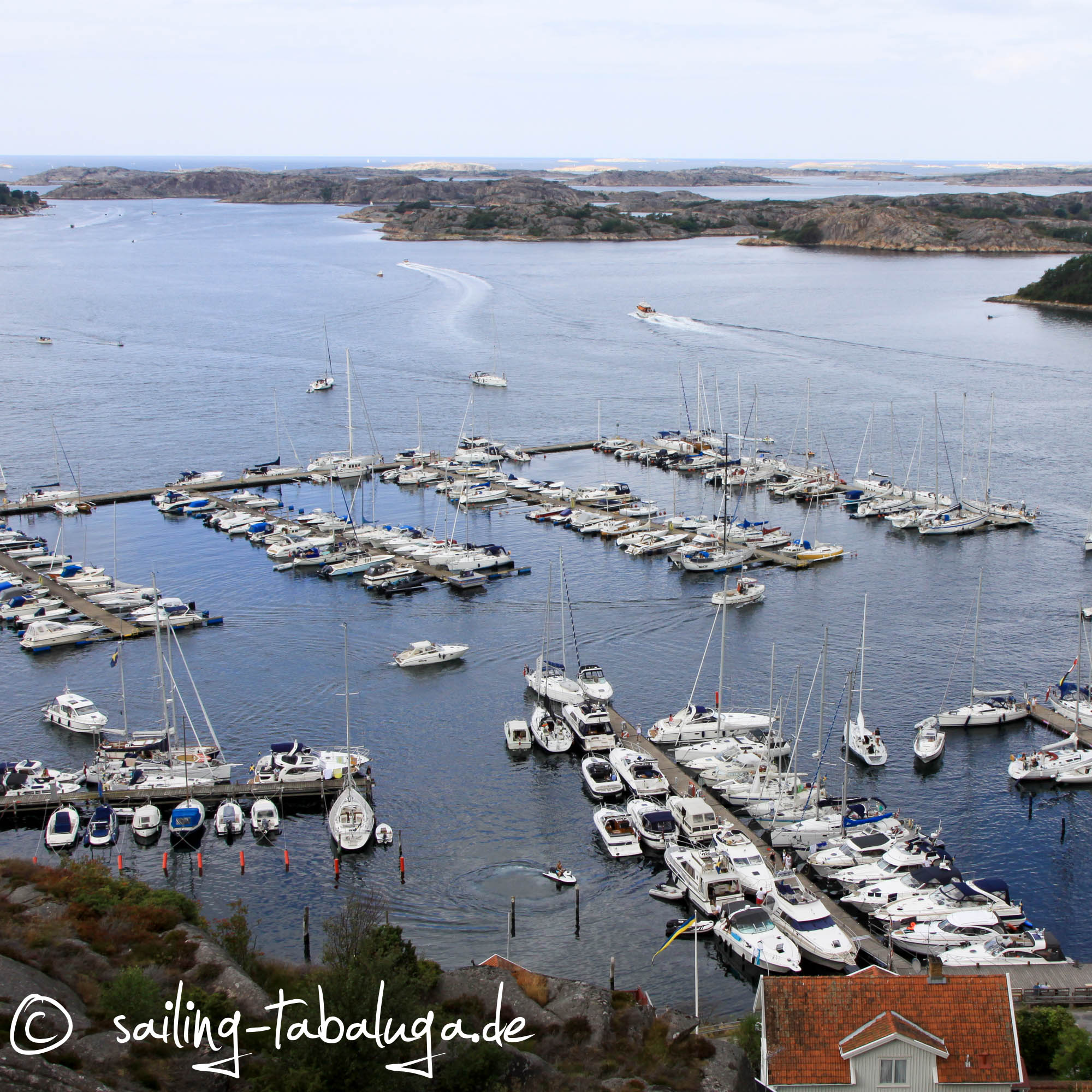 In Fjällbacka sehen wir, dass gerade zwei Yachten von einem recht komfortabel aussehenden Steg ablegen. Wir nutzen die Chance und sind schwupps an deren Platz. Es dauert keine fünf Minuten, da kommt der Hafenmeister und fragt, ob wir über Nacht bleiben. Wir: Äh… keine Ahnung, sind doch gerade erst angekommen… (und es ist noch vorm Frühstück). Er: Das geht nicht, das müsst ihr jetzt entscheiden. Sonst nehmt ihr ja jemandem den Übernachtungsplatz weg. Wir: Äh… (immer noch vorm Frühstück). Er: Und außerdem kostet es 700 Kronen, das hier ist ein privater Hafen! Wir: Ok, wir fahren!! Immerhin dürfen wir noch umsonst Wasser tanken - ich hab mal den Dackelblick aufgesetzt 😇.