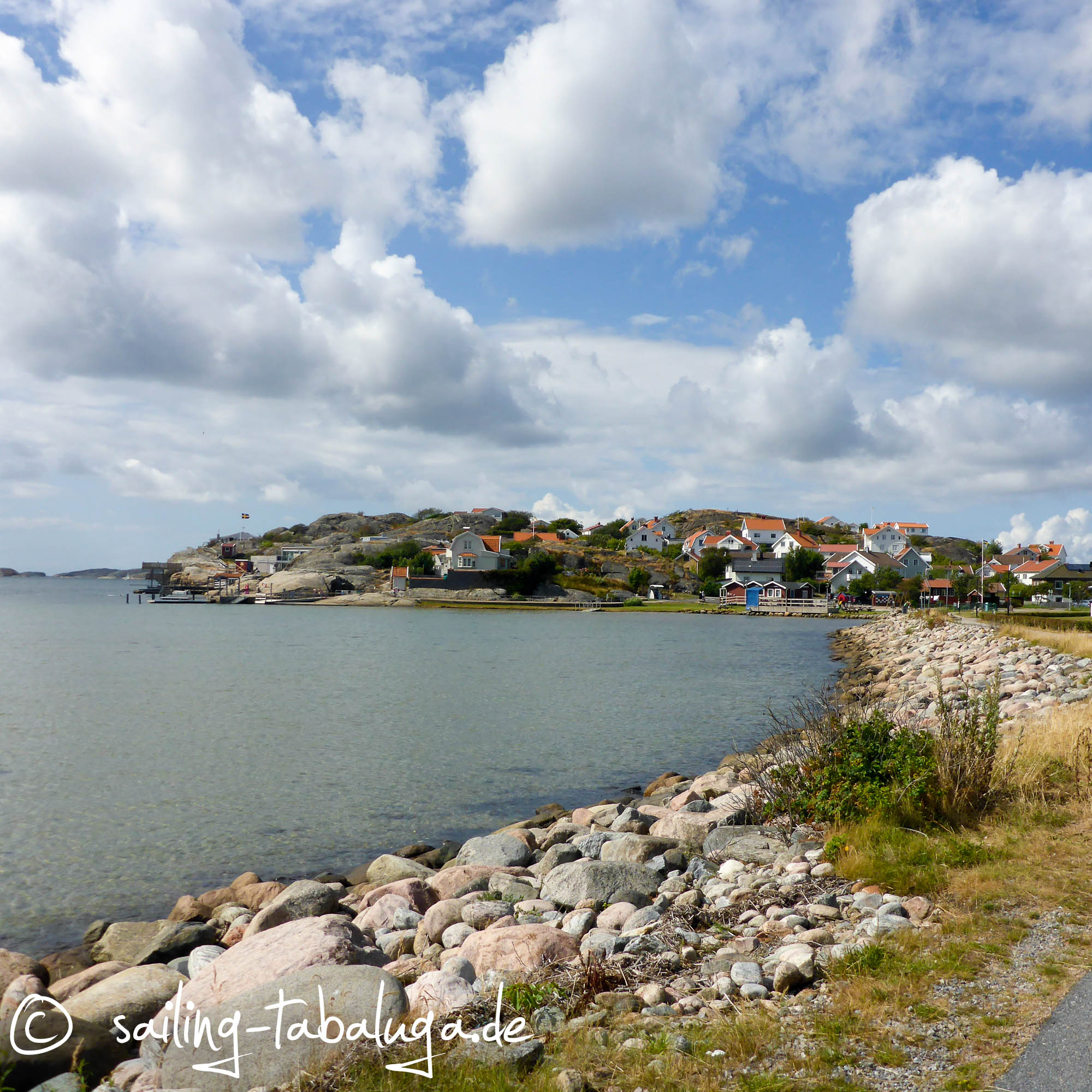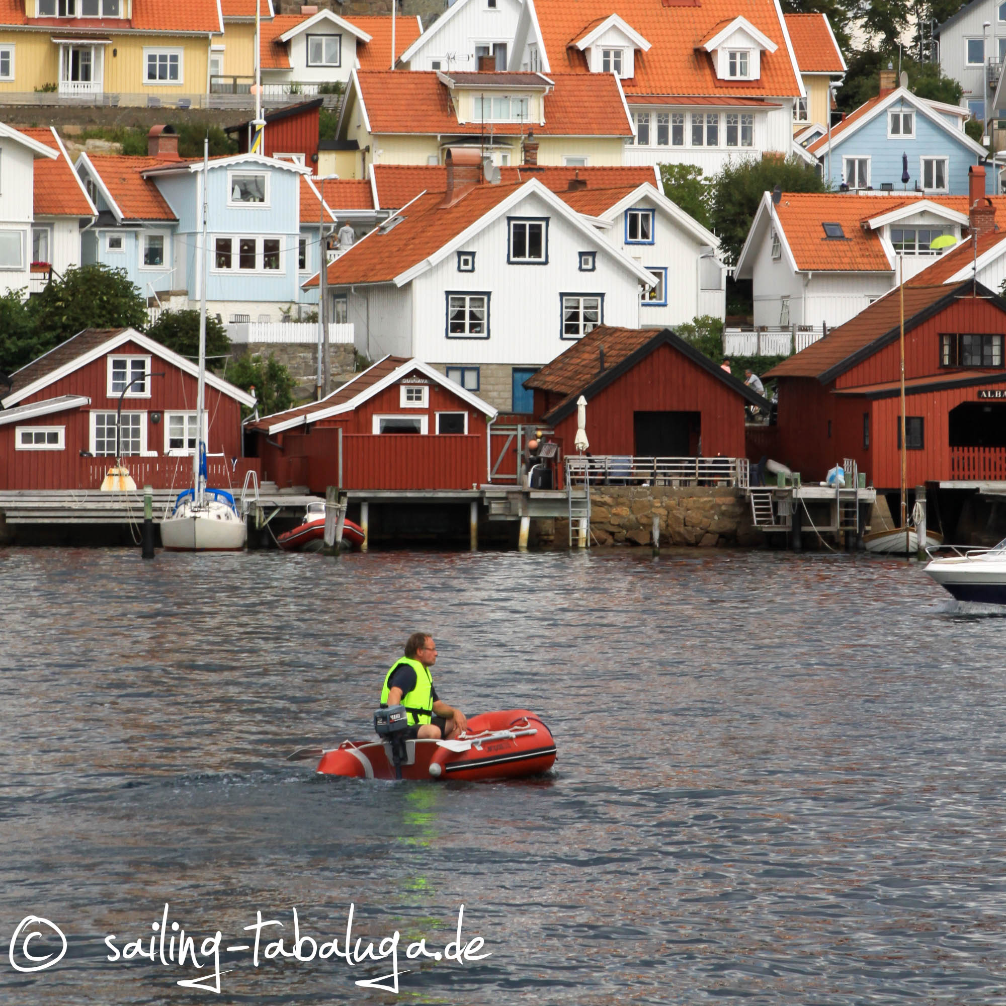 Am Morgen weckt Bernd mich mit den Worten: “Ich glaube, wir müssen los…” Der Wind ist wieder so stark, dass der Anker nicht so gut hält und wir immer näher an die am Fels festgemachten Boote kommen. Nach den Erlebnissen gestern ist mir jetzt nicht mehr nach “umparken”, sondern ab Richtung Fjällbacka. Ohne Frühstück machen wir uns auf den Weg, ein Oreo muss als Energiespender erstmal ausreichen. Die Fahrt ist ruhig, aber wir sind traurig, dass wir gestern abend die Insel nicht mehr betreten haben. Was du heute kannst besorgen….