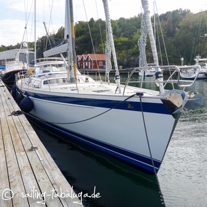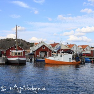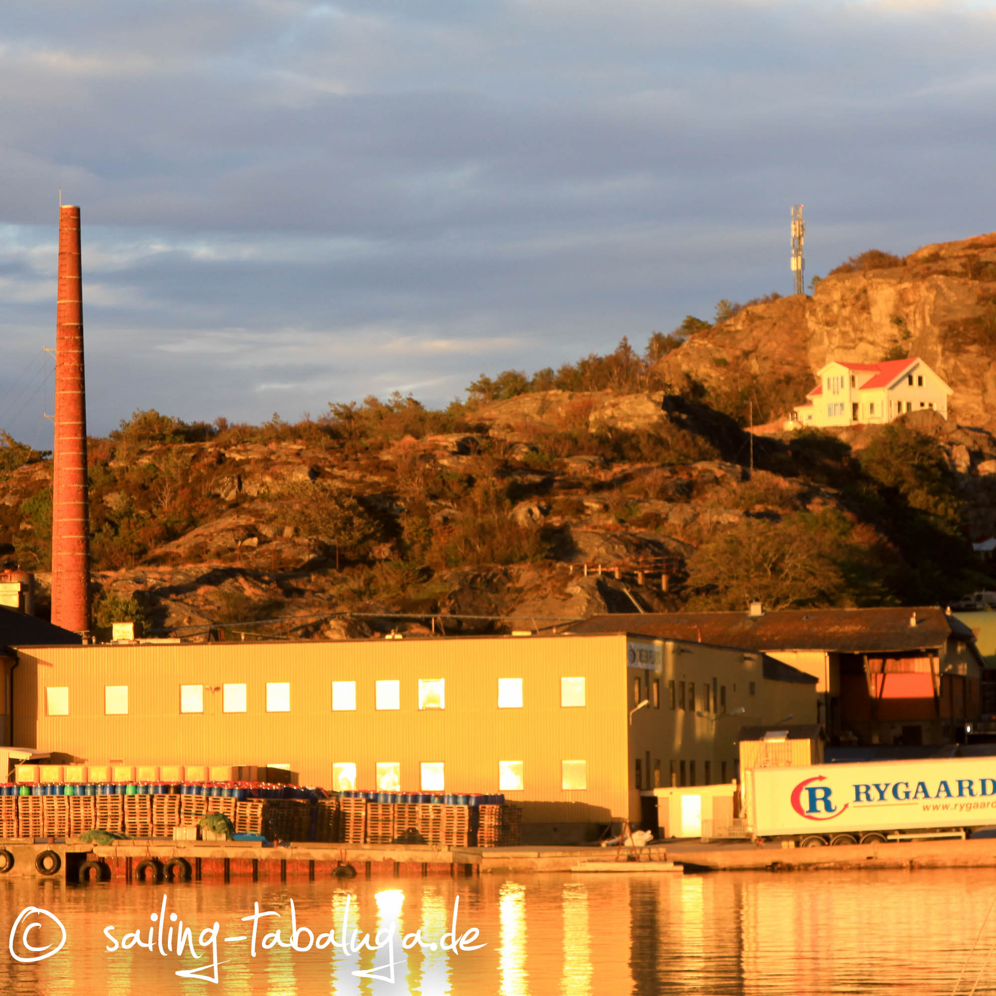 Heute segeln wir zunächst nach Ellös, Sitz von Hallberg-Rassy. Wir finden zwar das Werksgelände geöffnet und auch ein paar schicke neue Yachten im Hafen vor. Aber wie befürchtet ist niemand ist da, alle Werkshallen sind geschlossen. Der Ort wirkt gegenüber Fjällbacka wie ausgestorben, eine große Fischfabrik und die Werft ist dort, nur wenige Touristen zieht es hier her. Vermutlich machen die Mitarbeiter dieser Betriebe gerade Urlaub in Fjällbacka 😉.