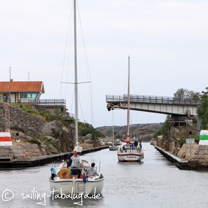 Wir sind uns erst gar nicht sicher, ob wir überhaupt hindurch fahren können, beide elektronischen Seekarten zeigen eine “Fixed Bridge” mit Durchfahrtshöhe von 7,10 an. Das reicht nicht. In der Papierkarte steht allerdings, dass es eine Drehbrücke ist und man mit Tonsignalen um Öffnung bitten kann. Na also. Wir hängen uns an einen anderen Segler mit schwedischer Flagge, der wird es schon wissen.