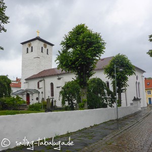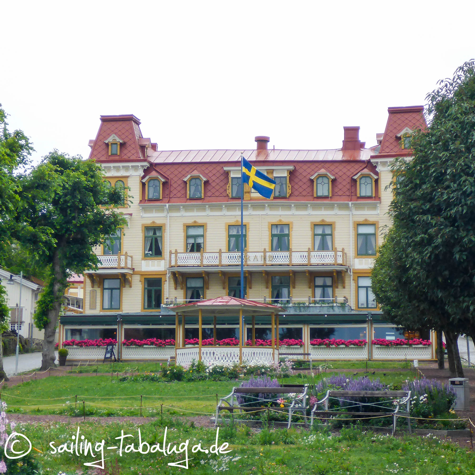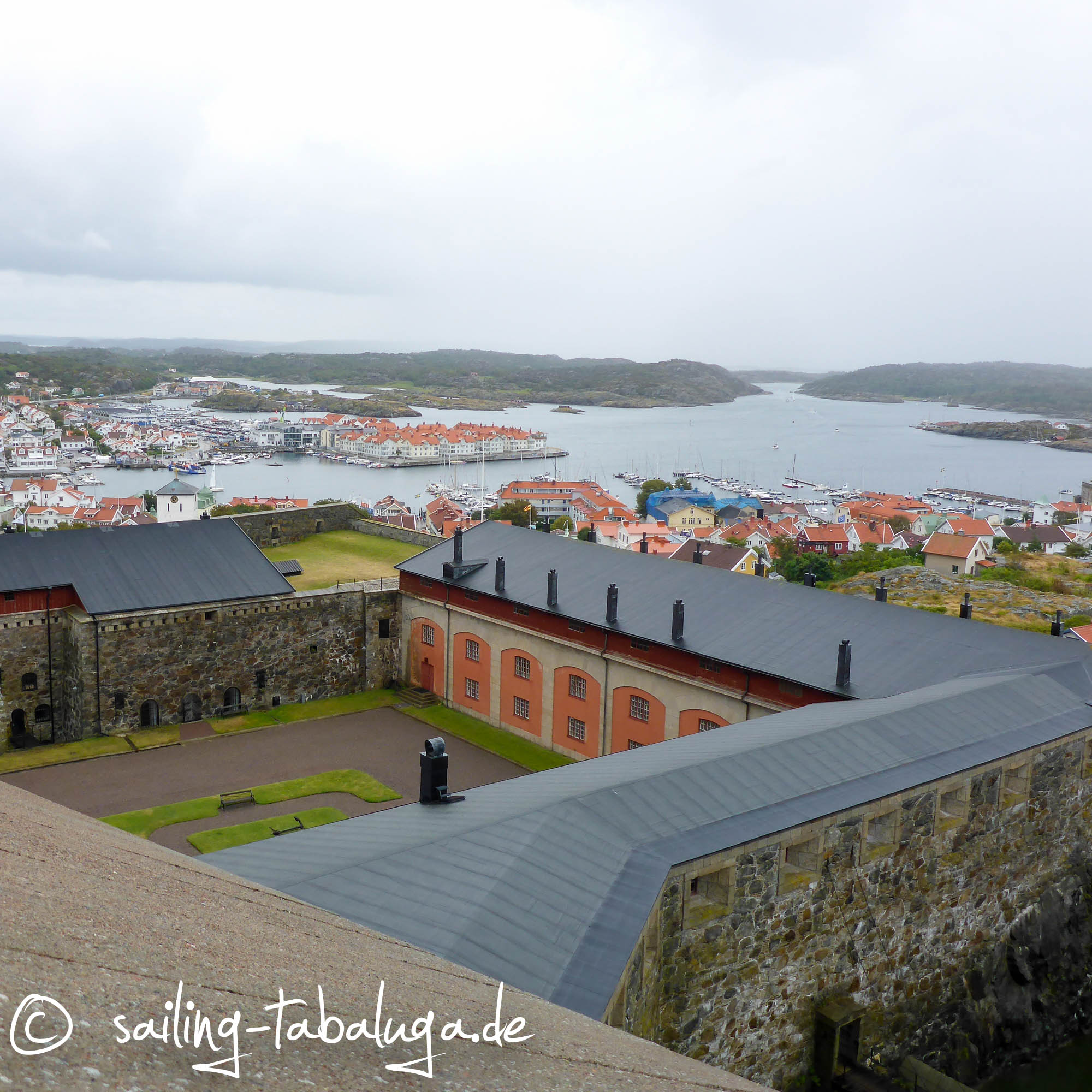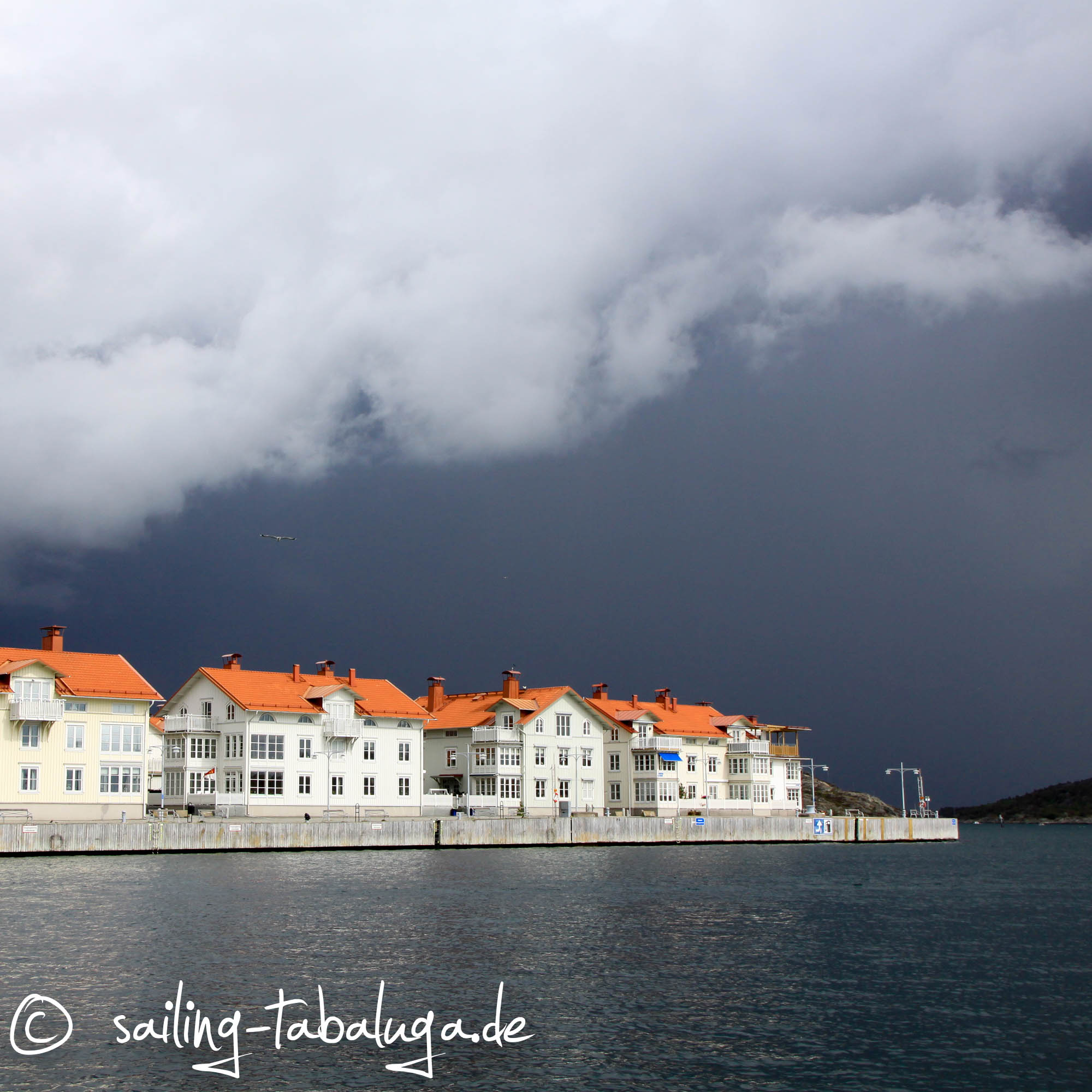 In Marstrand angekommen sehen wir den Gästepier, suchen einen Platz und legen schnell an. Für uns ist keine Mooring-Leine (eine unter Wasser im Grund befestigte Leine) übrig, also hängen wir uns an die Boote rechts und links. Diese sind jeweils nach hinten gesichert, so dass auch wir fest sind. Der Wind kommt aber von vorne, das dürfte kein Problem sein.