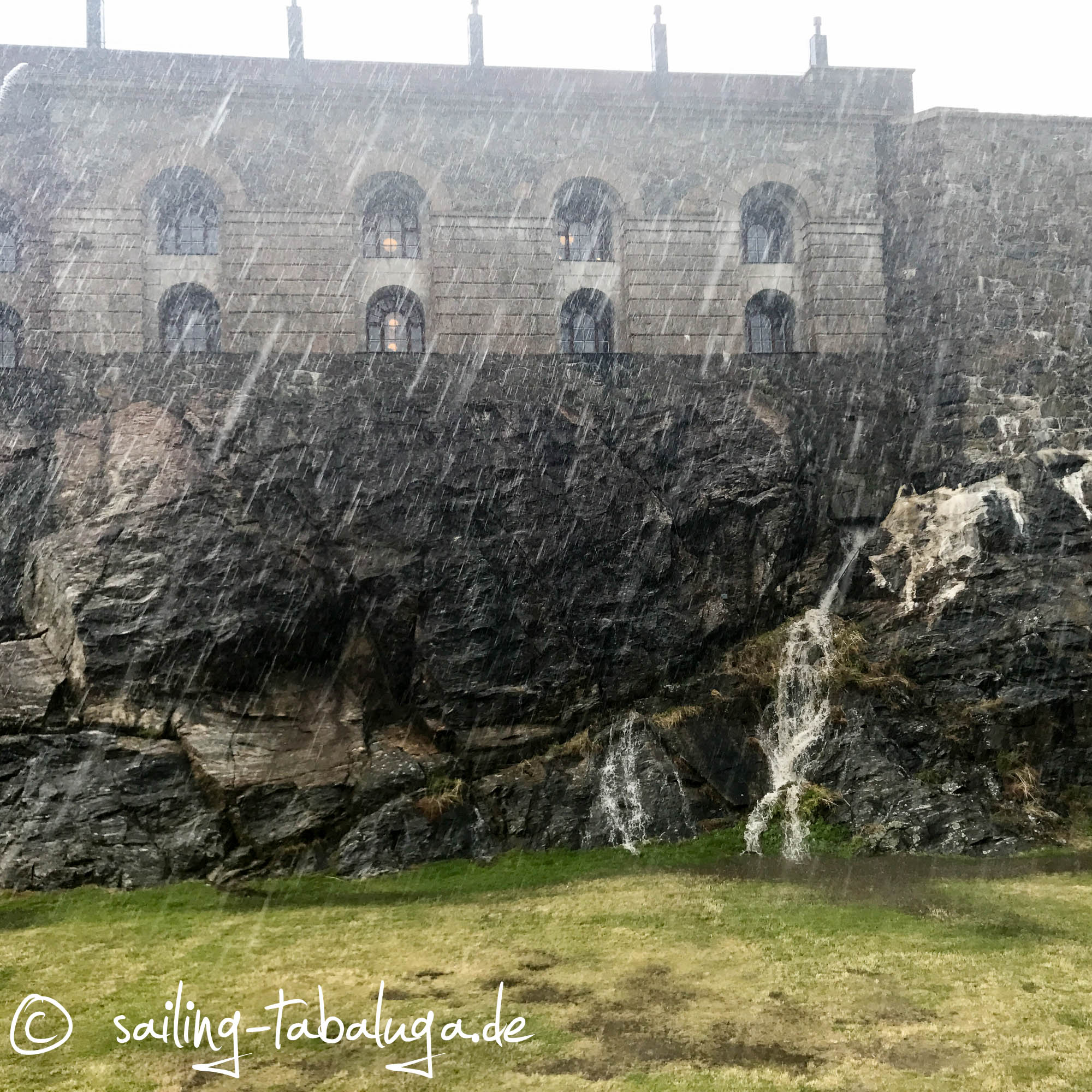 Nach dem Anlegerbier schnappen wir uns Wanderschuhe und Kamera und machen uns auf Richtung Festung. Diese liegt imposant oberhalb des Ortes. Wir sehen zwar schon, dass Regenwolken im Anmarsch sind, gehen aber davon aus, dass sie vorbei ziehen. Optimisten 😀! Als wir uns der Festung nähern, nähern sich auch die Wolken. Und zwar schnell! Die ersten Tropfen fallen, wir laufen und wollen uns unterstellen. Aber: das ist eine Festung. Die wurde vor Jahrhunderten so gebaut, dass kein Feind jemals da rein kann. Und heute kein Wanderer auf dem Schutz vor Regen! Wir stehen vor meterhohen, glatten Felswänden und der Regen wird intensiver. Donner grollt, Blitze sind in der Ferne zu sehen. Uns bleibt nichts anderes übrig, als in einem Gebüsch, was ein bisschen über den Weg hinaus ragt, Schutz zu suchen. Und sind logischerweise irgendwann durch und durch nass bis auf die Haut. Ich versuche, meine Kamera unter meinem Sweatshirt zu schützen, was natürlich nur ein halbherziger Versuch ist… Dennoch, wir lachen uns schlapp und haben Spaß wie Kinder mit den eh schon durchweichten Schuhen in die Pfützen zu springen. Apropos: GoreTex Schuhe sind super! Wenn das Wasser von oben rein läuft, kommt es garantiert nicht mehr heraus 😂…
