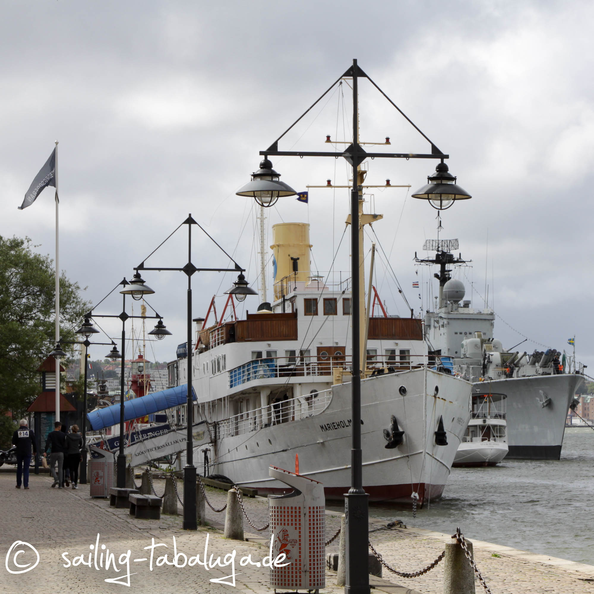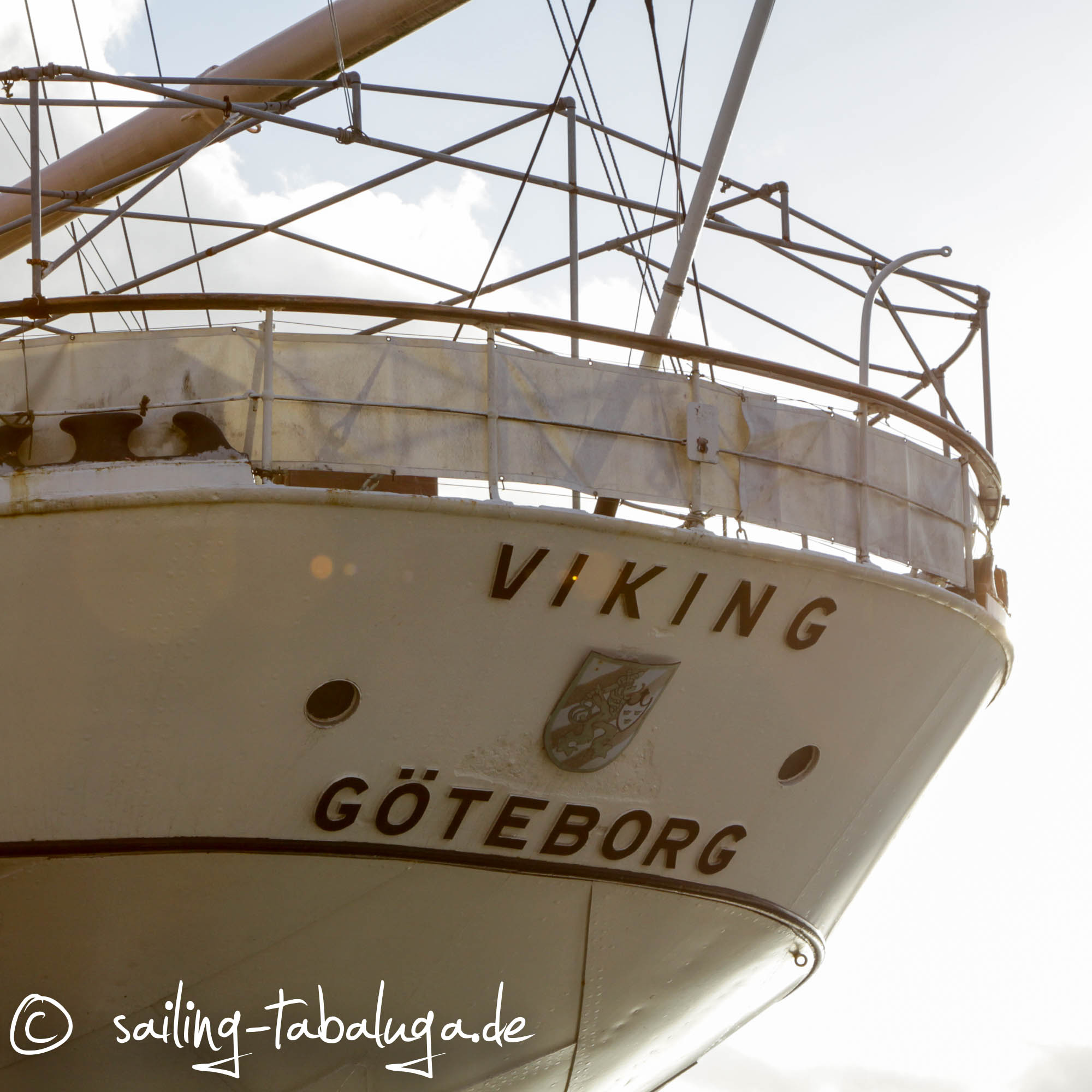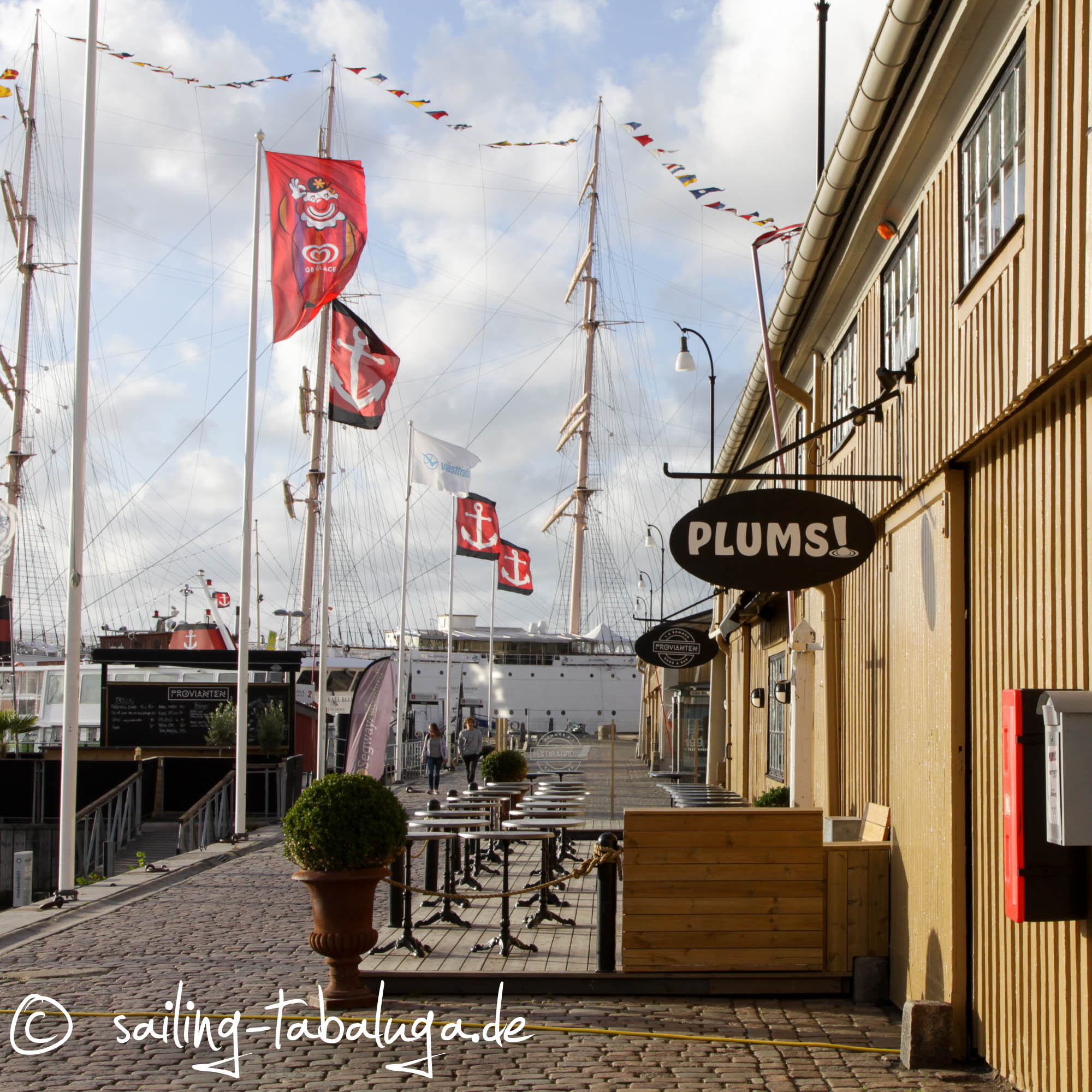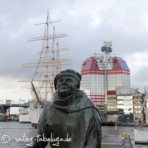 Abends schlendern wir noch durch Lilla Bommen. Eigentlich hätten wir gerne noch die Viking, ein ehemaliges Segelschulschiff, besucht, aber die ist heute ein Hotel und um die Uhrzeit nicht mehr zur Besichtigung offen. Irgendwie stimmt es uns traurig, dass so ein schönes Schiff dazu verdammt ist, für immer im Hafen zu bleiben. Nicht nur vertäut, sondern mit Hydraulik mit den Hafenmauern verbunden, um den Hotelgästen ruhige Nächte ohne Schwanken zu bescheren. Und aus Göteborg kann sie eh nicht mehr heraus, die Brücke ist niedriger als ihre Masten…