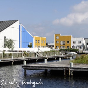 Ich mache noch ein paar Bilder von diesem Hafen, der wirklich einer guten Idee entsprungen ist, dem aber so das letzte bisschen Charme fehlt. Die Grünanlagen sind recht lieblos angelegt, das Brackwasser lädt so gar nicht zum Baden ein und die Autos könnten eigentlich auch außerhalb der Anlage parken.