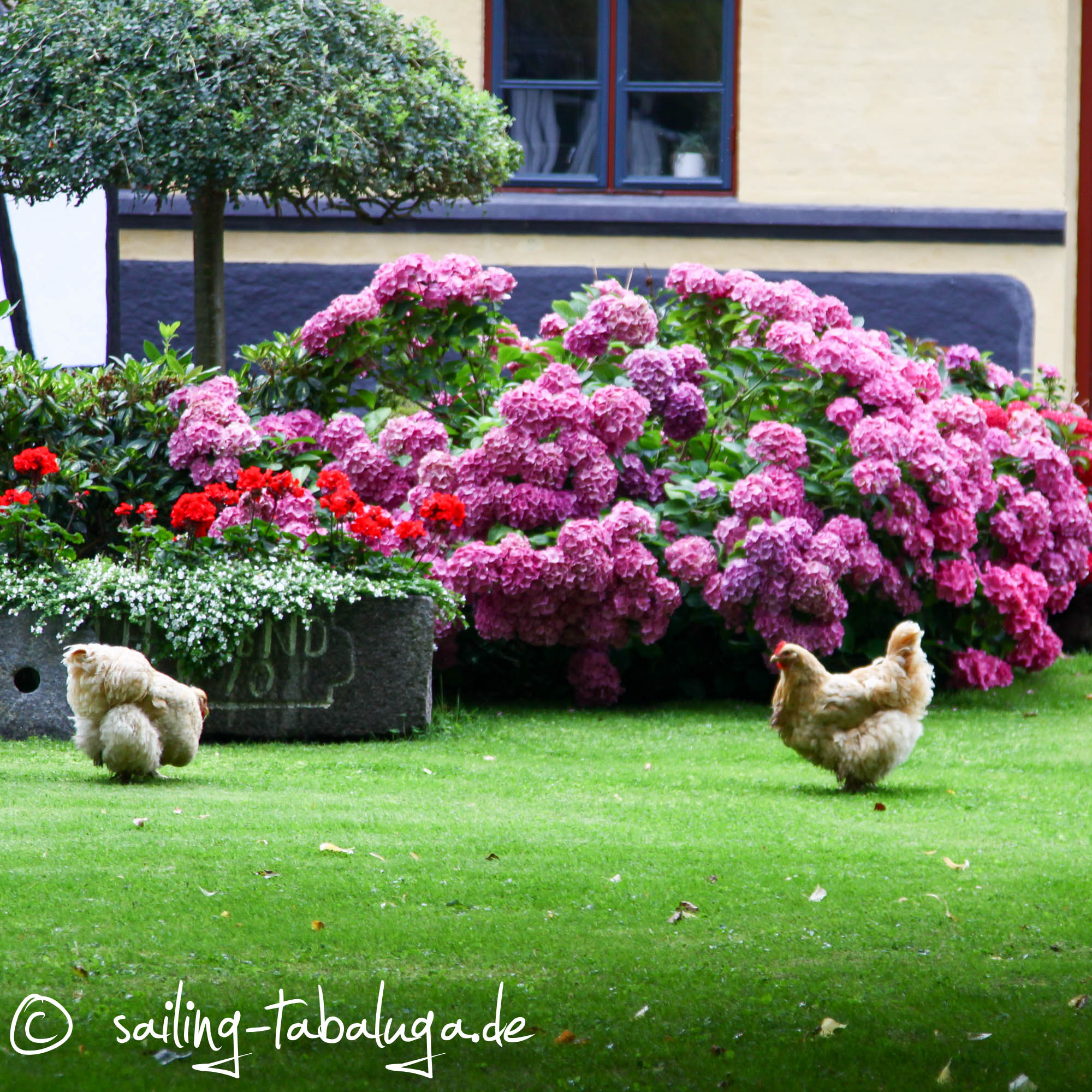 Ein wenig gerädert, aber mit frischen Brötchen gestärkt und gefülltem Kühlschrank geht es weiter. Der Wind hat wieder gedreht auf Südwest, Kappeln wird damit heute nicht erreichbar sein. Zudem fängt es an zu regnen, so dass wir uns für die Insel Lyø entscheiden. Klein, gemütlich, dänisch. Auf der Insel laufen Hühner, Gänse, Enten frei herum, es ist sehr landwirtschaftlich geprägt. Leider kommen immer wieder Schauer herunter, so dass sich der Rundgang nur aufs Dörfchen beschränkt.