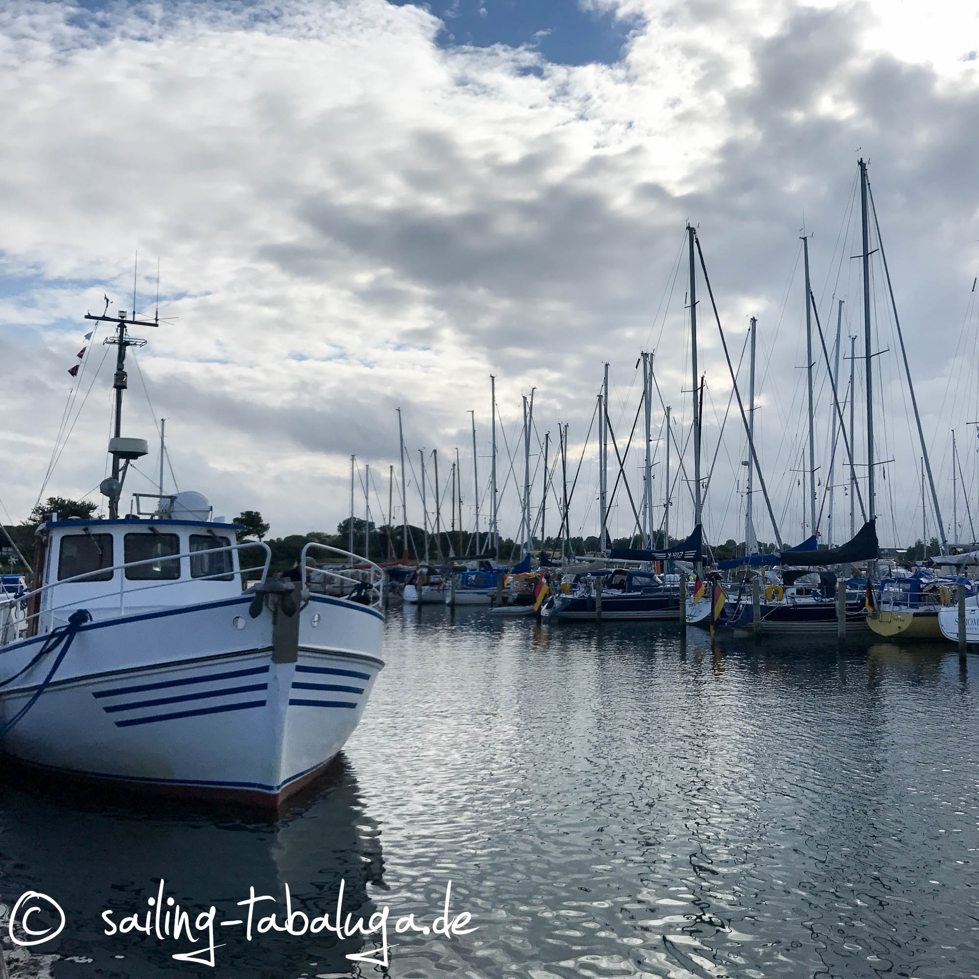 Wir erleben noch ein Anlegemanöver, das man so eigentlich nicht unbedingt sehen möchte… Ein Segler lässt sich vom Wind quer gegen die Dalben treiben und versucht sich dann mit Hilfe einer Leine rückwärts in die Box zu manövrieren. Grundsätzlich ist das eine gute Idee, aber als der Skipper versucht, das Boot per Hand vom Dalben weg zu schieben und seinen Kopf zwischen Boot und Dalben steckt, wird es lebensgefährlich! Zum Glück schreit seine Partnerin auch rechtzeitig auf, so dass er vernünftig wird und uns die Leinen übergibt, damit von den anderen Booten und von Land aus gezogen werden kann. Man glaubt gar nicht, wie unvorsichtig manche Menschen werden können…