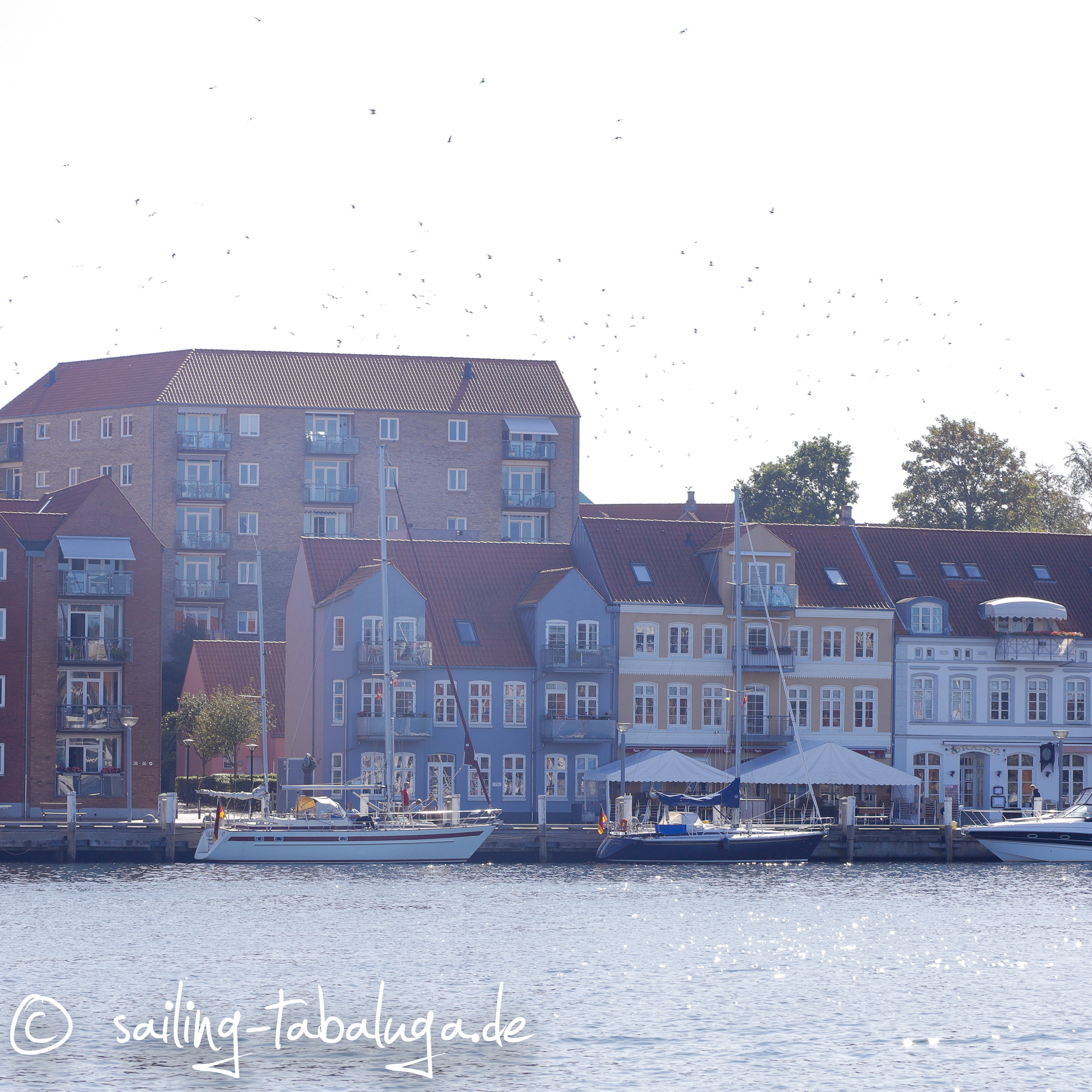 An einem Samstag im August bei strahlendem Segelwetter in die Flensburger Förde reinzusegeln, gleicht fast schon einer Regatta! Überall sind andere Boote, wir müssen ganz schön aufpassen. Ein Überholmanöver gelingt uns gut, wir üben fleißig für den Company Cup, der ja auch hier stattfinden wird. Wir schaffen es fast komplett bis zum Stadthafen unter Segel, nur die letzten Meter muss der Motor ran. Da wir Tabaluga ja hier für vier Wochen bis zum Cup lassen wollen, haben wir vorher mit dem Hafenmeister telefoniert, der uns riet, einfach erstmal irgendeinen grünen Platz zu nehmen und dann am Sonntag Abend auf einen freien Gästeplatz zu verholen. Gesagt, getan, wir finden einen Platz zum seitlich festmachen mit “unverbaubarem” Blick auf die Altstadt - genial! Anlegerbier, besser geht’s nicht. Wir sitzen beide da und es steht uns vermutlich ins Gesicht geschrieben: och, könnte man auch noch ein paar Wochen länger so aushalten… Der Hafenmeister klärt uns dann auf, warum der Hafen voll ist: Samstags kommen die Dänen und genießen günstiges deutsches Essen - und vor allem Getränke. Achja, wir verstehen…