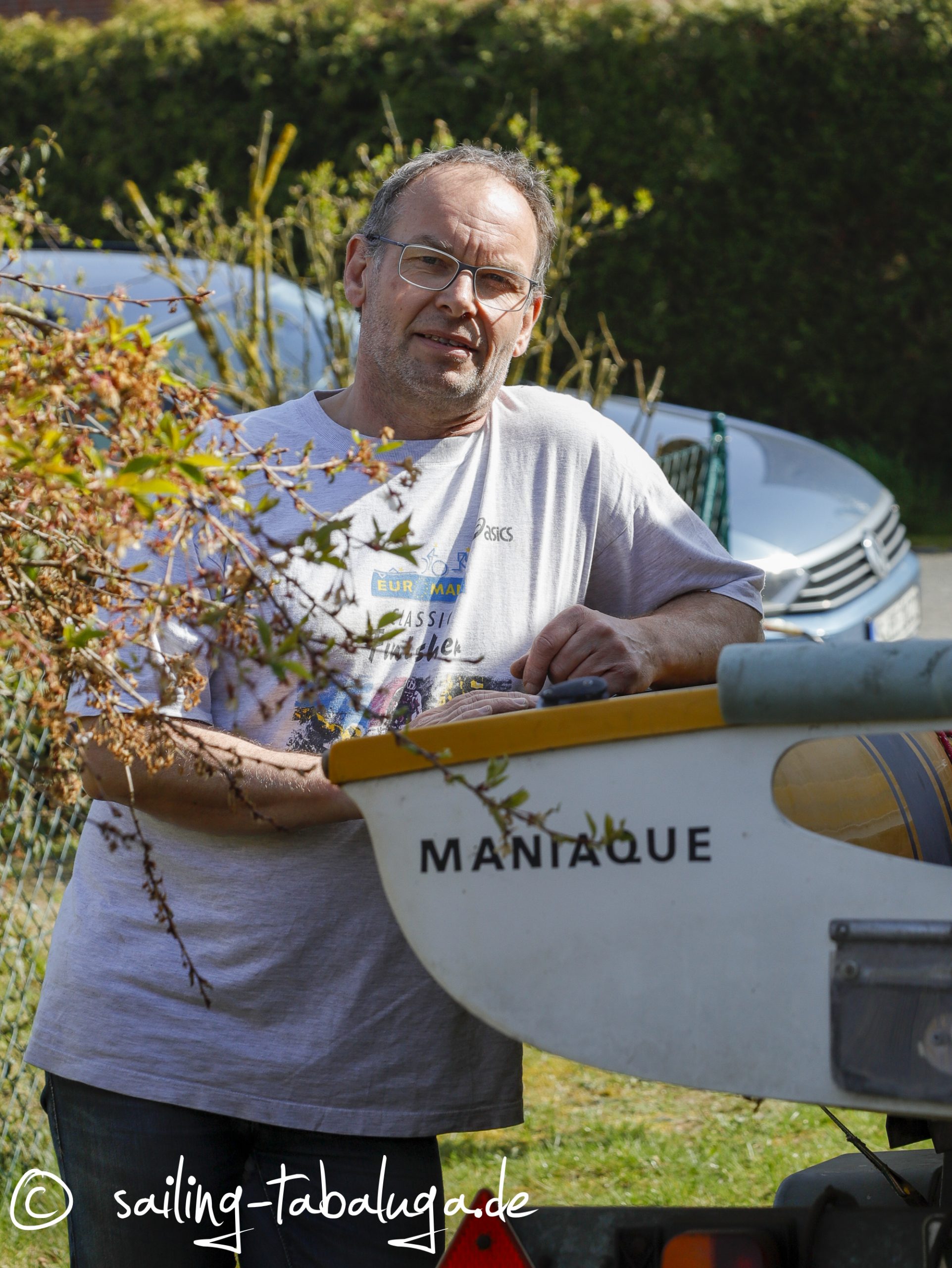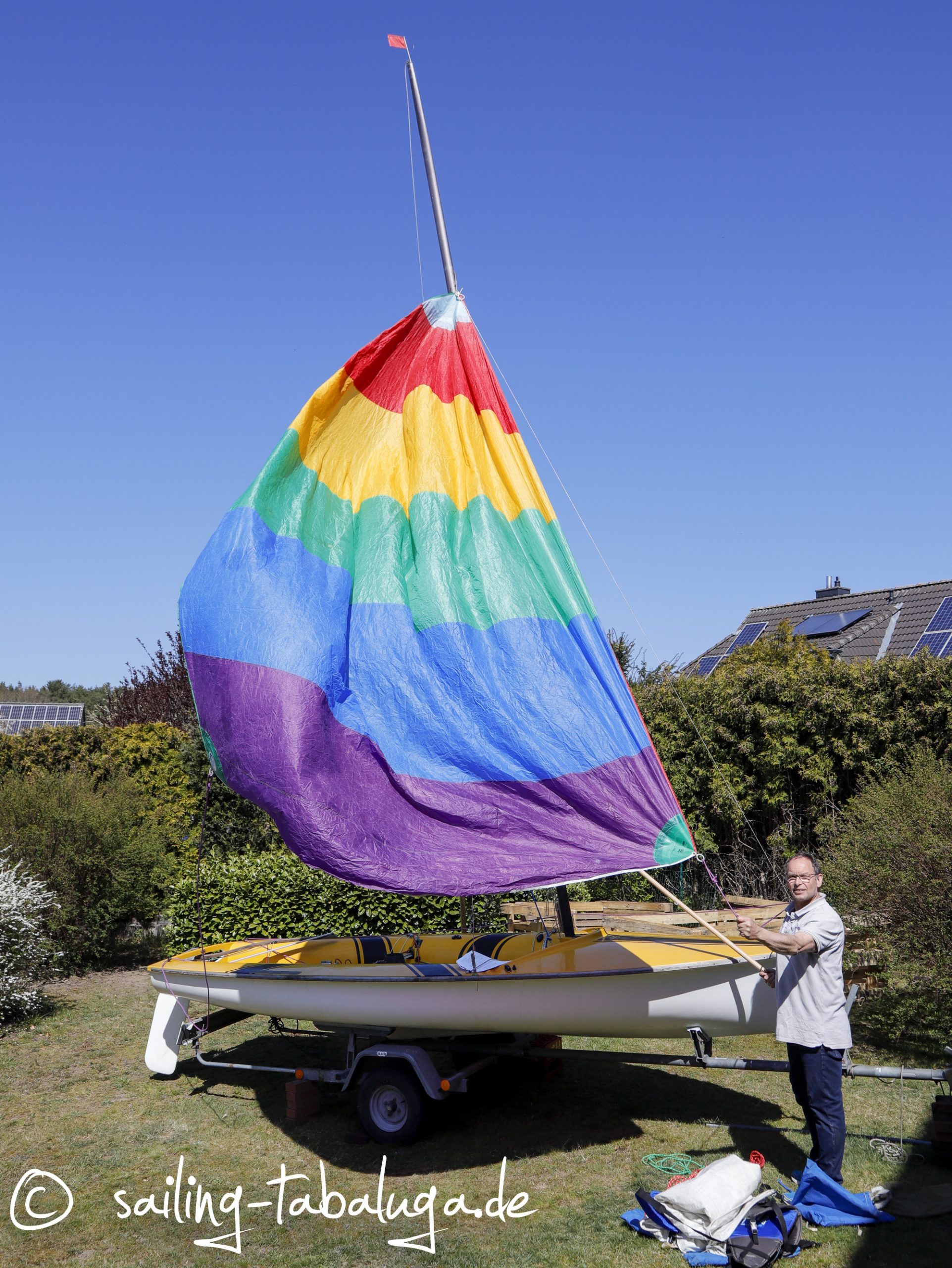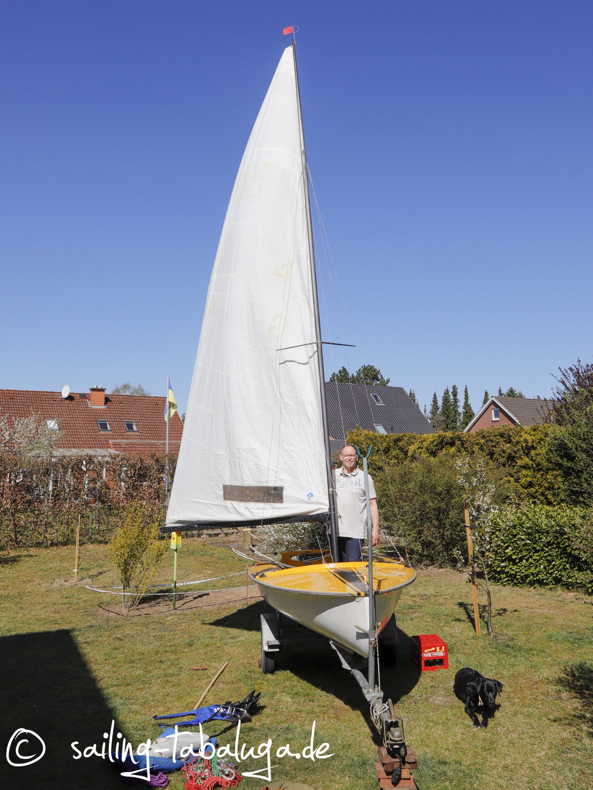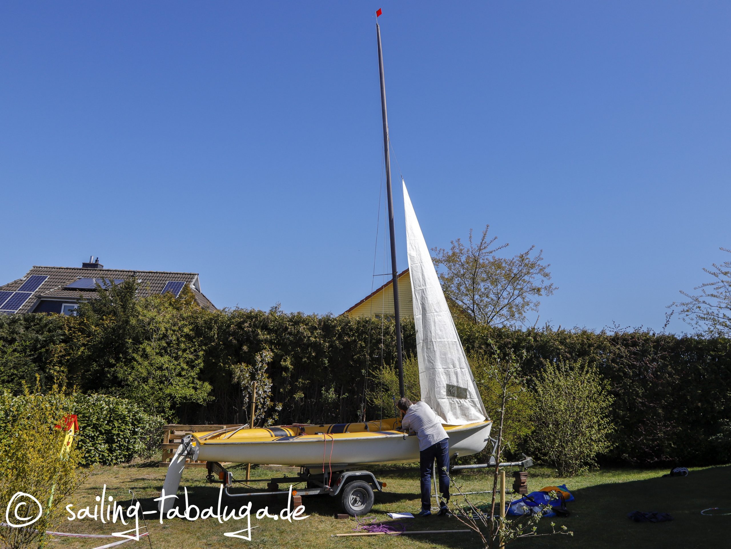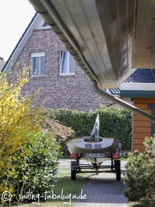 Wir haben nun das Glück, die Tabaluga zu haben und wissen, dass wir jederzeit los segeln können. Äh, ja, denken wir… und dann machen sogar die innerdeutschen Grenzen zu. Wir kommen nicht nach Fehmarn, können nichts machen, basteln, reparieren, geschweige denn, sie ins Wasser bringen. In der Verzweiflung nicht segeln könnender Skipper wird also kurzerhand aus dem Garten ein Segelrevier gemacht. Wie das? Freunde haben uns eine alte 470er Jolle, die Maniaque, geschenkt. Die mussten wir ja mal aufriggen und “Probesegeln”… 😄.