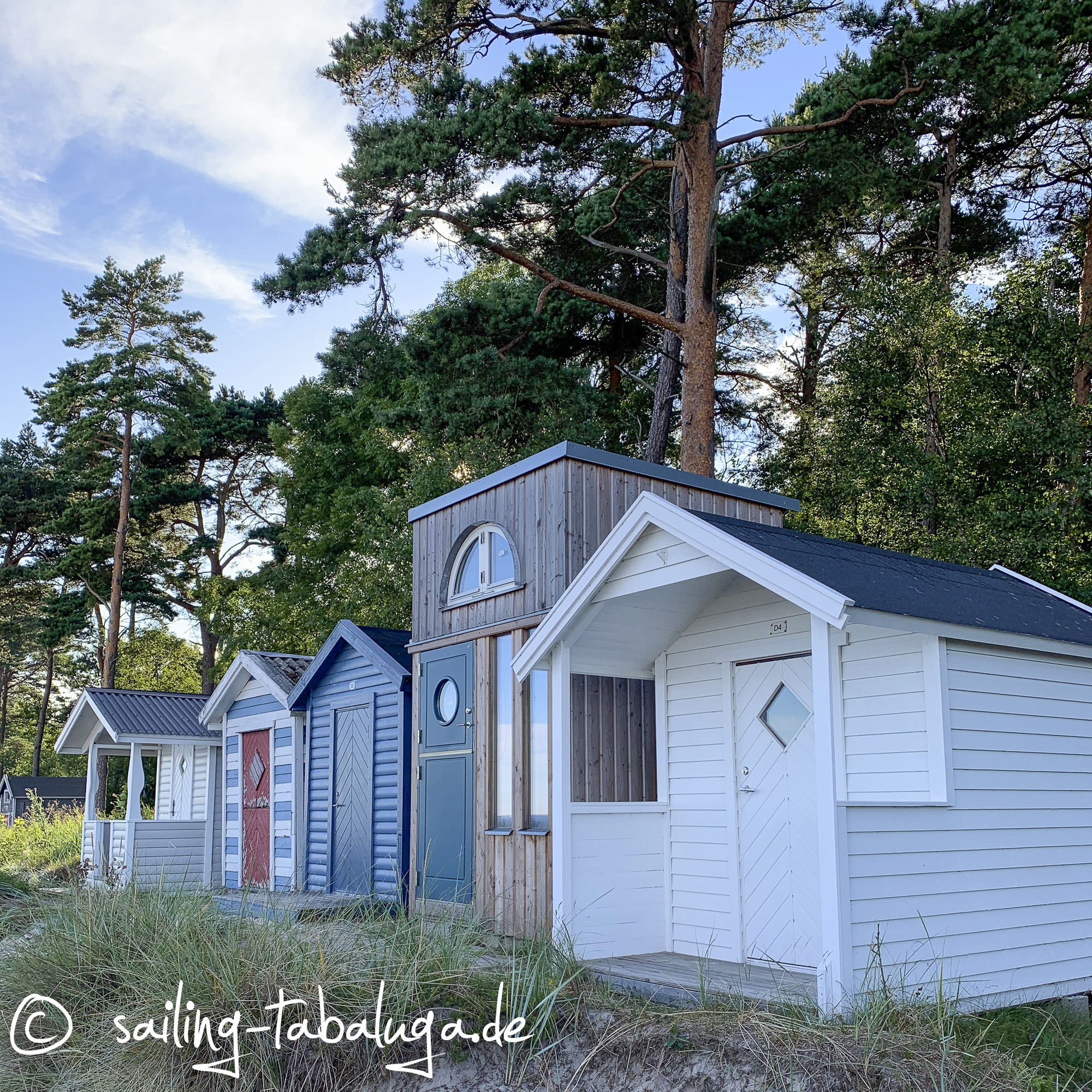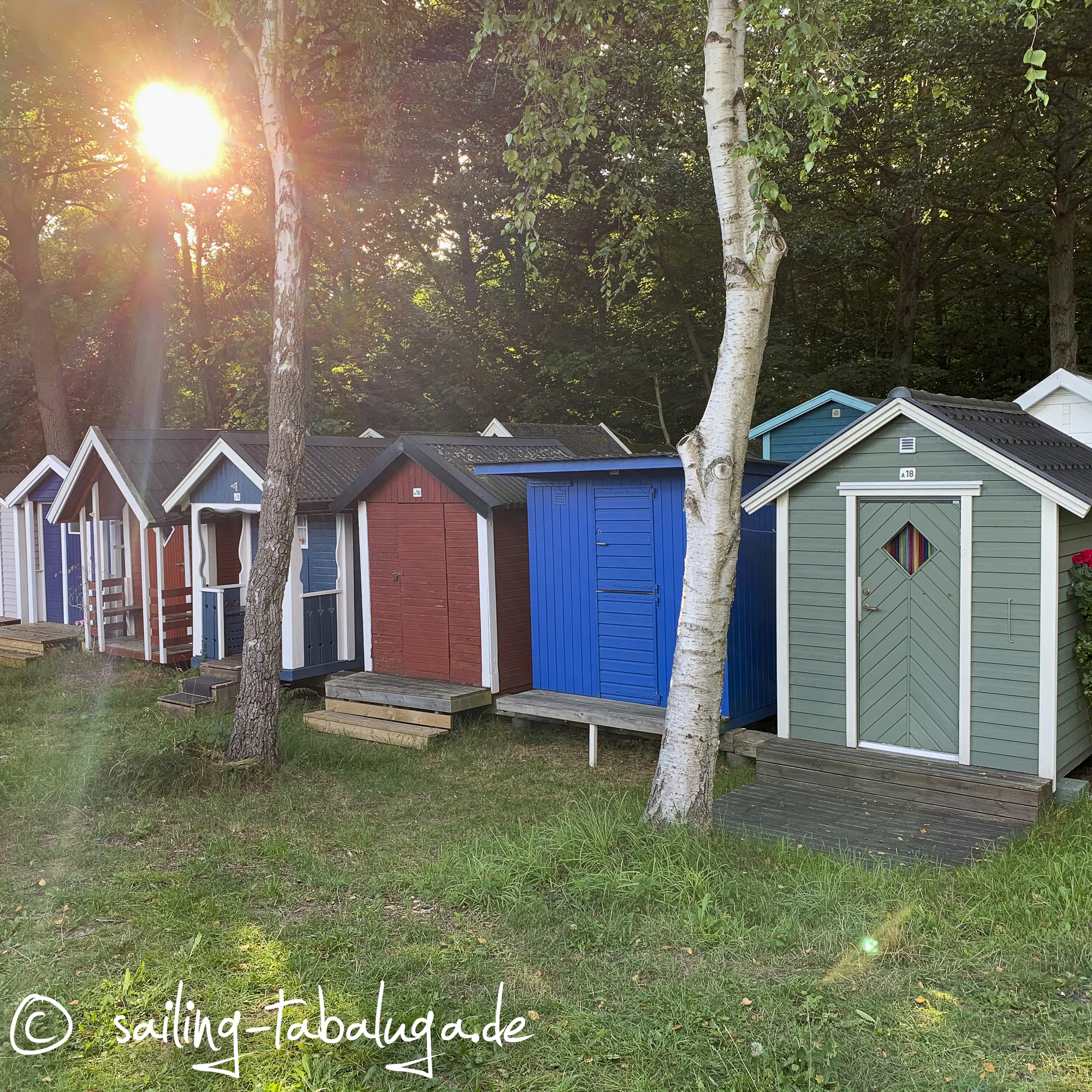 Die Sonne strahlt vom blitzblauen Himmel und lässt keine negativen Gedanken mehr zu. Wir schnappen uns die kleinen Italienern und radeln zum Strand östlich vom Hafen. So etwas traumhaft Schönes! Viele kleine Badehäuschen verstecken sich im mehreren Reihen im Wald direkt am Strand und erstrahlen in allen Farben. Der Strand lädt zum Baden ein, aber das Wasser überrascht uns mit echt nordischen Temperaturen… 😉. Die Sonne schafft es danach nicht mehr, mich aufzuwärmen, deshalb radeln wir durchgefroren zurück, schnell unter die heiße Dusche! Der Hafen ist immer noch leer, wo sind denn all die schwedischen Segler, vor denen wir gewarnt wurden??