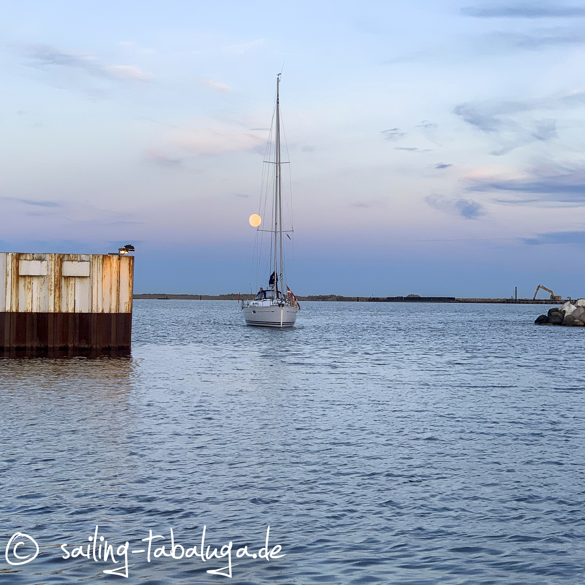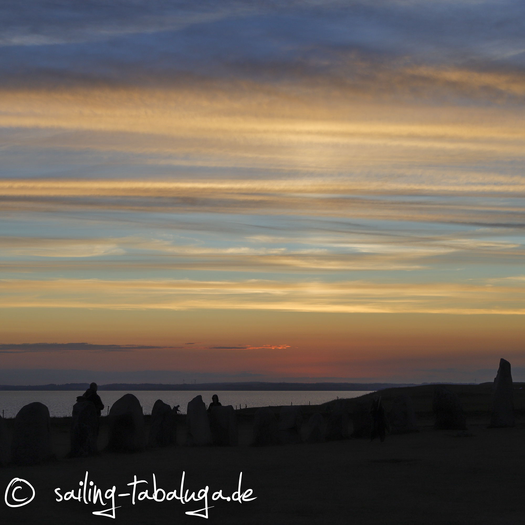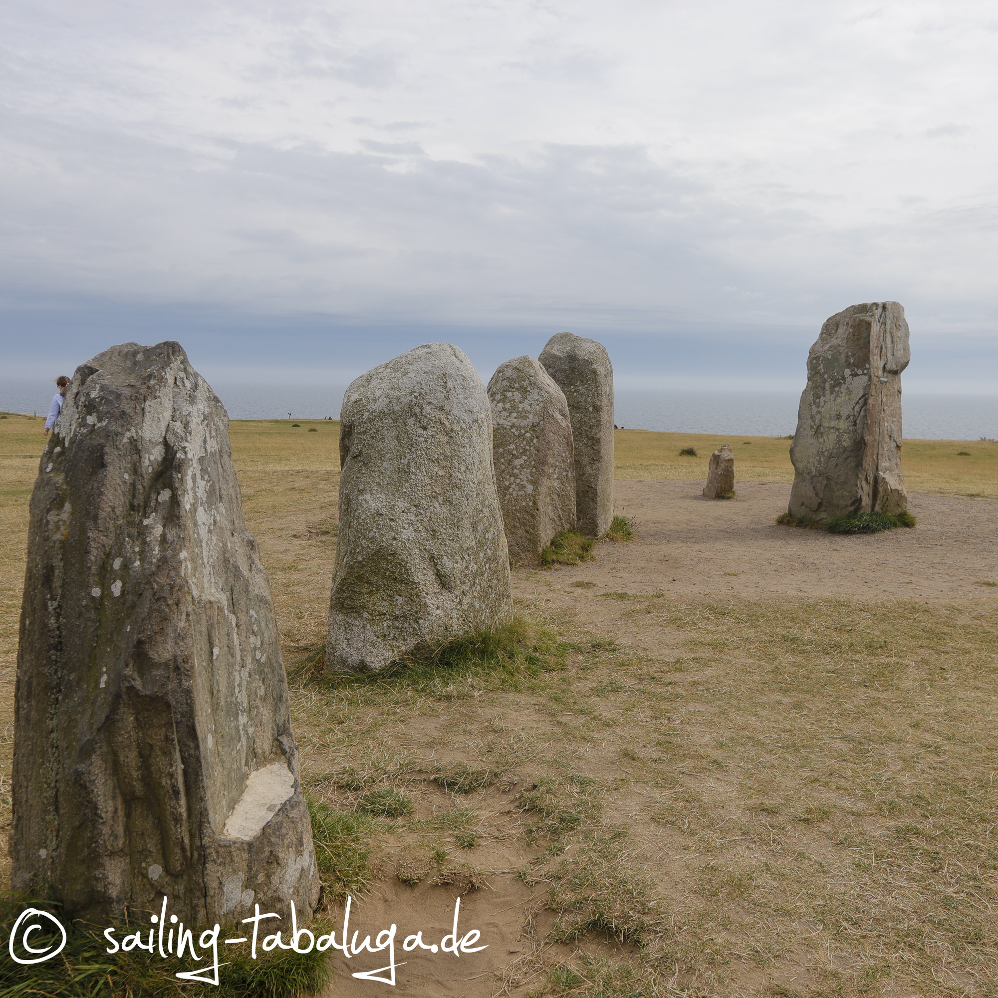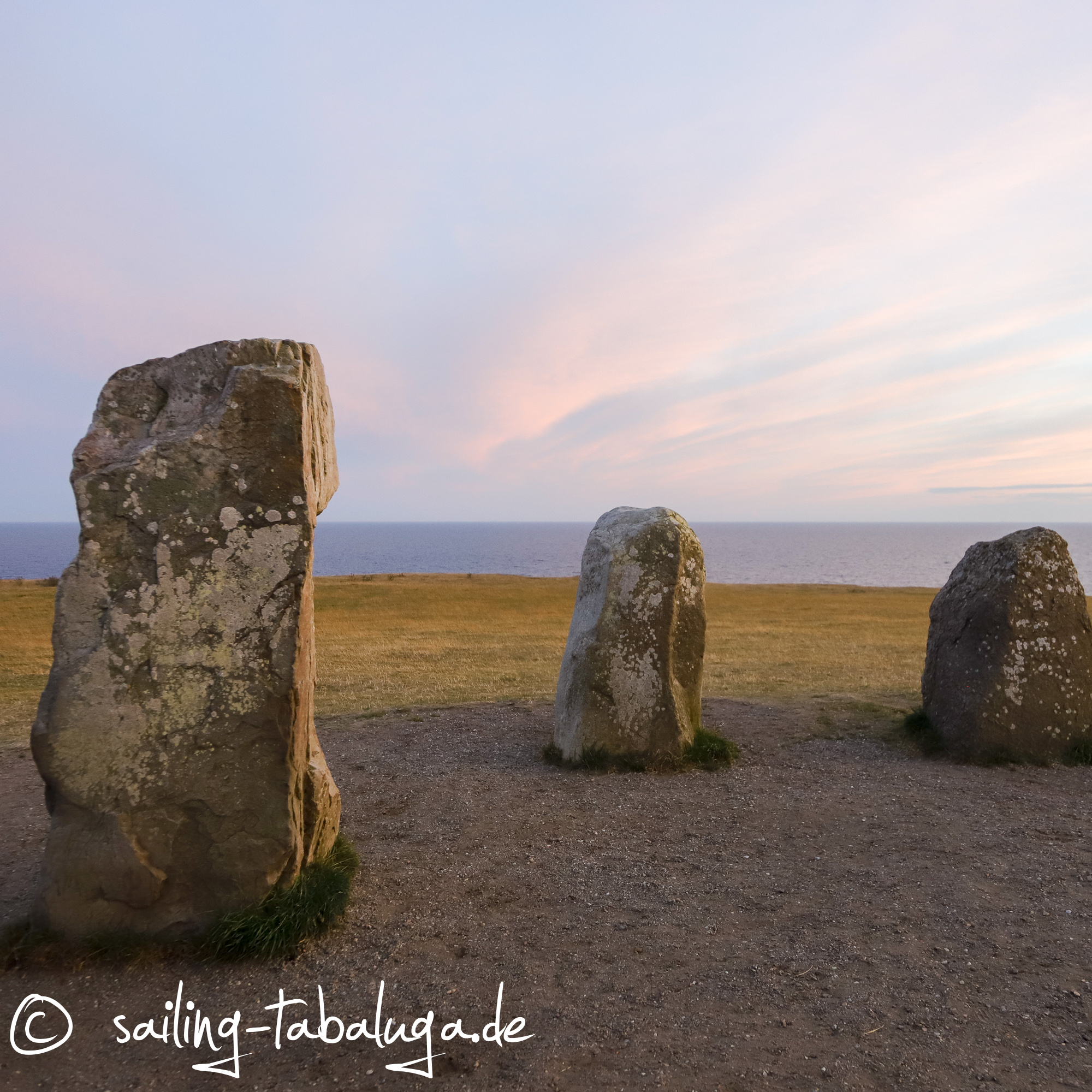 Unser heutiger Plan lautet nach Christiansø zu segeln, unser bisher östlichstes Ziel mit der Tabaluga. Die sogenannten Erbseninseln sind wunderschön, wir freuen uns darauf, auf eigenem Kiel dort anzulegen. Aber beim Aufwachen staunen wir ein wenig: es regnet und wir haben null Wind! Zu spät klart es auf, deshalb entscheiden wir uns zu einem Zwischenstopp in Kåseberga, ein Minihafen nur ein paar Seemeilen entfernt von Ystad. Dort ist genug Platz, aber auch viel Schwell. Attraktion hier sind die Ales Stenar, eine 1.400 Jahre alte Schiffssetzung aus 59 großen Steinen auf einem Hügel. Der Hintergrund für diese Steinsetzung ist wohl umstritten, während Wissenschaftler an eine Grabanlage glauben, deuten Schilder vor Ort auf einen Sonnenkalender bzw. eine Sonnenuhr hin.