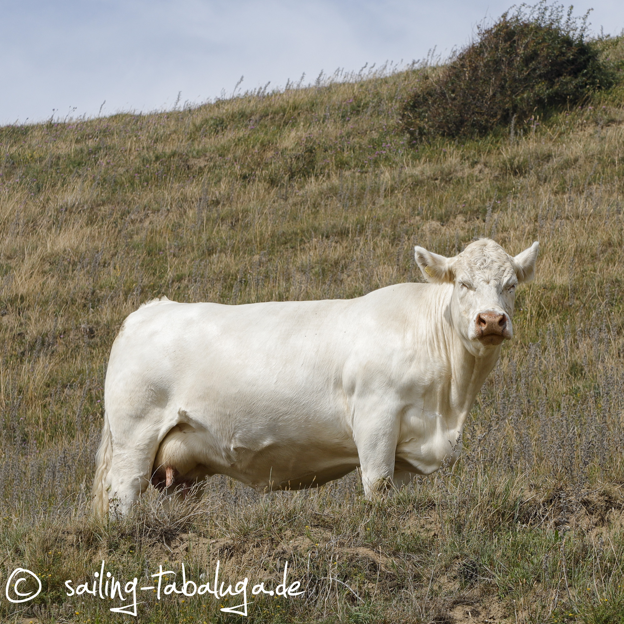 Wir starten zu einem Spaziergang, bestaunen die alten Steine und beobachten Gleitschirmflieger und Drachenflieger. Wir wandern entlang der Steilküste, es erinnert uns sehr an die Südküste der Isle of Wight, auf der unser Wunsch entstand, doch einmal ein eigenes Segelboot zu besitzen… Auf einmal sehe ich eine Herde Kühe, weiße Kühe, die sich in Richtung Strand begeben. Was machen die da? Die gehen tatsächlich ins Wasser, ist das etwa eine spezielle Rasse von Seekühen? Ob sie das Salzwasser trinken oder einfach Seegras futtern, können wir nicht herausfinden. Wir kommen recht nah an sie ran, für ein Foto werde ich ja immer mutig ;-). Sie ziehen sich recht bald zurück in die Hügel, so viele Touristen in der Nähe behagen ihnen dann doch nicht.