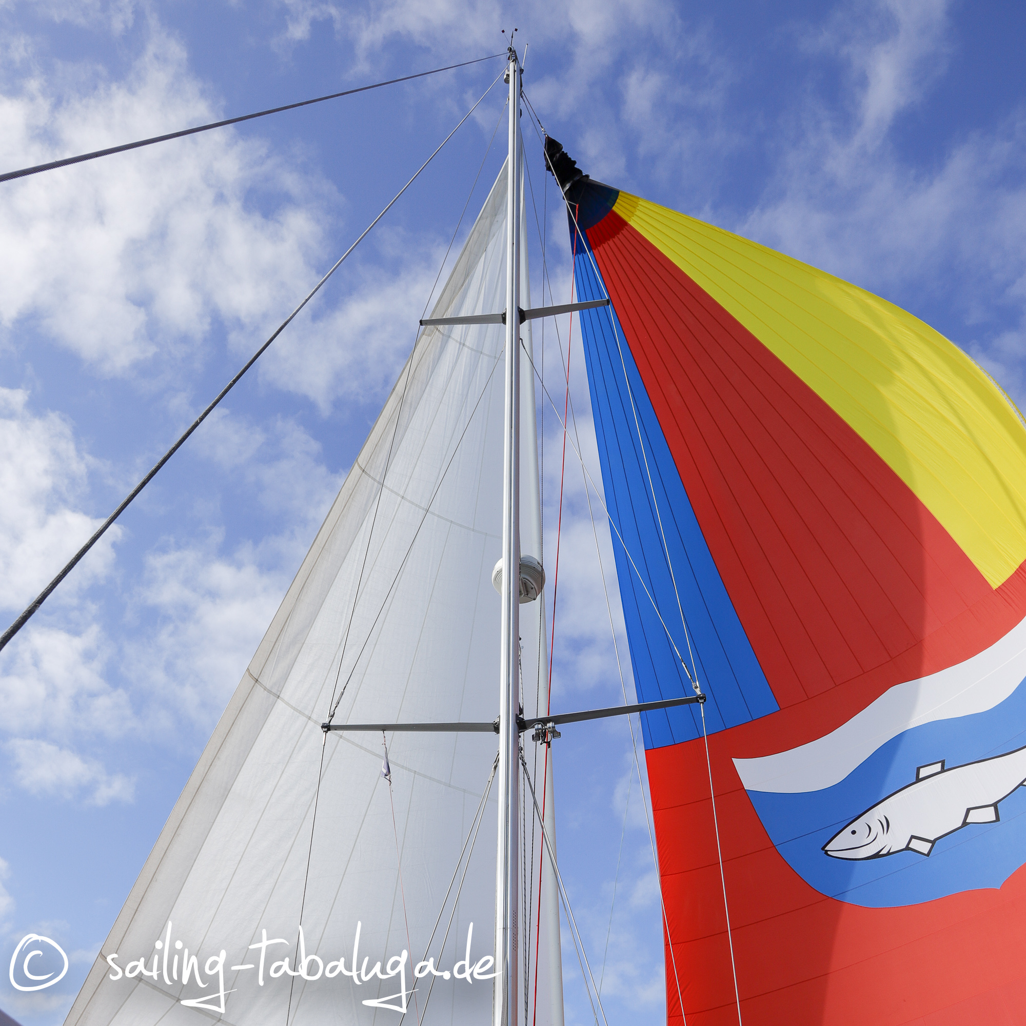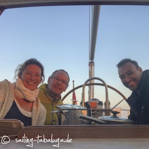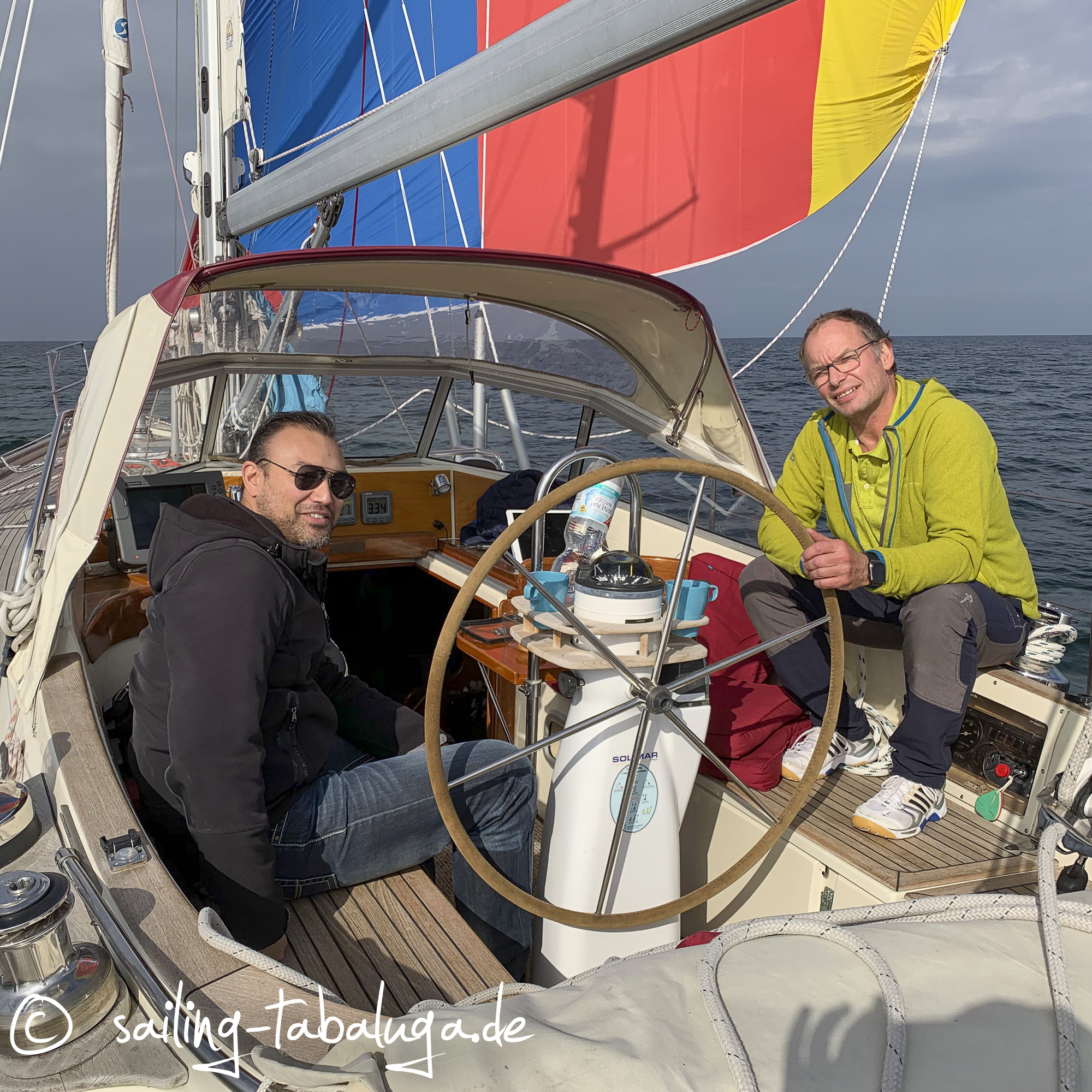 Wir starten heute sehr früh bei gemütlichem Wind aus Ost. Bernd und Mark kümmern sich ums Segeln und ich leg mich erstmal eine Runde in die Koje. Ich musste Lieschen noch nach Unna bringen und bin ein wenig gerädert. Irgendwann nach Fehmarn setzen wir den Blister und schaukeln gen Westen. Bis zur Marina Sonwik werden wir es wohl nicht in einem durch schaffen, also beschließen wir, in der Geltinger Bucht zu ankern und von dort am nächsten Morgen in die Flensburger Förder hinein zu segeln. In Sonwik warten dann hoffentlich Christian und Jens auf uns. Mal wieder sind wir beim Ankern nicht sicher, ob der Anker richtig Grund gefasst hat. Noch ist aber wenig Wind und wir hoffen auf eine ruhige Nacht. Anleger- bzw. Ankerbierchen und ein ordentliches Abendessen belohnen uns für einen tollen Segeltag.