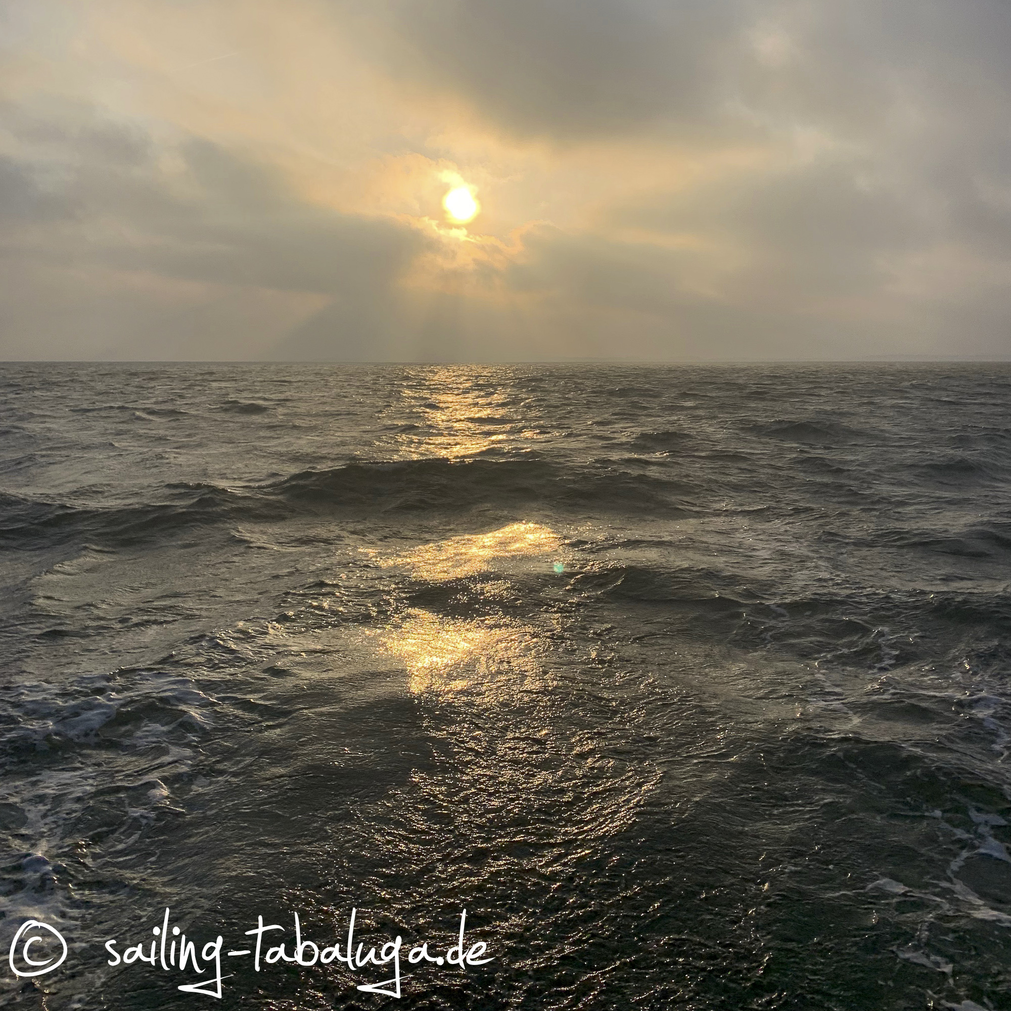 Der Wind frischt über Nacht auf, wie erwartet schliddert der Anker ein wenig über Grund und wir müssen zusehen, dass wir loskommen. Aber wir haben geschlafen und Frühstück ist auch noch drin. Der Himmel ist irgendwie verhangen, das sich nahende Tief macht sich schon bemerkbar.