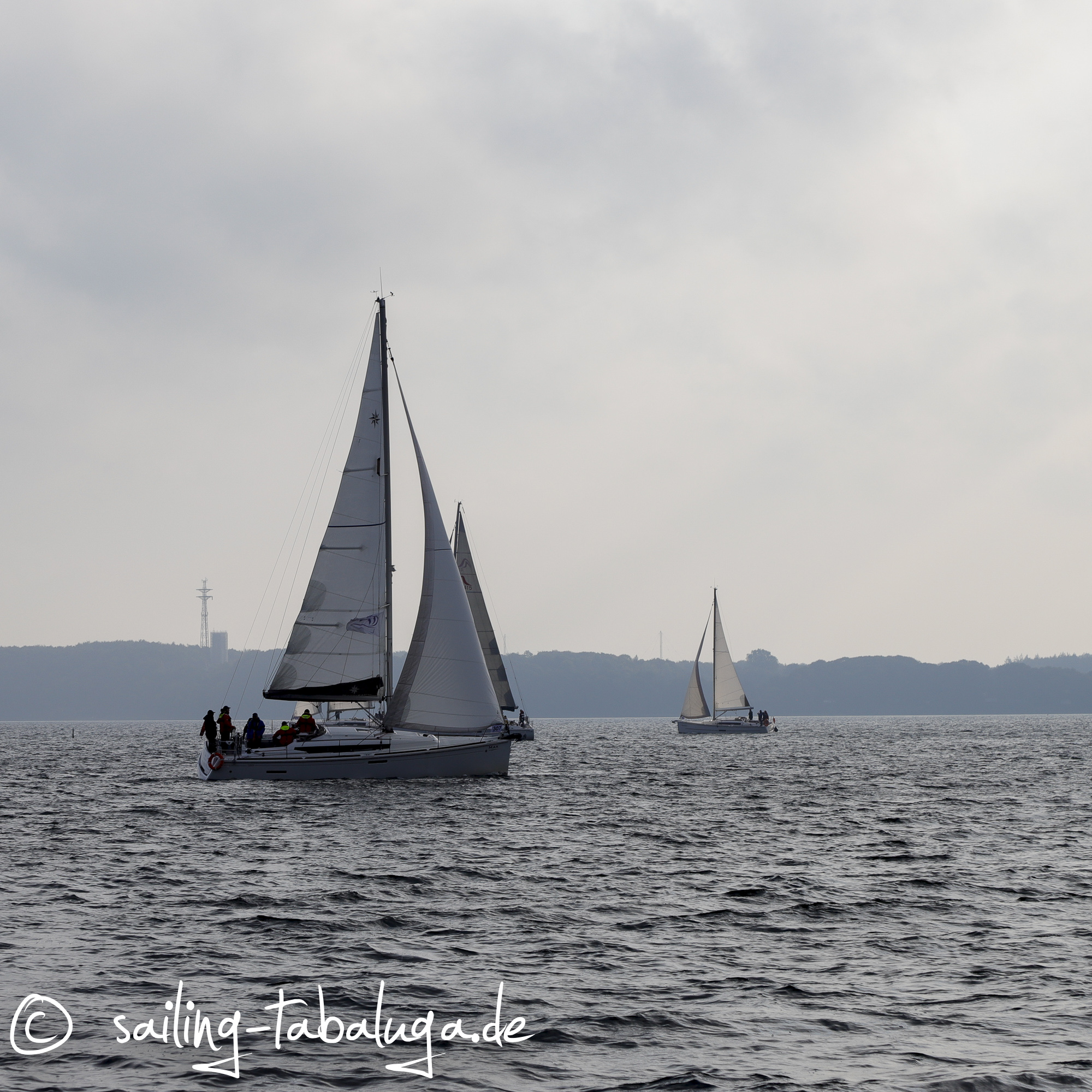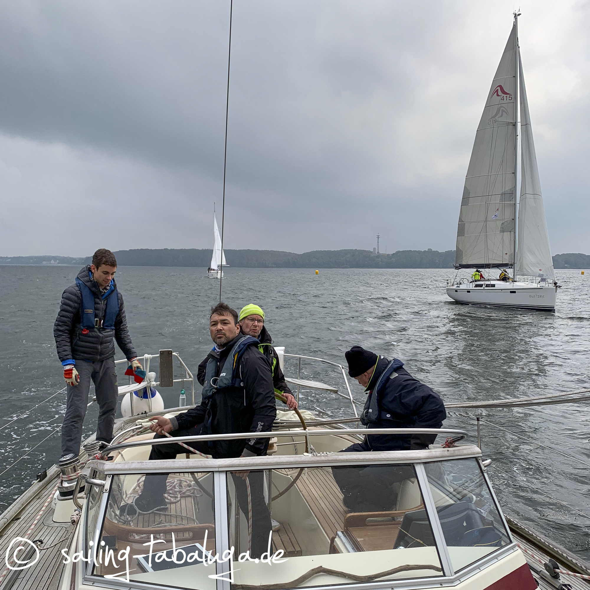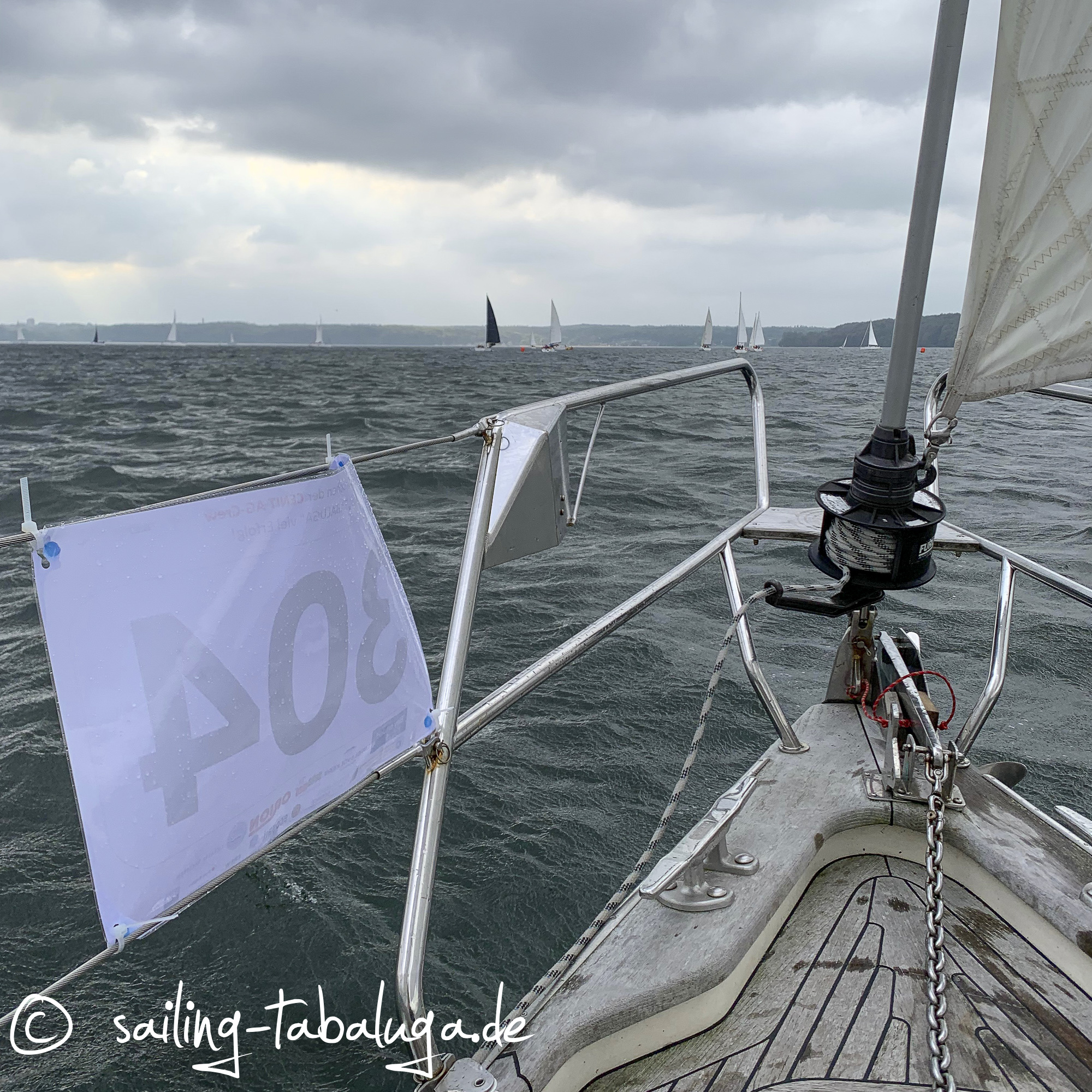 Der Wind ist kräftig, aber noch machbar. Das Gute an der Förde ist, dass Wellen nicht das Problem sind, auch bei viel Wind. Allerdings können Fallwinde und Böen einem Segler das Leben ganz schön schwer machen. Wir sind aufgeregt und wollen gewinnen! 😄. Diesmal bereiten wir Tabaluga ein wenig besser vor als letztes Jahr, keine Hundeleiter, kein Schlauchboot und keine Sprayhood sollen unseren Regattablick trüben. Die Wettfahrten laufen gut, die Aufregung der totalen Neulinge aus dem letzten Jahr ist ein wenig verflogen und Sicherheit kehrt ein. Sigi stellt sich als guter Taktiker heraus, gerade beim Start waren wir ja im letzten Jahr noch sehr zögerlich. Ich übernehme dieses Jahr das Tracking der Rennen auf dem iPad und kann so ziemlich gut die Wendepunkte bestimmen.