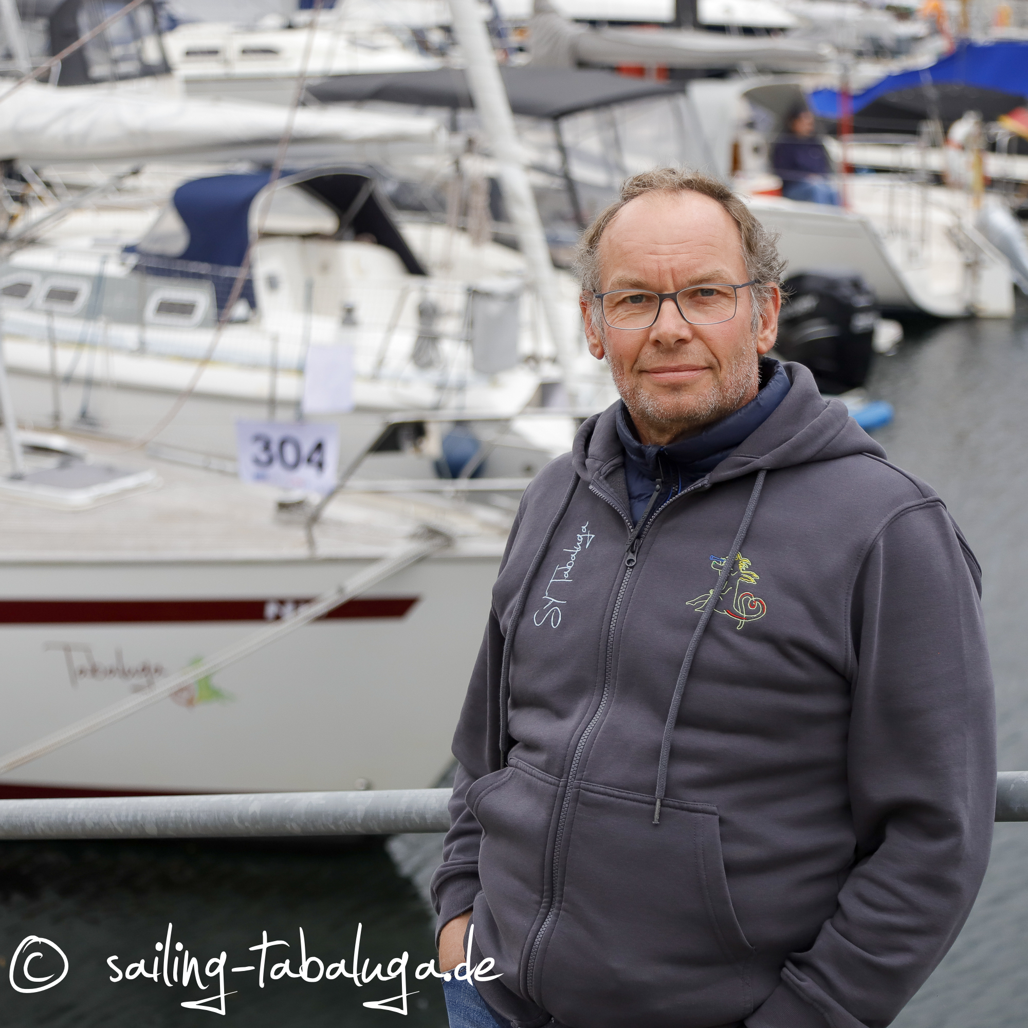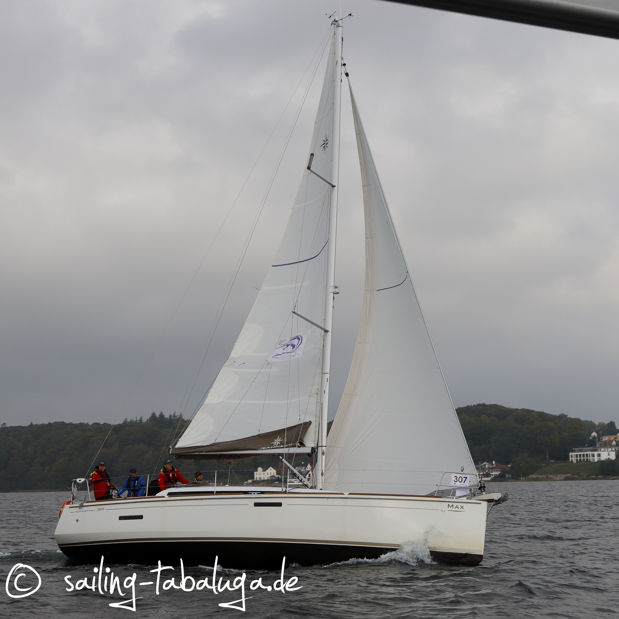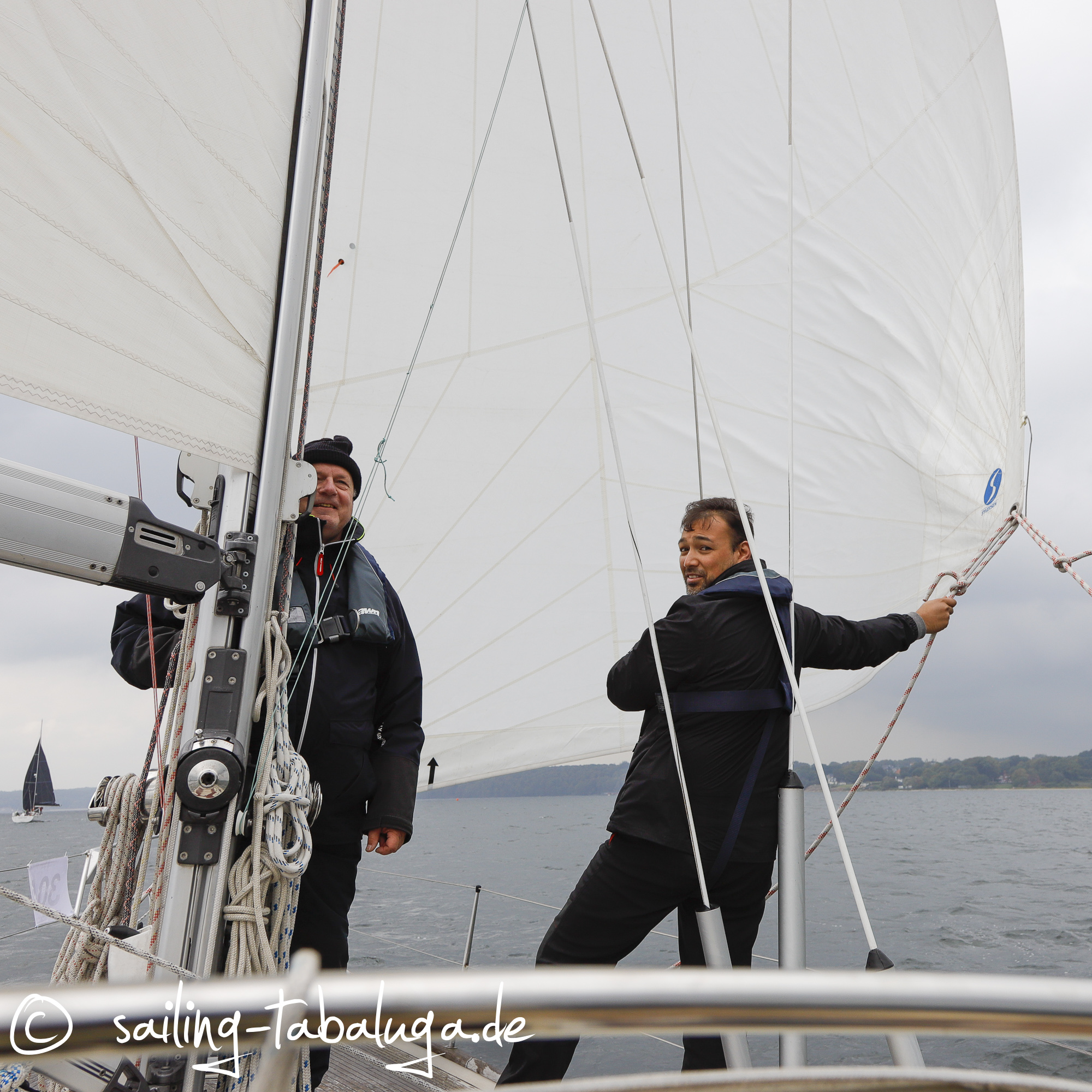 Der Wind ist kräftig, aber noch machbar. Das Gute an der Förde ist, dass Wellen nicht das Problem sind, auch bei viel Wind. Allerdings können Fallwinde und Böen einem Segler das Leben ganz schön schwer machen. Wir sind aufgeregt und wollen gewinnen! 😄. Diesmal bereiten wir Tabaluga ein wenig besser vor als letztes Jahr, keine Hundeleiter, kein Schlauchboot und keine Sprayhood sollen unseren Regattablick trüben. Die Wettfahrten laufen gut, die Aufregung der totalen Neulinge aus dem letzten Jahr ist ein wenig verflogen und Sicherheit kehrt ein. Sigi stellt sich als guter Taktiker heraus, gerade beim Start waren wir ja im letzten Jahr noch sehr zögerlich. Ich übernehme dieses Jahr das Tracking der Rennen auf dem iPad und kann so ziemlich gut die Wendepunkte bestimmen.