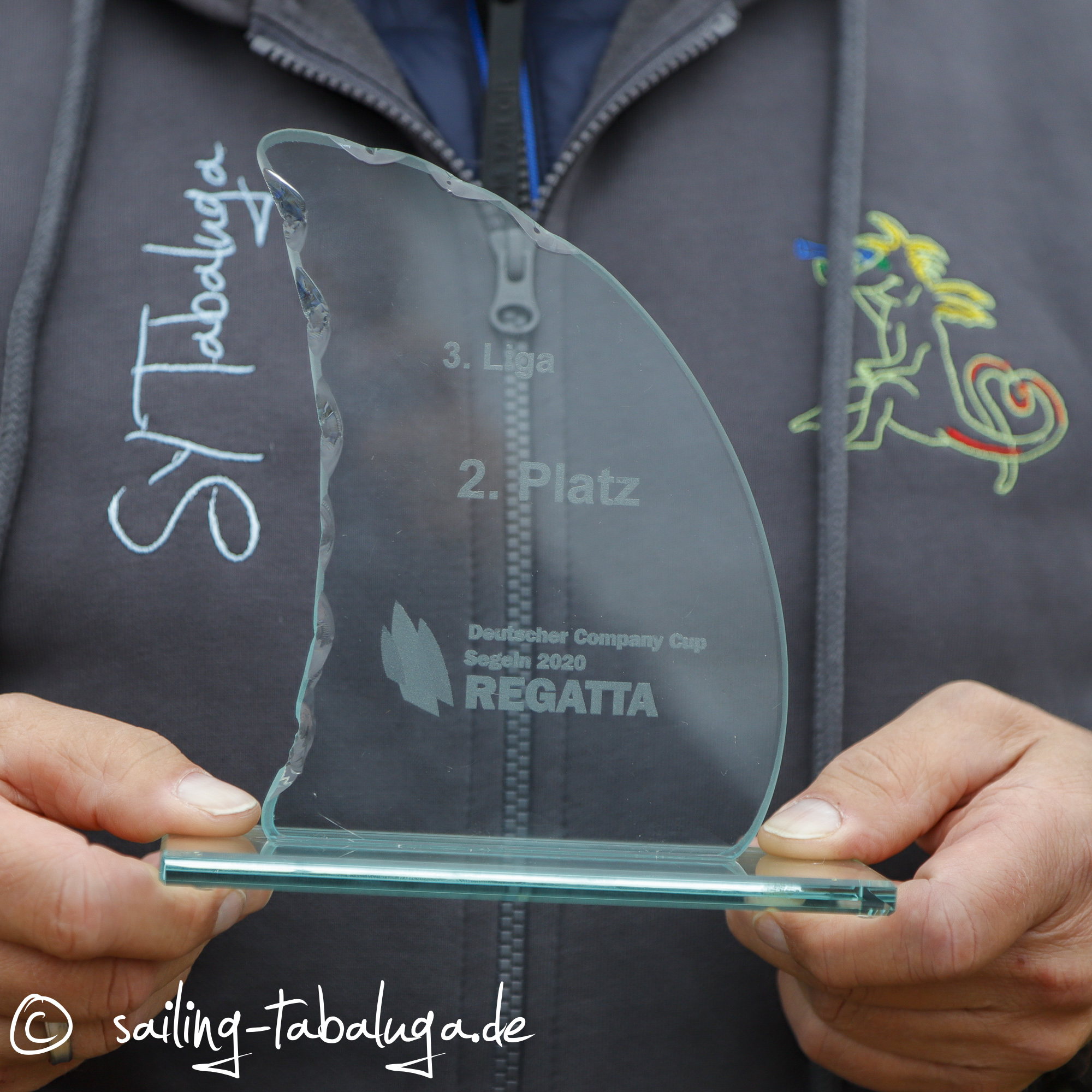 Wir platzen fast vor Stolz, dass wir diesmal mit dem zweiten Platz und einem schönen kleinen Pokal nach Hause kommen! Die letzte Wettfahrt haben wir auf dem 1. Platz beendet. Nur die Crew der Nivius war ein bisschen besser: 3x1 und 2x2… Tatsächlich können wir uns diesmal nichts vorwerfen, keine Schäden am Rigg, keine groben Steuerfehler, jede Fahrt ein bisschen besser. Ich denke, das letzte Fünkchen Mut zu den ganz knappen Starts und Manövern an den Wendetonnen fehlt uns einfach noch und das bekommt man sicherlich nur durch Übung. Wir schauen, was im nächsten Jahr ansteht. Wenn wir wieder dabei sind, starten wir nun in Liga 2, also haben wir uns einen Aufstieg ersegelt. Stolz wie Oskar trinken wir noch ein paar Bierchen und Manöverschlückchen und fallen glücklich in die Kojen.