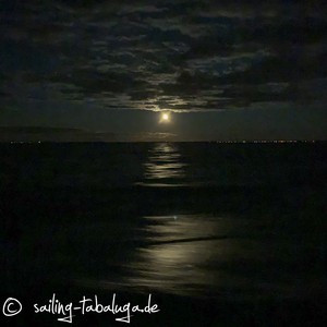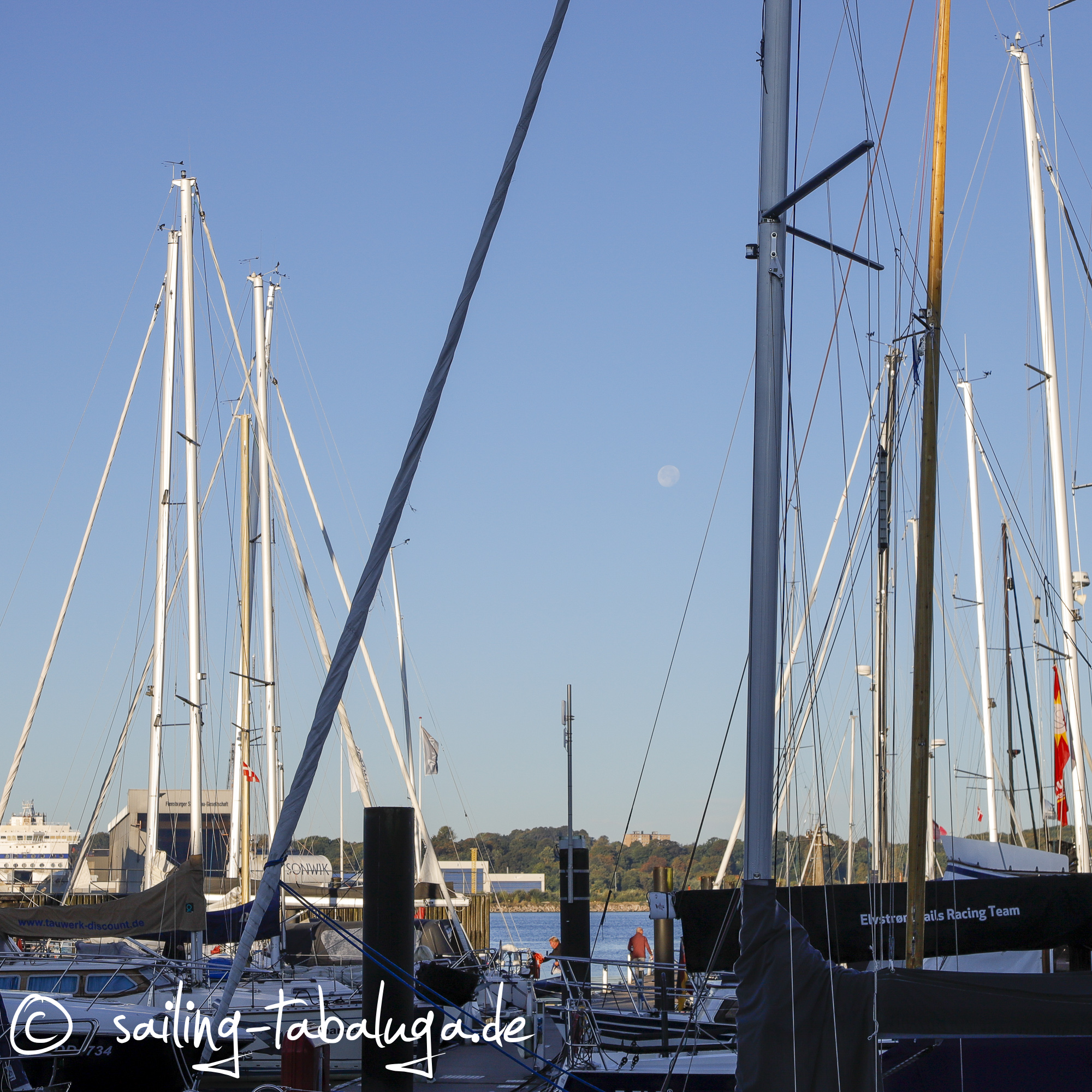 Ein wunderbarer Morgen weckt uns, der Wind hat sich beruhigt und wir beschließen, in einem Rutsch nach Hause zu segeln. Das wird uns natürlich in die Dunkelheit bringen, aber wer nicht übt, der nicht lernt… In der Förde ist eine Menge los, viele kleine Regattaboote sind unterwegs. Kaum sind wir heraus aus den ruhigen Gewässern trifft uns die alte Ostwindwelle so richtig. Puh, es schaukelt und wirft uns hin und her. Wir kriegen den Kurs Richtung Großenbrode nicht so richtig angelegt, zwischendurch sieht es aus, dass wir eher in Gedser landen als daheim. Irgendwann dreht der Wind ganz leicht auf Süd, so dass wir endlich die richtige Richtung ansteuern können. Der Wind wird ruhiger, die Wellen auch, die Dämmerung bricht herein. Der Mond scheint uns den Weg weisen zu wollen. So ist eine Nachtfahrt wirklich wunderschön! Wir nähern uns der Fehmarnsundbrücke und müssen jetzt aufpassen, die Ansteuerungstonnen nicht zu verpassen. Das stellt sich als Herausforderung da, denn die meisten sind unbeleuchtet. Wir sind nicht mehr so ganz auf der Höhe unserer Gedankenleistung, denn anstatt gleich den Handscheinwerfer herauszukramen, versuchen wir uns anhand des GPS Signals und der Karte an der Fahrrinne entlang zu hangeln. Das stellt sich als echte Aufregung heraus, zumal nach der Brücke der Wind wieder massiv auffrischt. Man sieht die Tonnen erst im allerletzten Moment, und sie sind nie da, wo wir vermuten! Irgendwie schaffen wir es aber unbeschadet und für die Einfahrt in den Binnensee aktivieren wir nun auch den Handscheinwerfer. Und siehe da: die Bojen sind mit Reflektoren ausgestattet, so dass die Navigation nun ganz einfach ist. Man lernt nie aus, nicht wahr? Nach 15 Stunden auf dem Wasser legen wir müde, aber glücklich in Großenbrode an. Mark will noch nach Hause fahren, nach dem obligatorischen Anlegerbierchen verabschiedet er sich. Wir gehen in die Koje und träumen vom Sieg im nächsten Jahr 🙂