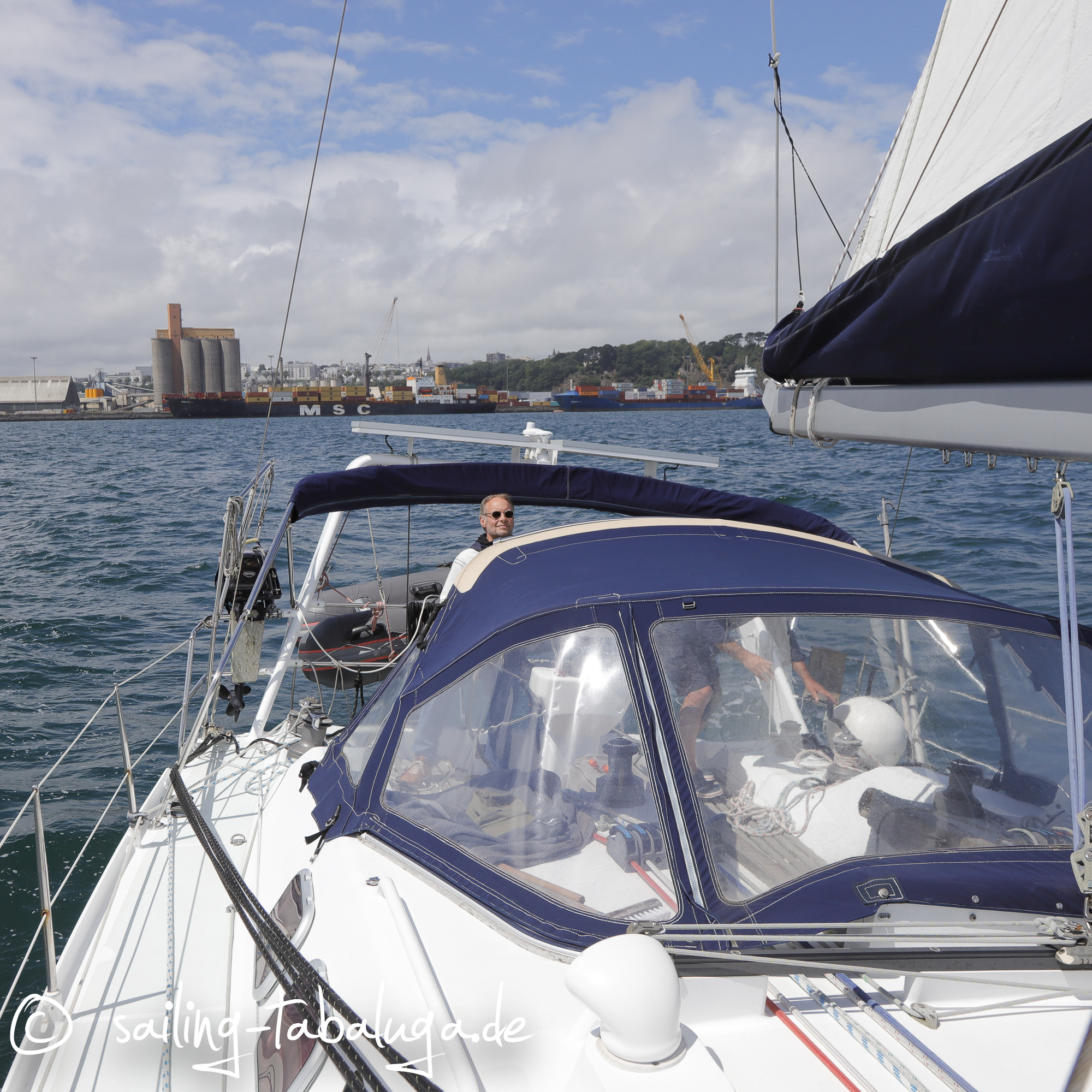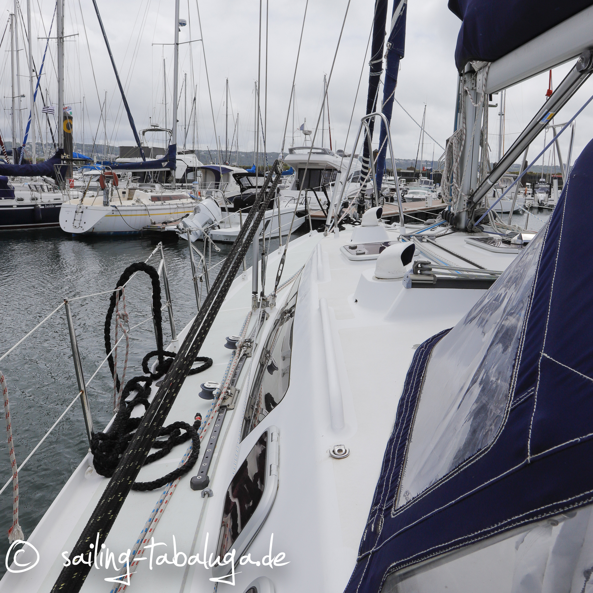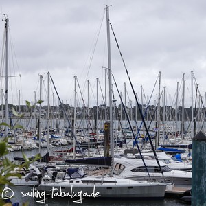 Eines Abends überrascht mich mein Mann dann mit den Worten: wollen wir uns eine OVNI in Brest anschauen? Mir entgleisen zunächst die Gesichtszüge, dann kommt der Gedanke „wir haben doch ein schönes Boot, wozu?“ und schließlich: „äh, ja, klar!“. Wow, was für ein Gedanke! Eine OVNI ist eine französische Aluminiumyacht der Werft ALUBAT, hochseetauglich, mit Hydraulikkiel, um auch trockenfallen zu können! Es würden sich komplett neue Reviere eröffnen. Wir lieben unsere Tabaluga, sie ist wunderschön, allerdings haben sich in 8 Jahren auch neue Bedürfnisse ergeben. Ich hätte damit nie gerechnet, aber nach einiger Zeit kann ich mich damit anfreunden, sie in gute Hände an jemanden zu geben, der diesen Klassiker zu schätzen weiß und mit ihr weiterhin die Ostsee bereisen möchte. Auch eine Najad 391 ist hochseetüchtig, hat aber eben doch „nur“ einen Kunststoffrumpf und kein Metall. Nachdem immer mehr Müll in den Ozeanen herum schwimmt, ist das natürlich auch ein absolutes Argument für unsere Sicherheit. Ein bisschen mehr Platz, mehr Stehhöhe und auch Raum für Lieschen wären toll. Die OVNI, die nun in Frankreich zum Verkauf steht, ist baugleich mit Cybéle, der Yacht unserer lieben Freunde Valérie und François. So wissen wir natürlich, was uns erwartet, aber andererseits muss das Gefühl stimmen und wir uns an Bord absolut wohl fühlen. Daher geht kein Weg an einem spontanen Wochenendtrip nach Brest vorbei.