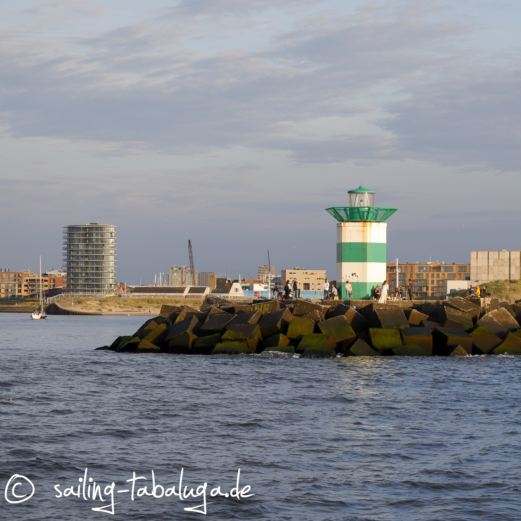 In Scheveningen erwartet uns ein riesiger Hafen und wir sind optimistisch, einen guten Platz zu finden. Da kommt der Hafenmeister in einem Schlauchboot zu uns und fragt, wie lange wir bleiben wollen. Eine Nacht, vielleicht zwei… Okay, dann kommt mal mit. Wir fahren ihm hinterher, lassen freie Boxen rechts und links liegen, wundern uns, weil es immer enger und voller wird und schlussendlich zeigt er auf ein ca. 45 Fuß langes Segelboot in der hintersten Ecke: an die könnt ihr längsseits gehen! Auweia, da kommen wir nur rückwärts rein, drehen wäre unmöglich. Ich wappne mich mit einem laufenden Fender, Michi und Bernd besprechen in Ruhe jeden Schritt zum Anlegen. Zu unserem großen Glück ist es gerade absolut windstill, so dass wir wirklich in aller Ruhe rückwärts fahren können. Und es funktioniert reibungslos! Ich bin megastolz auf meinen Skipper und wir freuen uns über das Anlegerbier in niederländischen Gewässern. Im Hafen ist überall Musik und Party, aber wir halten uns zurück, Corona ist noch nicht verschwunden…!