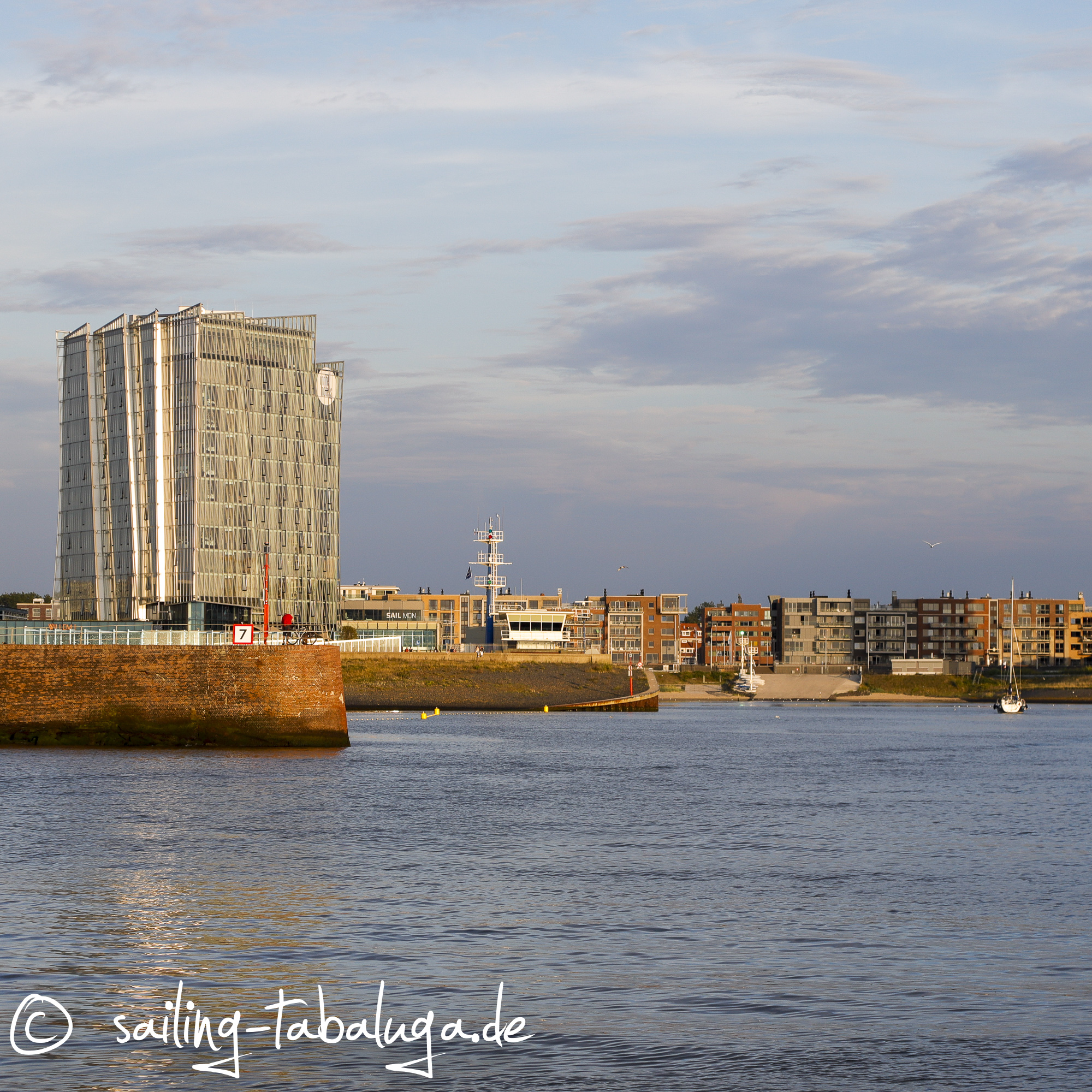 Die Wettervorhersage gibt Grund zur Sorge, ein ordentlicher Sommersturm ist im Anmarsch. Wir entscheiden uns, schnellstmöglich nach Borkum zu segeln, um dort im gezeitenunabhängigen Schutzhafen den Sturm abwettern zu können. So starten wir um 6 Uhr zur ersten Brückenöffnung, die Flut ist zum Glück heute passend zur Stelle.