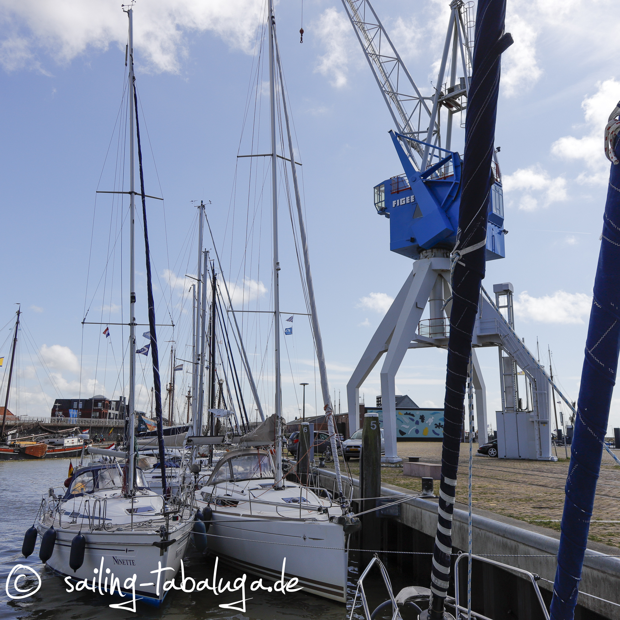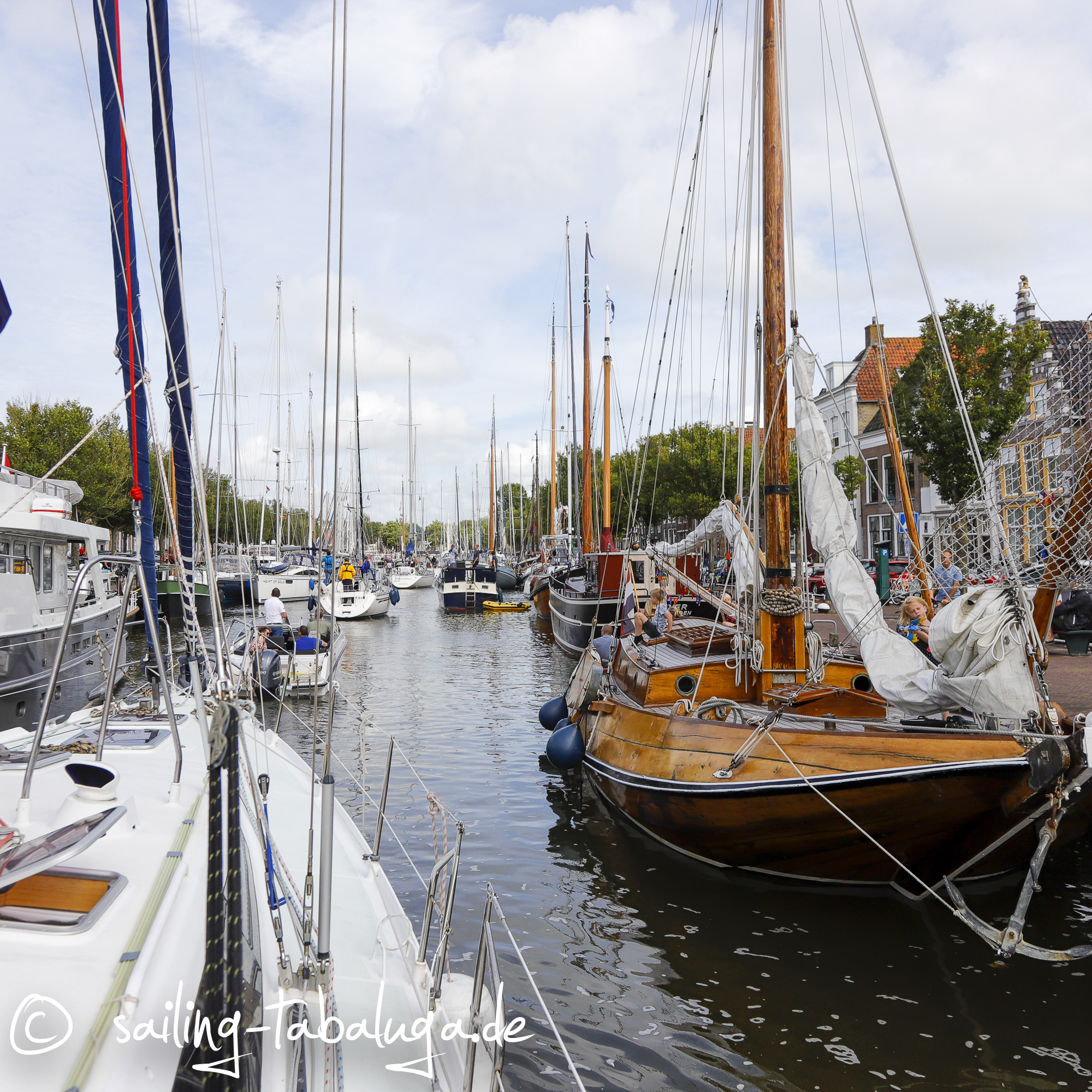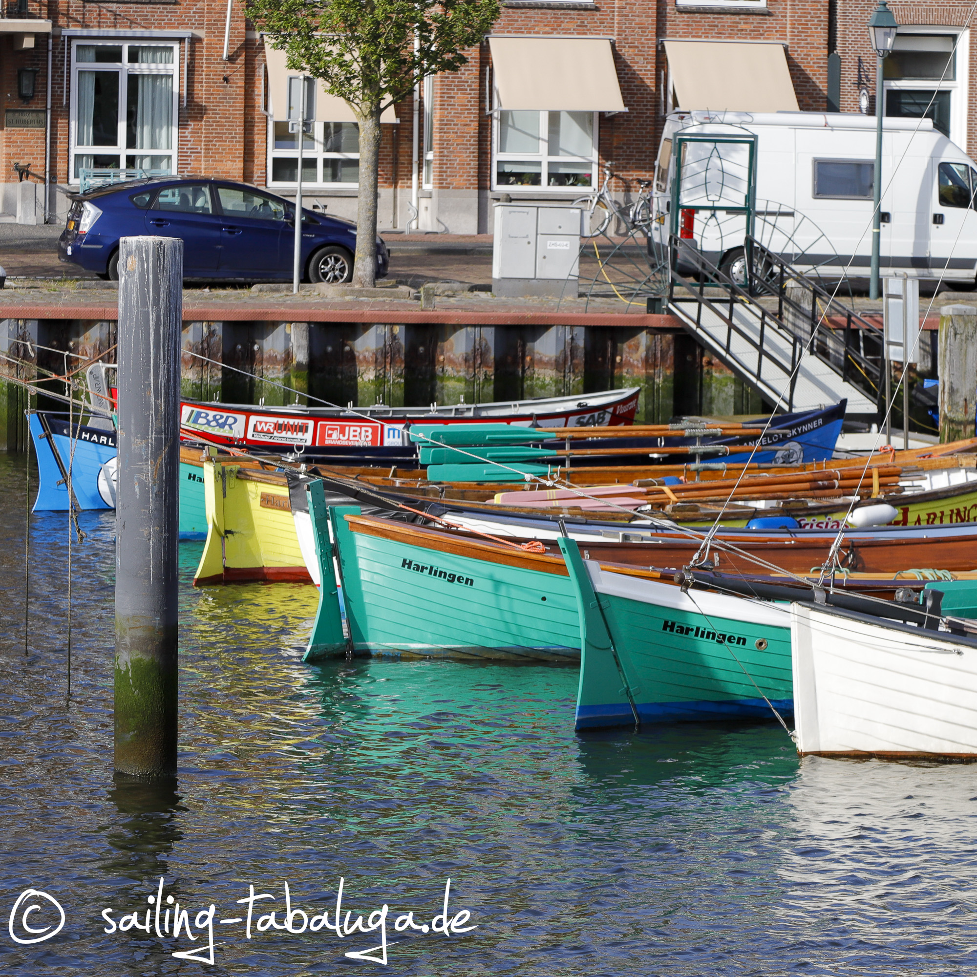 So beschließen wir schlussendlich, wenigstens Harlingen anzulaufen und dann zwischen Terschelling und Vlieland wieder raus auf die Nordsee und von da nach Borkum oder Juist zu segeln. Die Fahrt durchs Wattenmeer ist sehr entspannt, der Wind pustet ganz gut, aber die Wellen sind ja doch eher niedlich nachdem was wir bisher erlebt haben 😉. In Harlingen müssen wir vor der Schleuse ins Ortszentrum warten. Wir wundern uns, es ist doch Hochwasser? Wir erfahren, dass Springflut ist und auch dann die Tore geschlossen werden müssen. Eine Stunde warten ist angesagt. Das Hafenbecken vor der Schleuse ist schon gut gefüllt, entsprechend schwierig ist es, einen Anlegeplatz zu finden. Ein Manöver geht schief, weil der Typ auf dem Nachbarboot sich doch lieber mit seinem Bierchen als mit Helfen beschäftigt… sowas kann ich ja leiden… Schlussendlich liegen wir dann doch sicher an der Hafenmauer und warten auf die Schleusenöffnung. Mich holen ein wenig die Erinnerungen an meine ersten Segelerfahrungen ein. Hier in Harlingen hab ich 1992 das erste Mal in meinem Leben ein Segelboot betreten, fast genau auf dem Platz, an dem wir jetzt liegen. Die gute alte Pollux war ein klassisches holländisches Plattbodenschiff, eine Tjalk. Seitdem ließ mich der Segelvirus nicht mehr los, gute Jahre haben wir auf der Pollux erlebt. Damals waren uns die Yachtis, wie wir sie heute sind, noch sehr suspekt, all diese reichen, alten Schnösel… 😆