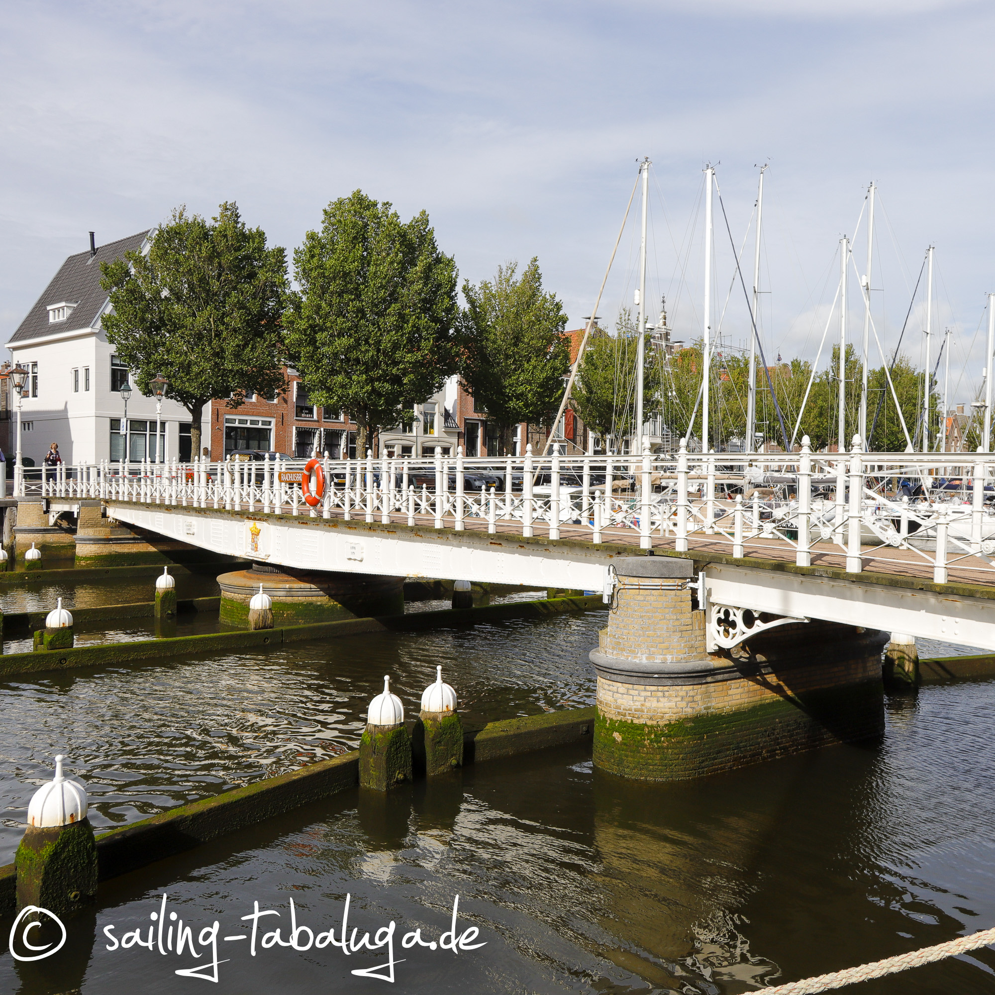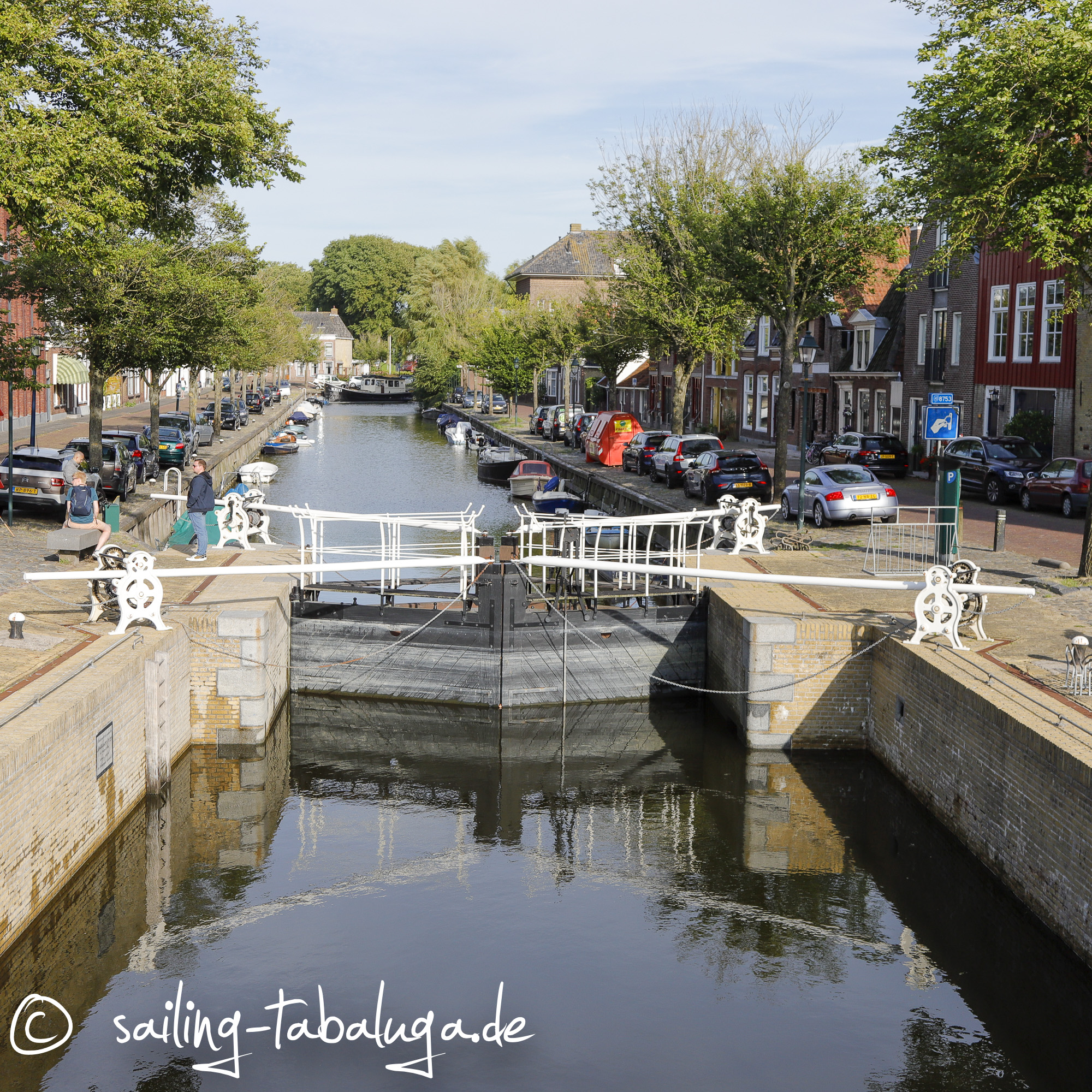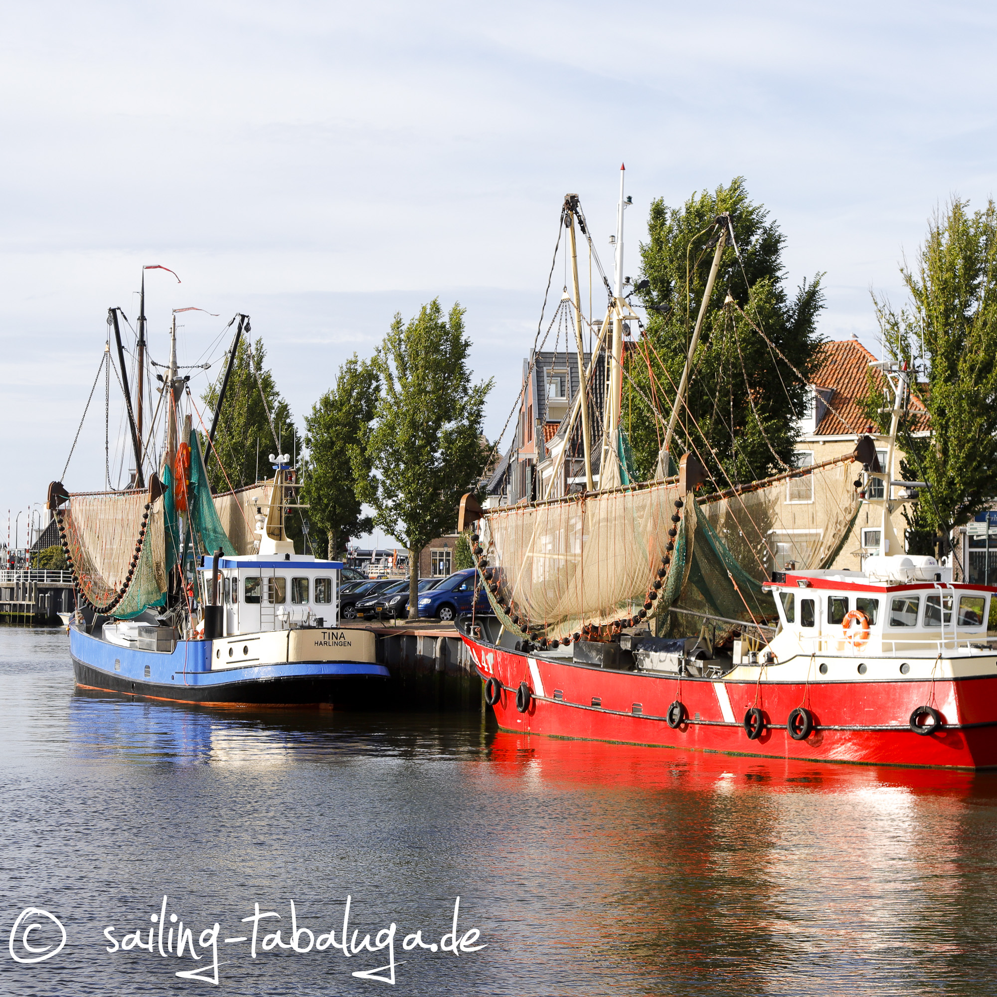 So beschließen wir schlussendlich, wenigstens Harlingen anzulaufen und dann zwischen Terschelling und Vlieland wieder raus auf die Nordsee und von da nach Borkum oder Juist zu segeln. Die Fahrt durchs Wattenmeer ist sehr entspannt, der Wind pustet ganz gut, aber die Wellen sind ja doch eher niedlich nachdem was wir bisher erlebt haben 😉. In Harlingen müssen wir vor der Schleuse ins Ortszentrum warten. Wir wundern uns, es ist doch Hochwasser? Wir erfahren, dass Springflut ist und auch dann die Tore geschlossen werden müssen. Eine Stunde warten ist angesagt. Das Hafenbecken vor der Schleuse ist schon gut gefüllt, entsprechend schwierig ist es, einen Anlegeplatz zu finden. Ein Manöver geht schief, weil der Typ auf dem Nachbarboot sich doch lieber mit seinem Bierchen als mit Helfen beschäftigt… sowas kann ich ja leiden… Schlussendlich liegen wir dann doch sicher an der Hafenmauer und warten auf die Schleusenöffnung. Mich holen ein wenig die Erinnerungen an meine ersten Segelerfahrungen ein. Hier in Harlingen hab ich 1992 das erste Mal in meinem Leben ein Segelboot betreten, fast genau auf dem Platz, an dem wir jetzt liegen. Die gute alte Pollux war ein klassisches holländisches Plattbodenschiff, eine Tjalk. Seitdem ließ mich der Segelvirus nicht mehr los, gute Jahre haben wir auf der Pollux erlebt. Damals waren uns die Yachtis, wie wir sie heute sind, noch sehr suspekt, all diese reichen, alten Schnösel… 😆