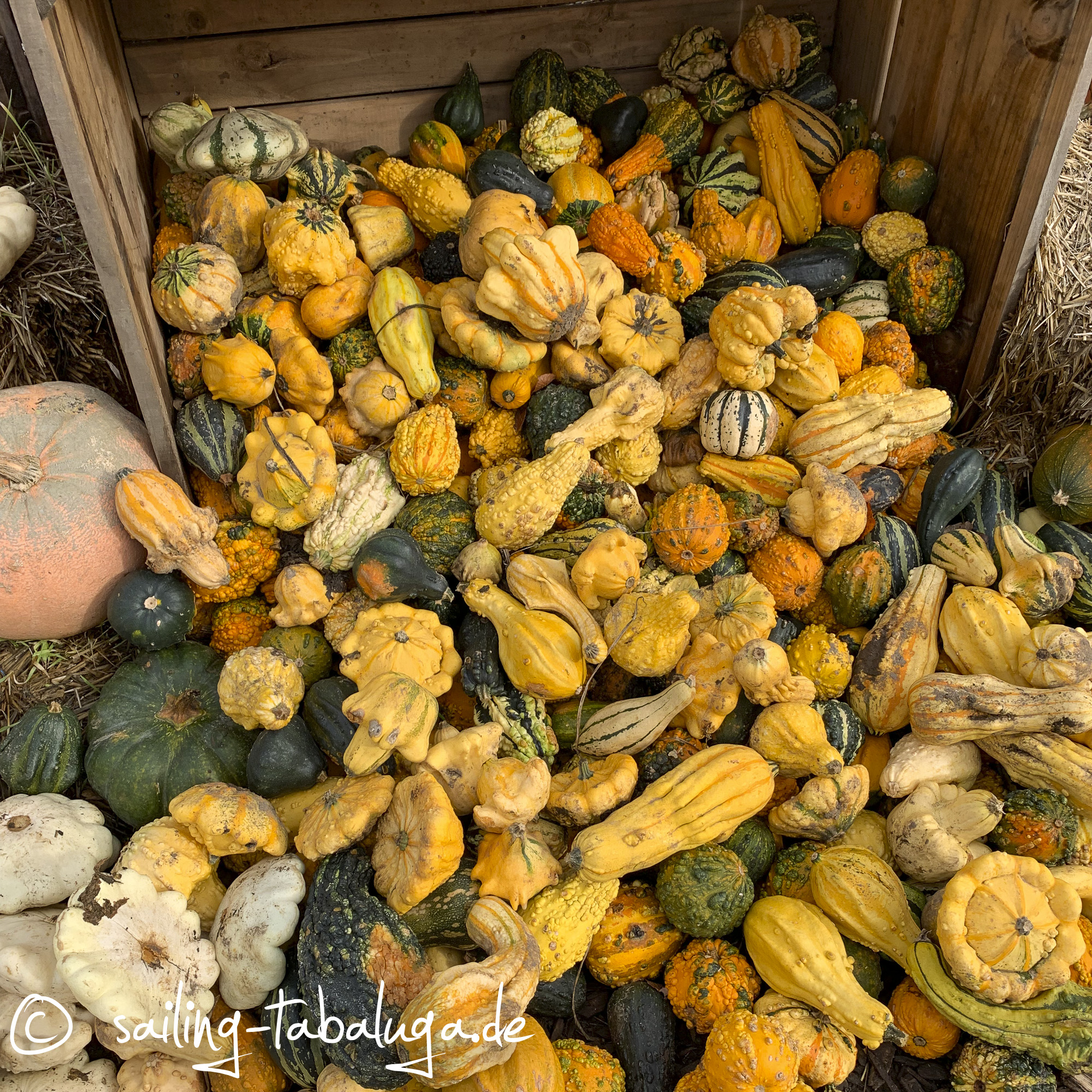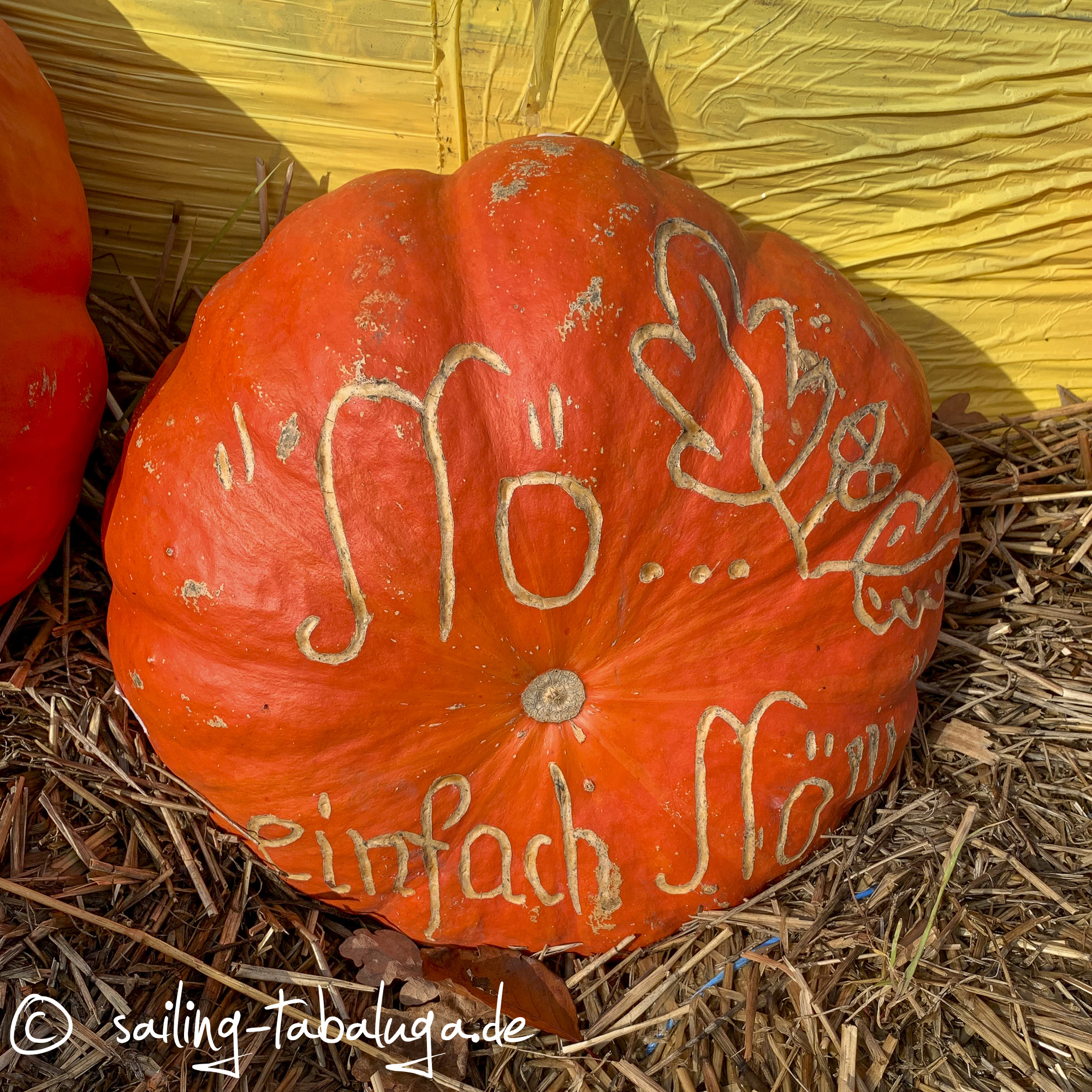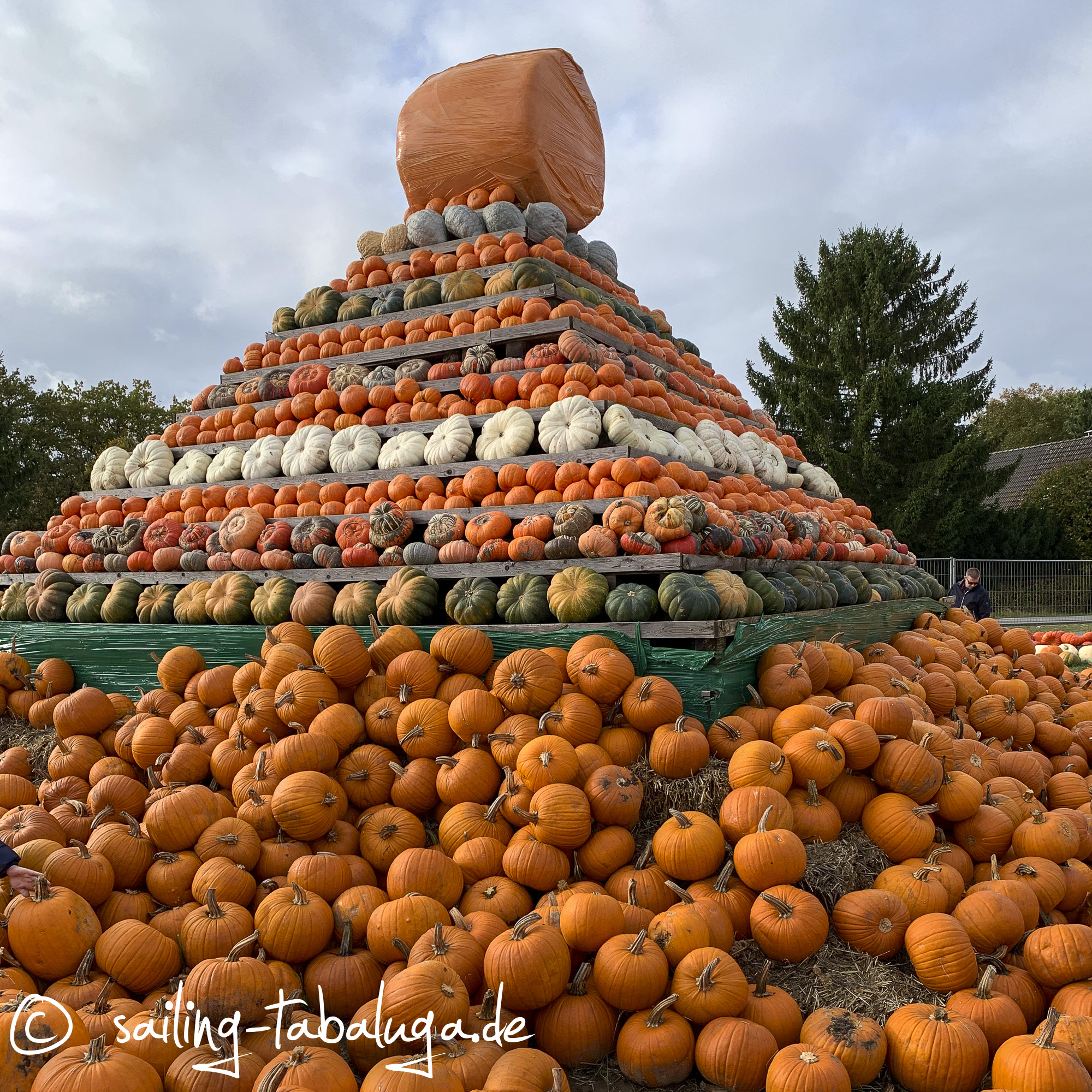 Auf dem Weg nach Stade kommen wir an einem Hof vorbei, auf dem jedes Jahr im Herbst hunderte, eher tausende Kürbisse zu Kunstwerken zusammen gestellt werden. Eine essbare Farbenpracht, reichlich Besucher erfreuen sich an diesem Anblick.