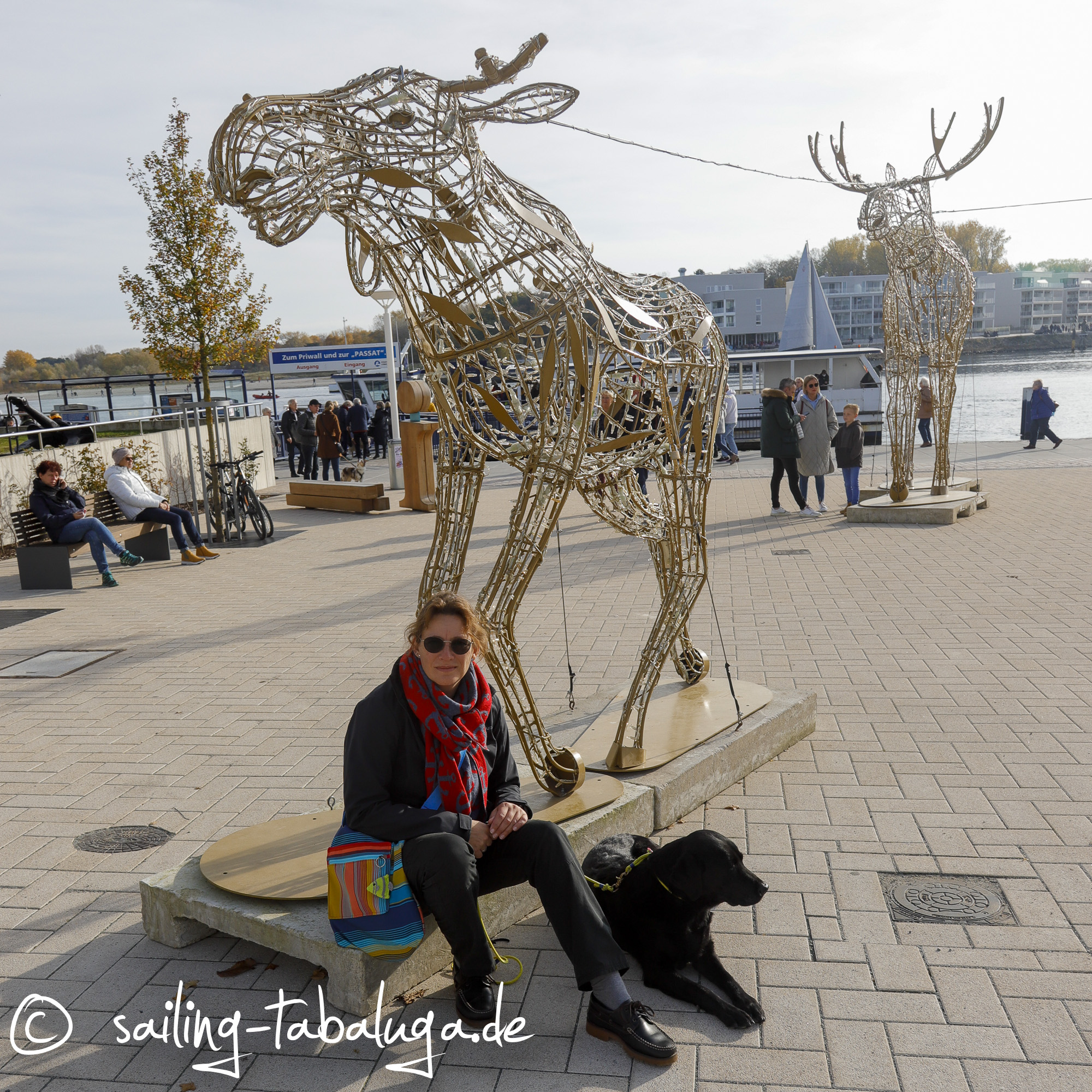 Und schon liegt der Nordostseekanal bei schönstem Wetter vor uns und wir genießen den ruhigen Tag. Es läuft gut, so dass wir uns entscheiden, bis Rendsburg durchzufahren. Kurz vor Rendsburg nähert sich uns ein anderer Segler und weist uns auf drei rote Signalleuchten hin. Das heißt, dass ein großes Schiff aus der anderen Richtung kommt und alle anderen in der Wartebucht halten müssen. Wir waren uns nicht sicher, ob es auch für Sportboote gilt, aber wir sehen einen kleinen Steg und legen dort gemeinsam an. Liese freut sich, sich kurz die Beine vertreten und die nötigsten Geschäfte verrichten zu können.