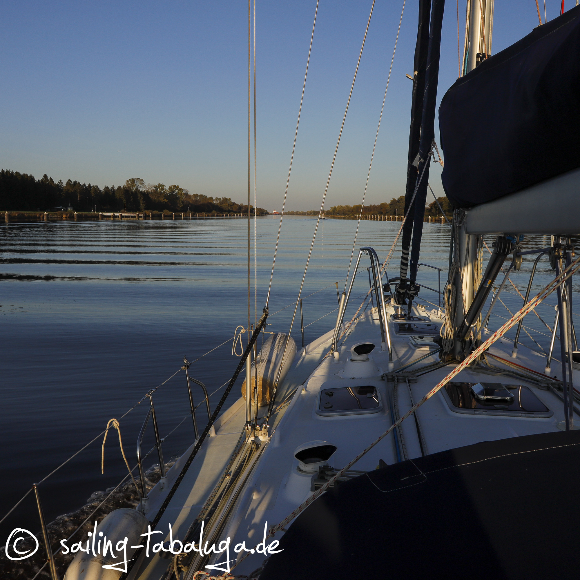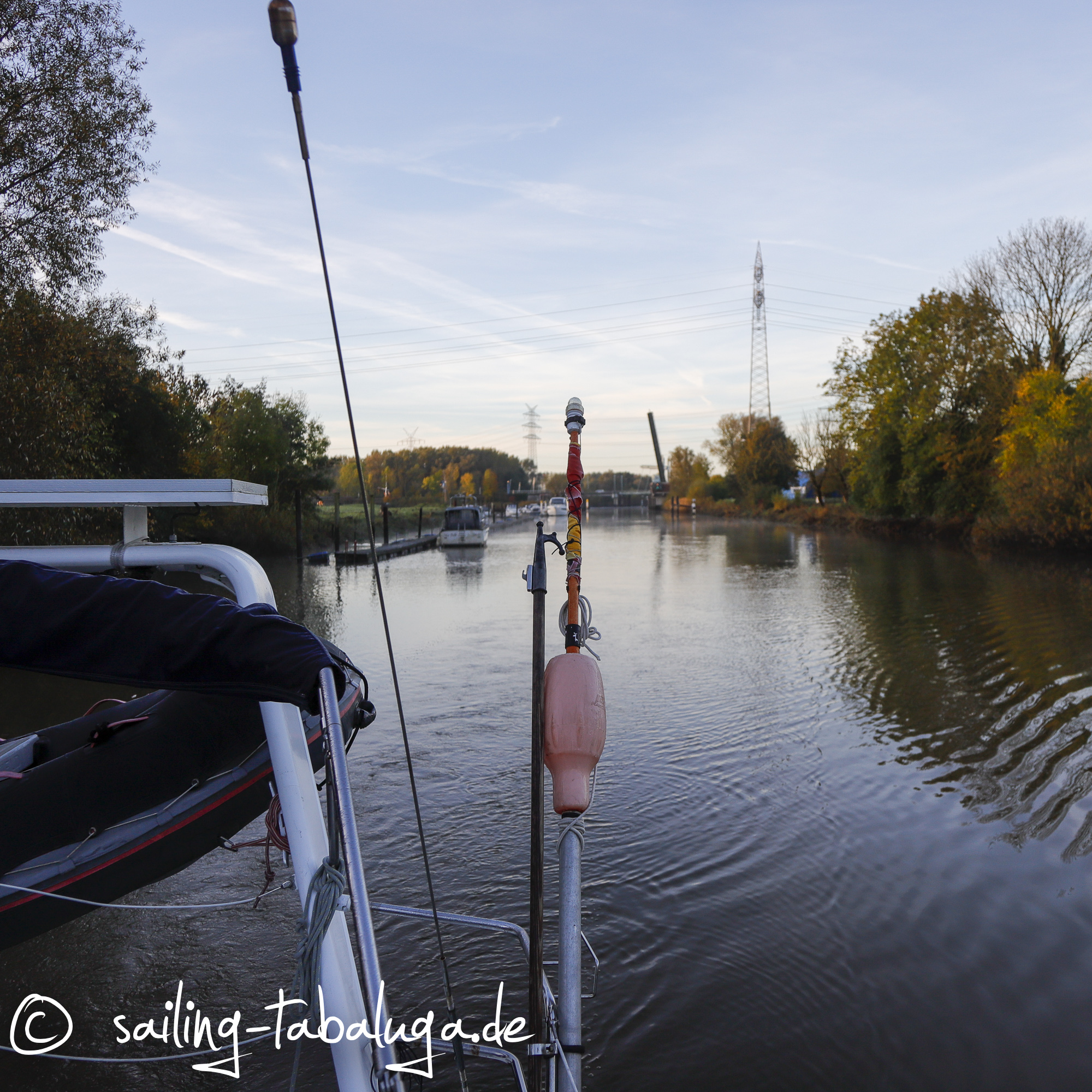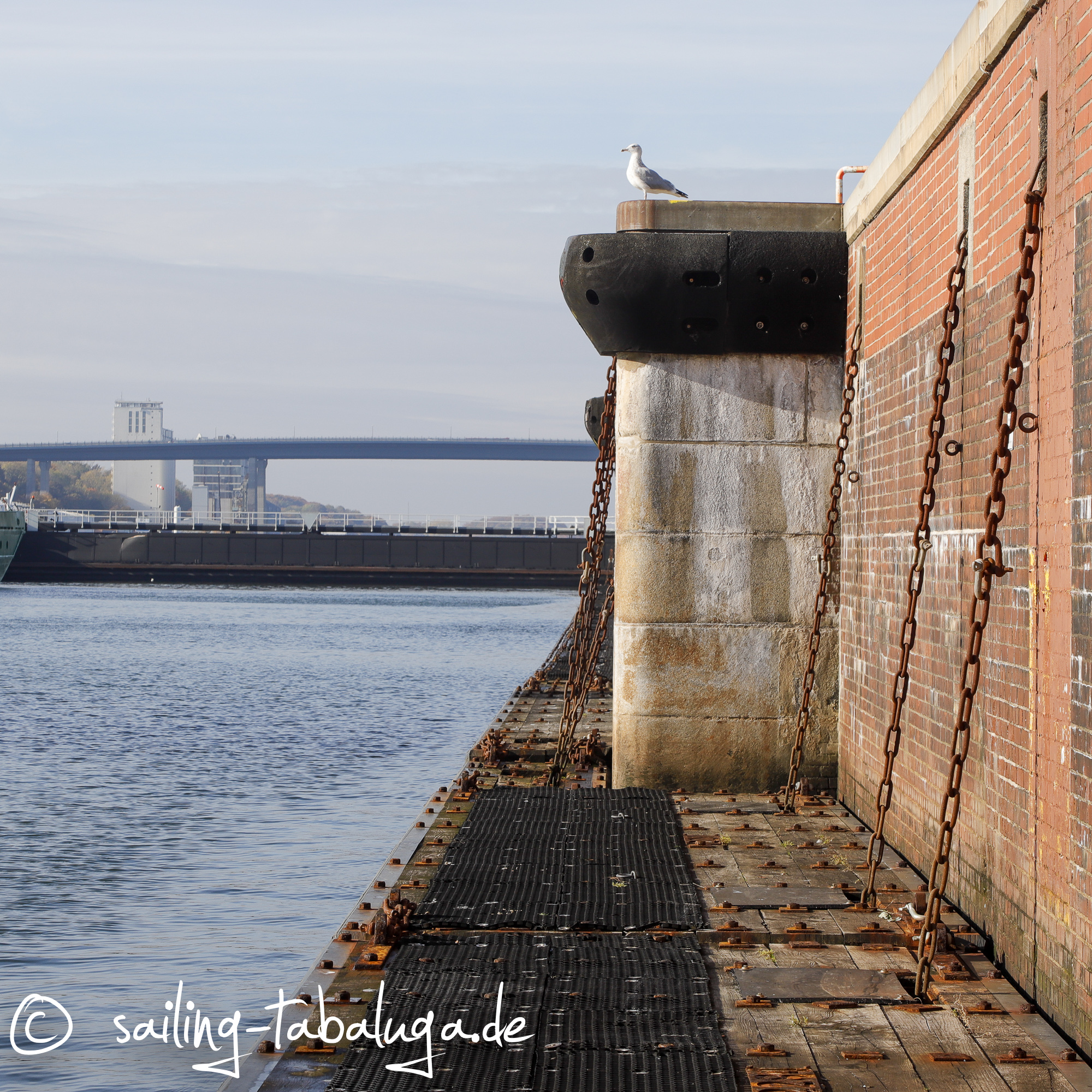 Wir starten an einem wundervollen, bitterkalten Herbstmorgen aus der Schwinge heraus in Richtung Schleuse Brunsbüttel. Die Berechnung der Gezeiten hat ein angenehmes Zeitfenster am Vormittag ergeben, so dass wir mit ablaufend Wasser die Elbe hinab und gegen 11 Uhr an der Schleuse sind. Der Nordostseekanal darf für Sportschiffe nur bei Tageslicht befahren werden, also müssen wir schauen, wo wir unterwegs einen Halt machen. Komplett bis Kiel ist es an einem Tag nicht zu schaffen. Wir haben unsere kleine Ausweichbucht im Sinn, in der wir schon vor zwei Jahren angelegt haben, aber ggf. geht es auch weiter.