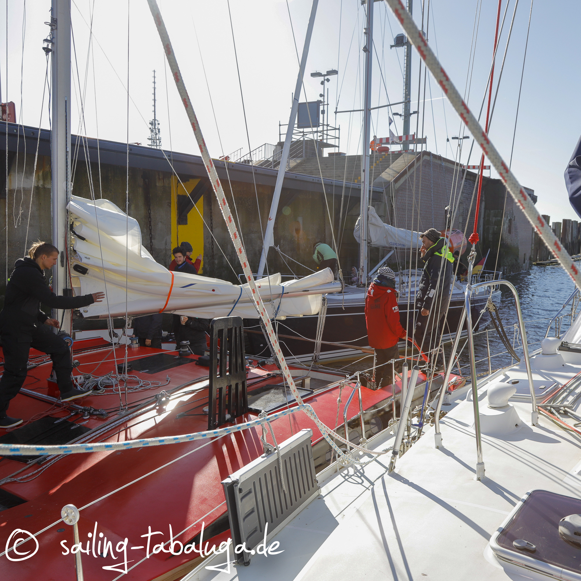 Wir düsen nach Großenbrode, Bernd fährt mit Bernard und der alten Tabaluga nach Burgtiefe. Dort angekommen warten schon Henning, der Lagerbesitzer, und Sven, der Kranmeister. Mit geübten Griffen haben wir das Einwintern bald geschafft. Wir gehen abends mit Bernard und seinem Sohn essen, als er uns gesteht, dass er fix und fertig ist, nach all den Informationen und ToDos… So ging es uns beim ersten Mal wohl auch 😉.