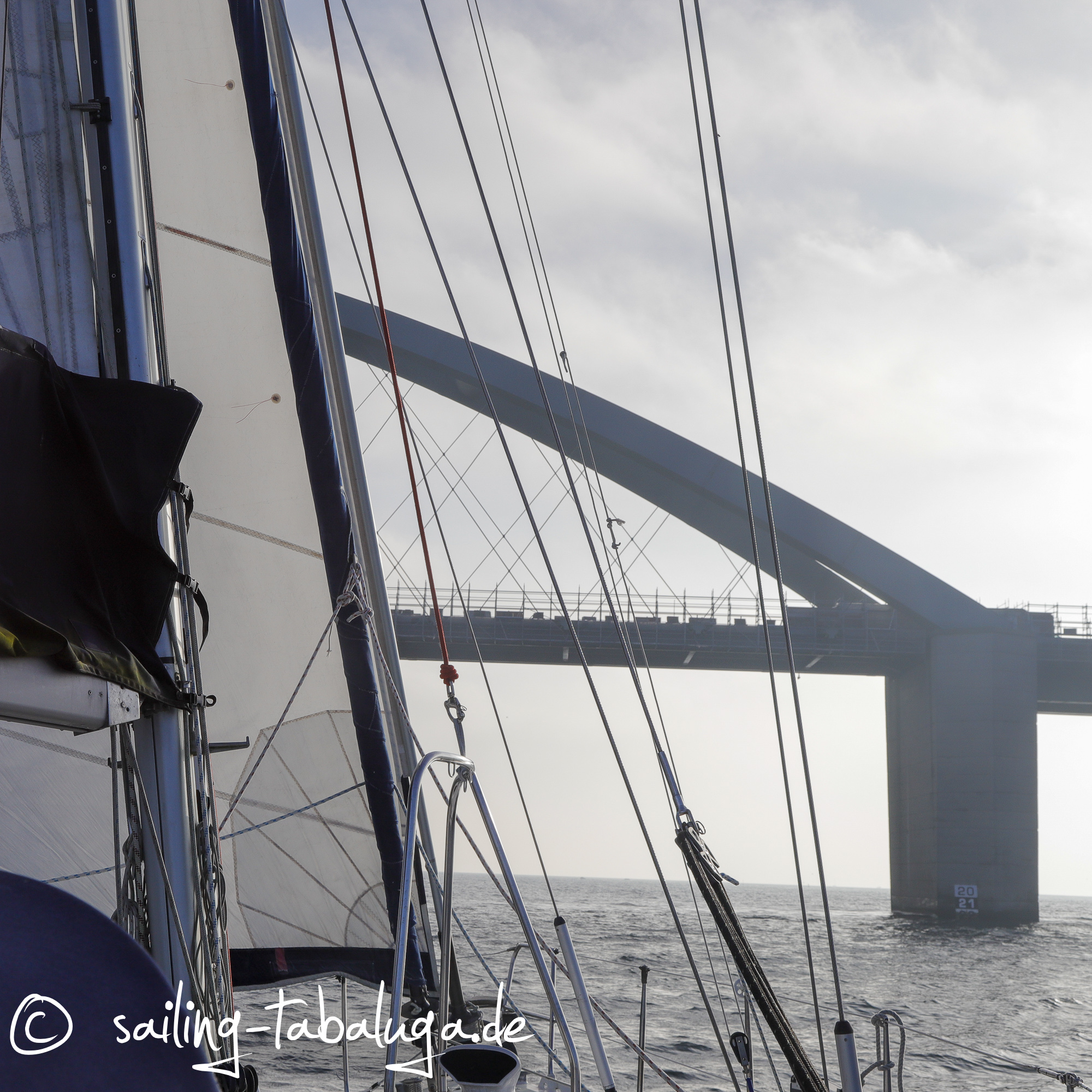 Segeln läuft heute richtig gut, wir haben Südwind. Eigentlich wollten wir ja nach Fehmarn, um die alten und die neue Tabaluga noch ein mal nebeneinander zu sehen. Der Wind soll aber die nächsten Tage konsequent weiterhin aus Süden kommen und immer stärker werden, was keine gute Bedingungen sind, um in die Lübecker Bucht hineinzukommen. Als wir nun mit unserer neuen Tabaluga unter der Fehmarnsundbrücke durchsegeln, überkommen uns tatsächlich sogar ein wenig Heimatgefühle.