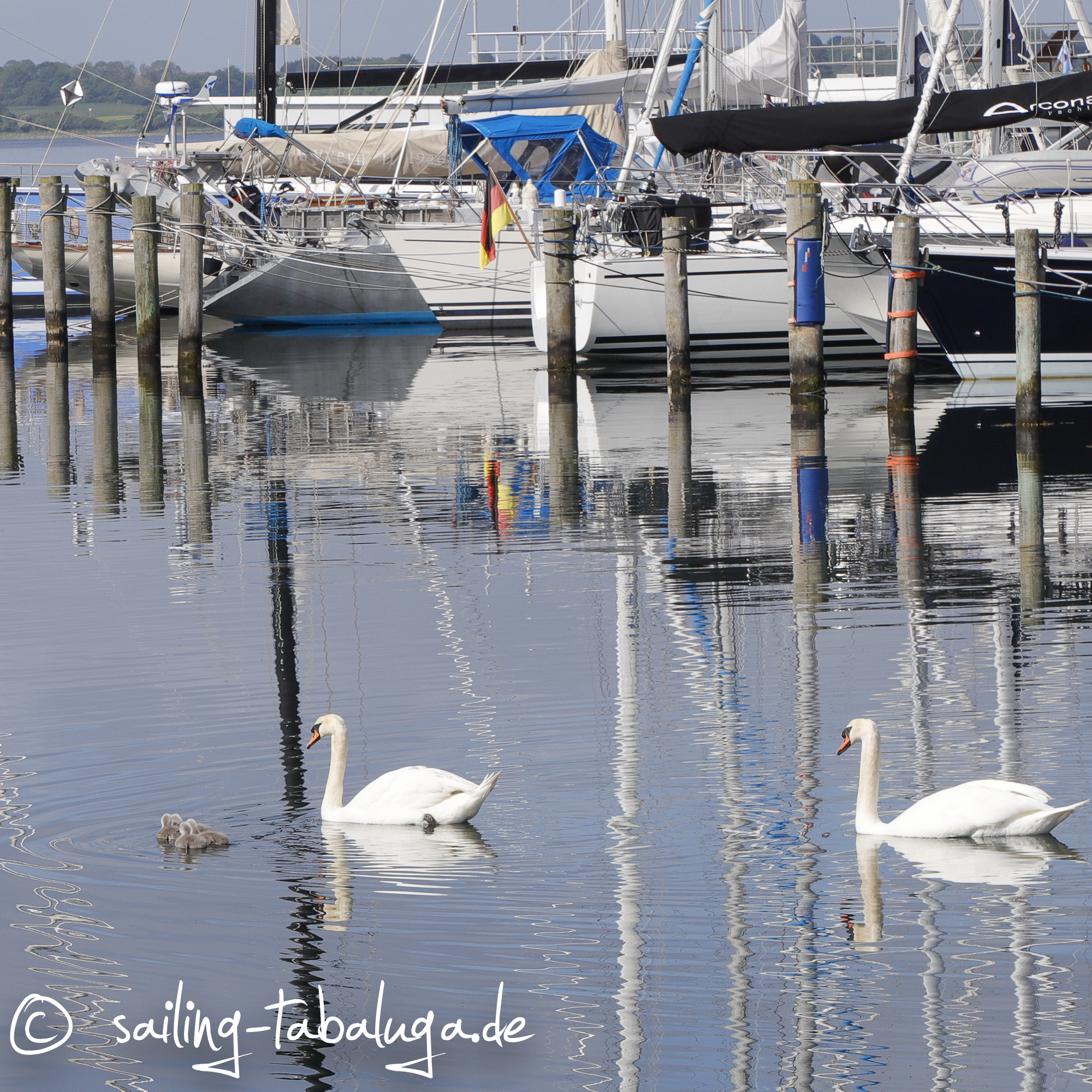 Am Sonntag morgen nach Himmelfahrt gehen wir unsere übliche morgendliche Hunderunde und sehen, dass sich unter Schwanenmamas Flügeln etwas bewegt… tatsächlich, da sind kleine graue Wattebäuschchen zu sehen. Sie sind da, die kleinen “hässlichen Entlein”. Am nächsten Morgen hat sich das Wetter beruhigt, die Sonne kommt heraus und will ich das Nest mit der großen Kamera fotografieren, in der Hoffnung auf kleine Plüschbälle vor der Linse und was ist: das Nest ist schon leer! Da lernen die Kleinen wohl schon schwimmen. Ob wir sie wieder sehen? Und tatsächlich dauert das gar nicht lange, denn sie schwimmen schon im Hafen umher! Am nächsten Tag besuchen sie uns am Steg. Wie wir erfahren leben die Elterntiere nicht das erste Jahr hier, sondern gehören wohl zum “Inventar” des Hafens. Wie wunderbar, so werden wir die Entwicklung der kleinen Schwäne wohl mitverfolgen können 🦢.