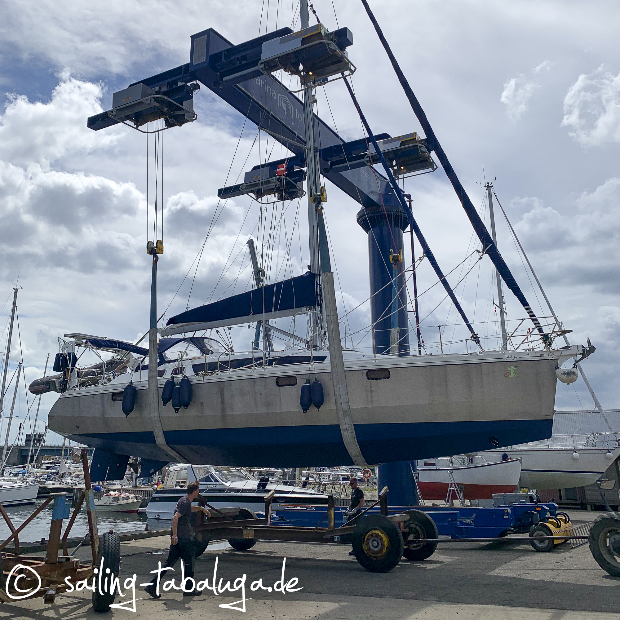 Am Dienstag morgen um 7 Uhr soll es nun soweit sein, Tabaluga wird gekrant. Bernd fährt hin, ich bleibe im Haus und fange schon mal mit der Arbeit an. Alles geht gut und die Handwerker tauchen auch bald auf. Wie durch Zauberhände funktioniert einfach mal alles! Alle machen einen echt guten Job und bald ist Tabaluga perfekt ausgestattet. Wir kommen den nächsten Tag in die Werft, da wird gerade ein noch größeres Schiff als unseres gekrant. Wie es sich herausstellt, ist der Eigner beim Streichen des Unterwasserschiffs blöd von der Leiter gefallen und war einige Minuten bewusstlos. Er ist mit seiner Lebensgefährtin im Krankenhaus und ein Freund kümmert sich ums Schiff. Er fragt uns, ob wir mit ihm eben nach Marina Minde fahren können, so ein großes Schiff alleine anzulegen, ist schon gewagt. Natürlich helfen wir gerne. Der Eigner hat zum Glück keine größeren Verletzungen erlitten, außer einigen blauen Flecken und einer aufgeplatzen Lippe. Er darf das Krankenhaus nach CT und weiteren Untersuchungen verlassen und verlangt im Hafen angekommen erstmal nach einem Bier 🍺. Ich verstehe ihn vollkommen! Wir fahren dennoch mit dem Freund auf dem Schiff mit, denn erschöpft ist der Eigner auf jeden Fall und möchte nach Hause.