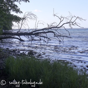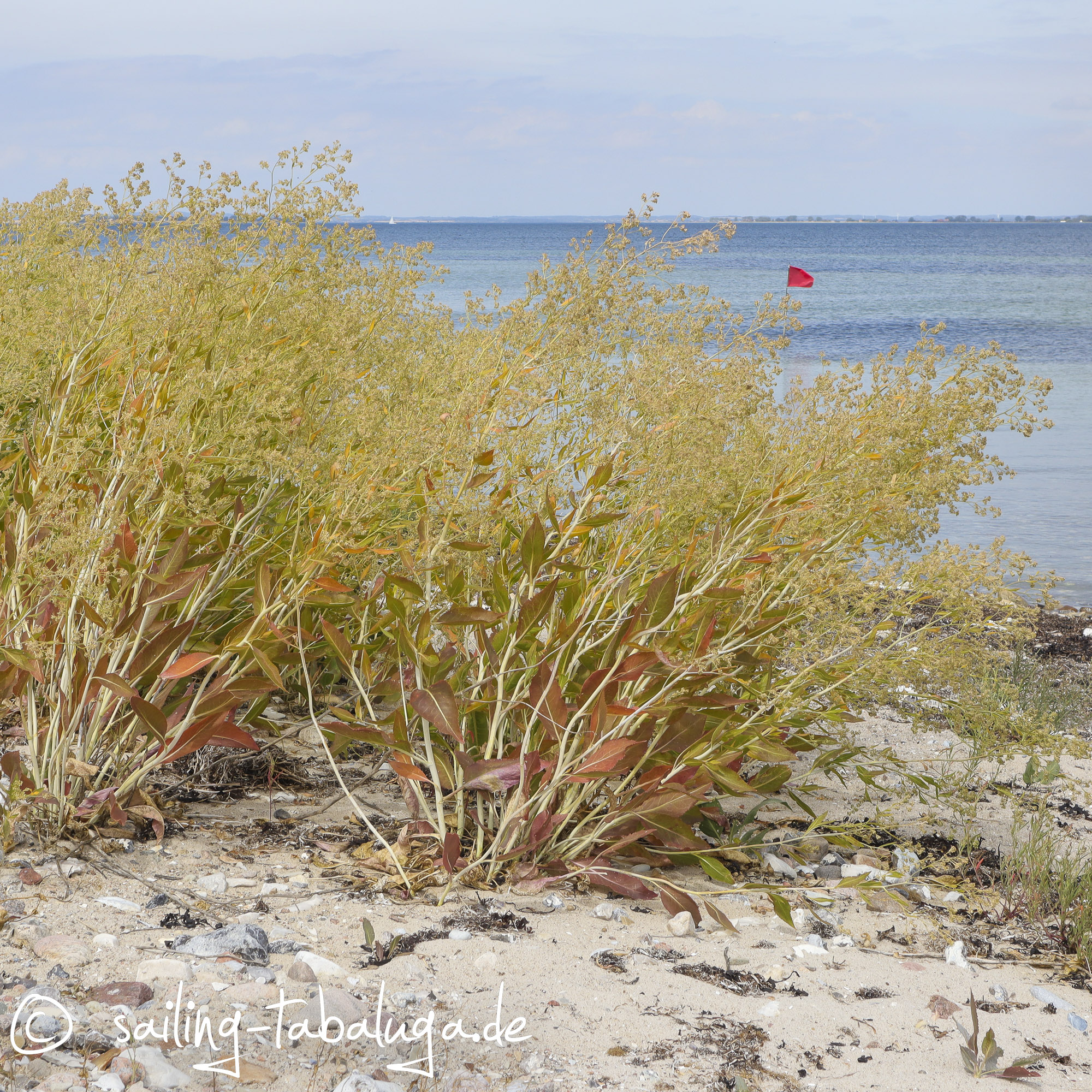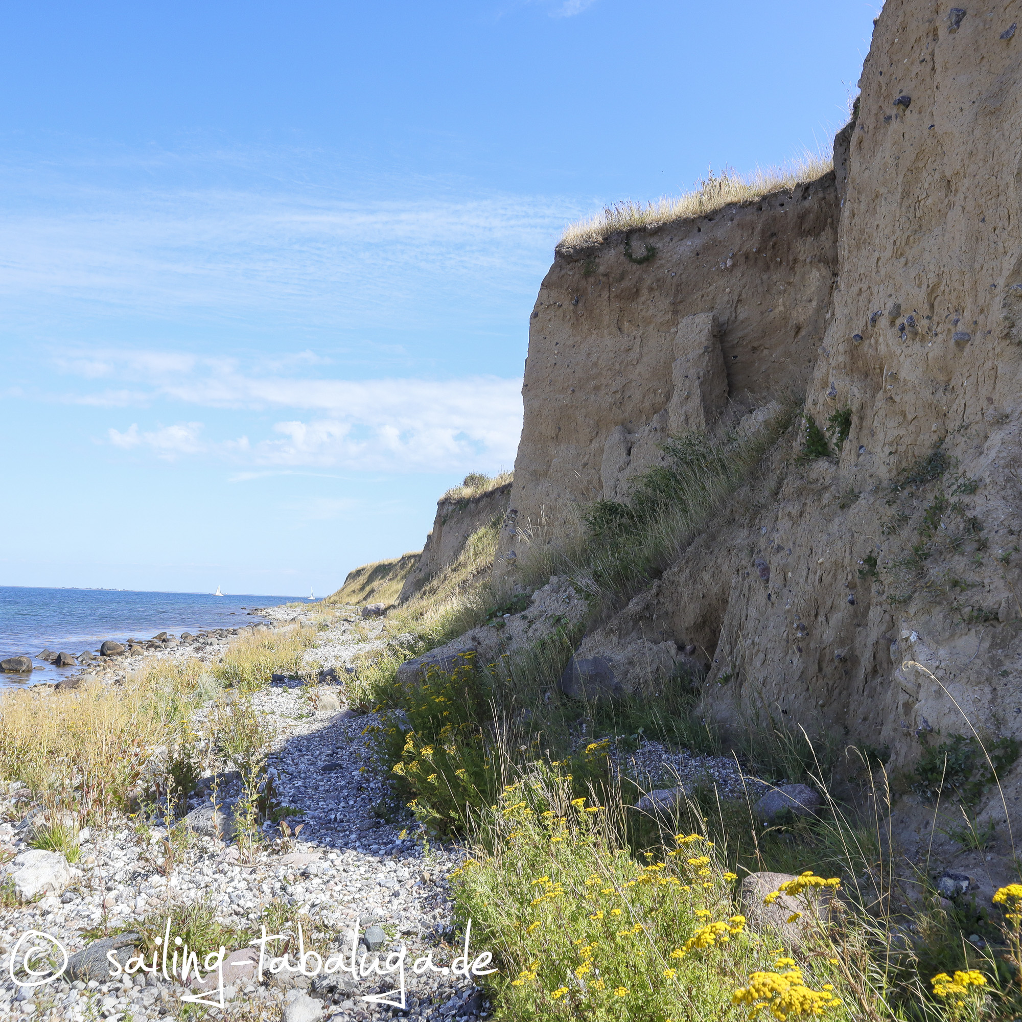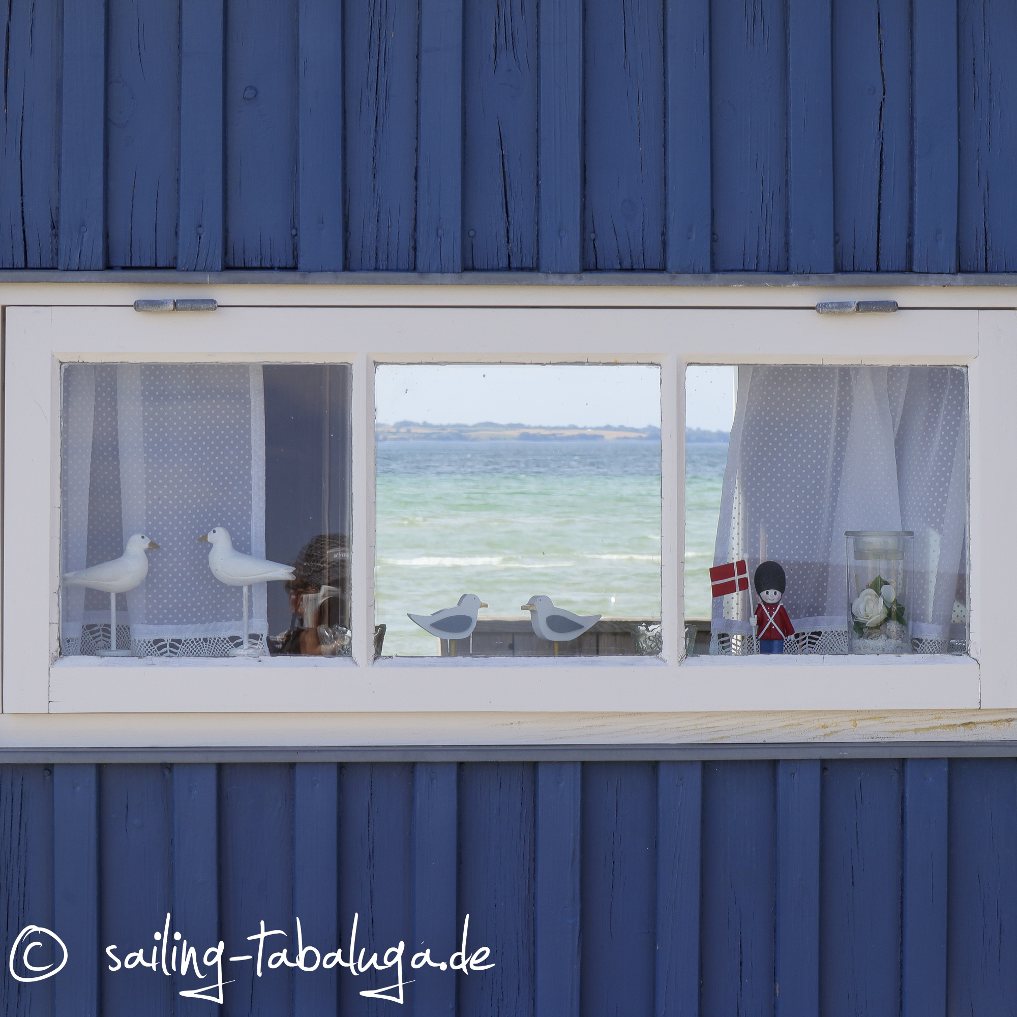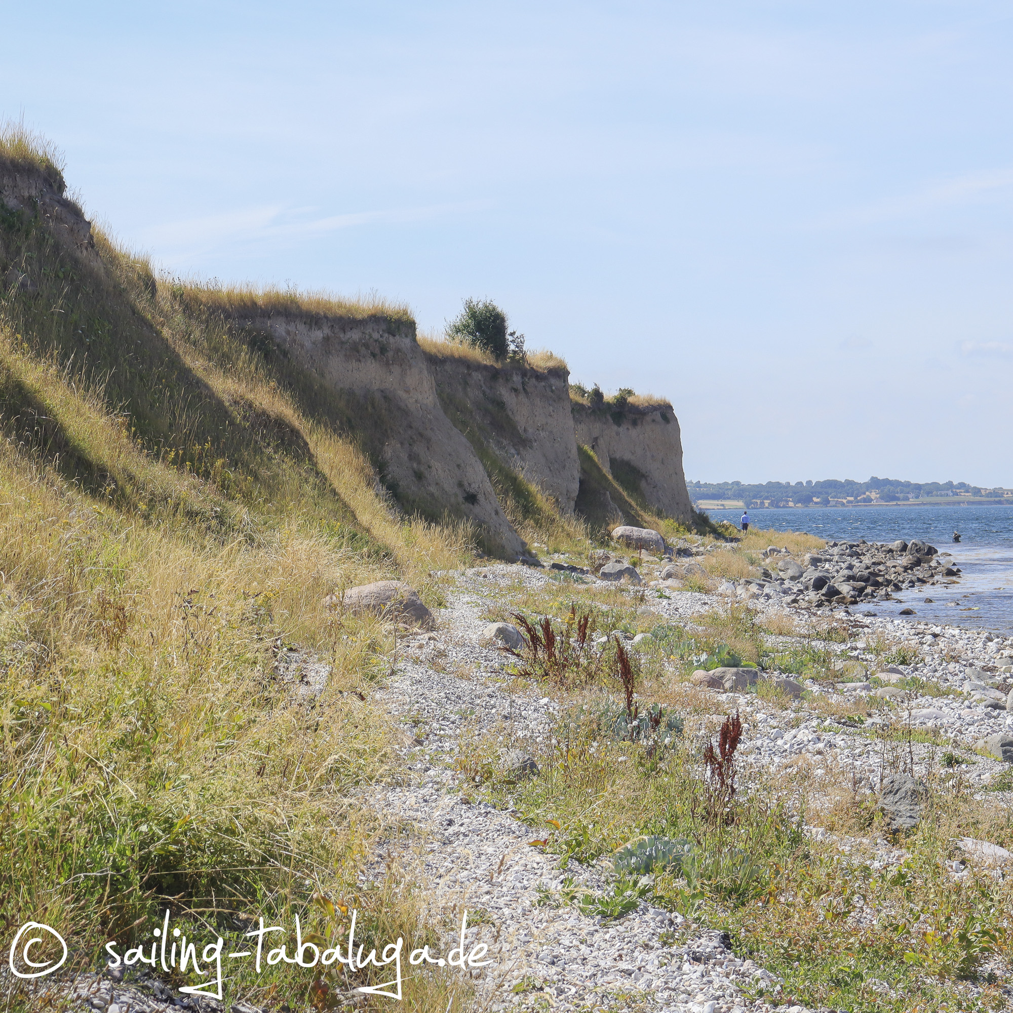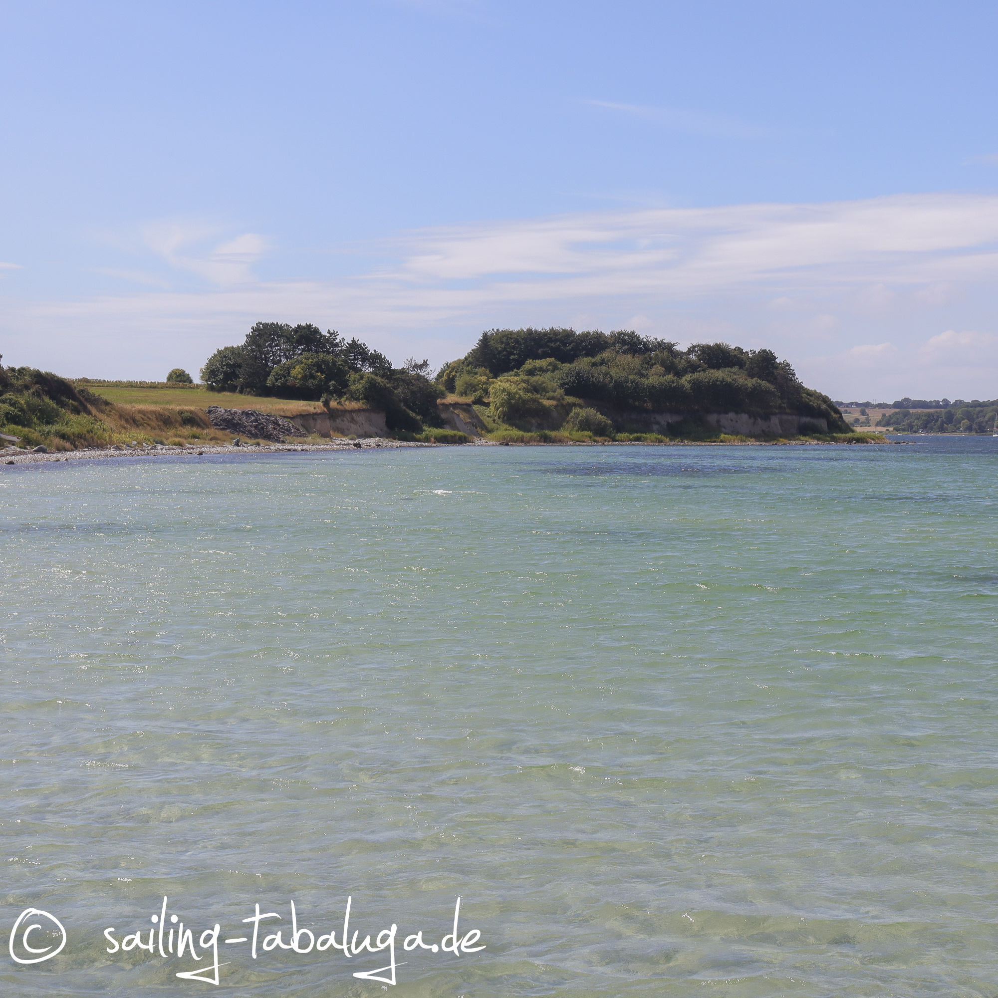 Wir beschließen durch den Svendborgsund zu fahren, halten aber nicht in der Stadt, es ist einfach zu heiß für Stadtbummel. Irgendwann müssen wir hier aber noch mal pausieren, im Vorbeifahren sieht Svendborg wunderschön aus. So suchen wir uns die nächste Ankerbucht, finden sogar eine Ankerboje und gehen schwimmen. Autsch, heute erwischen uns ein paar Quallen… nicht wirklich schlimm, aber so ein Gefühl wie eine Brennessel am Bein. An Land wartet ein Zauberwald aus alten Buchen auf uns, hier ist es gleich um ein paar Grad kühler und Lieschen erwacht ein bisschen zum Leben. Wir tuckern mit Schlauchi einmal quer über die Bucht, um in einem winzig kleinen Laden frisches Brot und ein paar Kleinigkeiten einzukaufen.