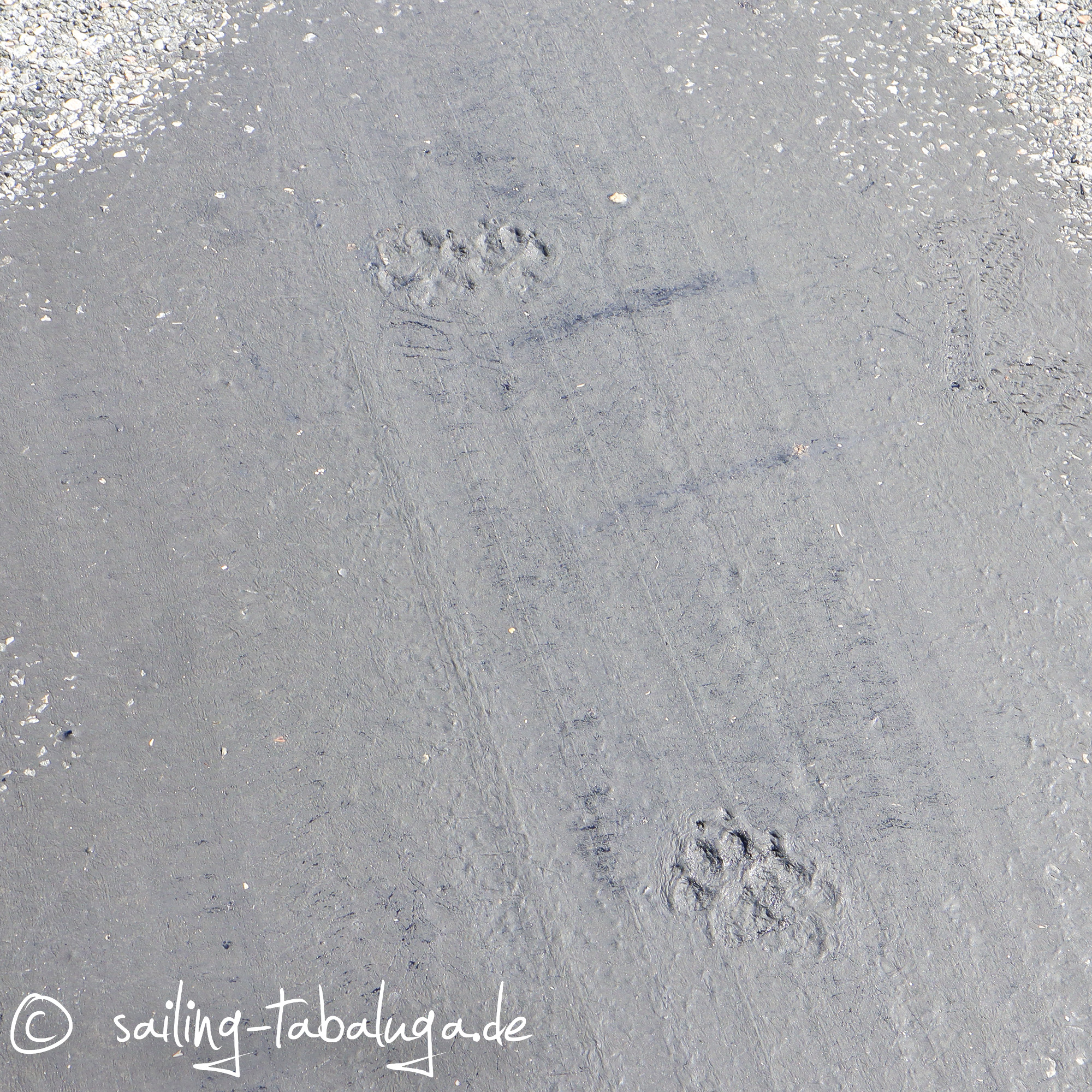 Nachmittags machen wir einen ausgiebigen Spaziergang zu den bunten Strandhäuschen und zur Steilküste der nördlich herausragenden Halbinsel. Das Wasser schimmert in allen Blau und Türkistönen, es ist unglaublich schön. Fast 8km sind wir unterwegs, uns tun Füße und Pfoten weh. Der Asphalt ist so heiß und weich, dass Lieschen an einer Stelle Pfotenspuren hinterlässt und danach sofort ins Wasser will zum Pfoten kühlen. Sie sucht sich dafür eine ungünstige Stelle mit vielen großen Steinen, kommt fast nicht mehr zurück und stolpert noch über eine Metallstange. Die Arme… aber es scheint nichts verletzt zu sein.