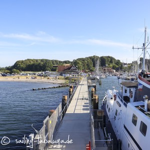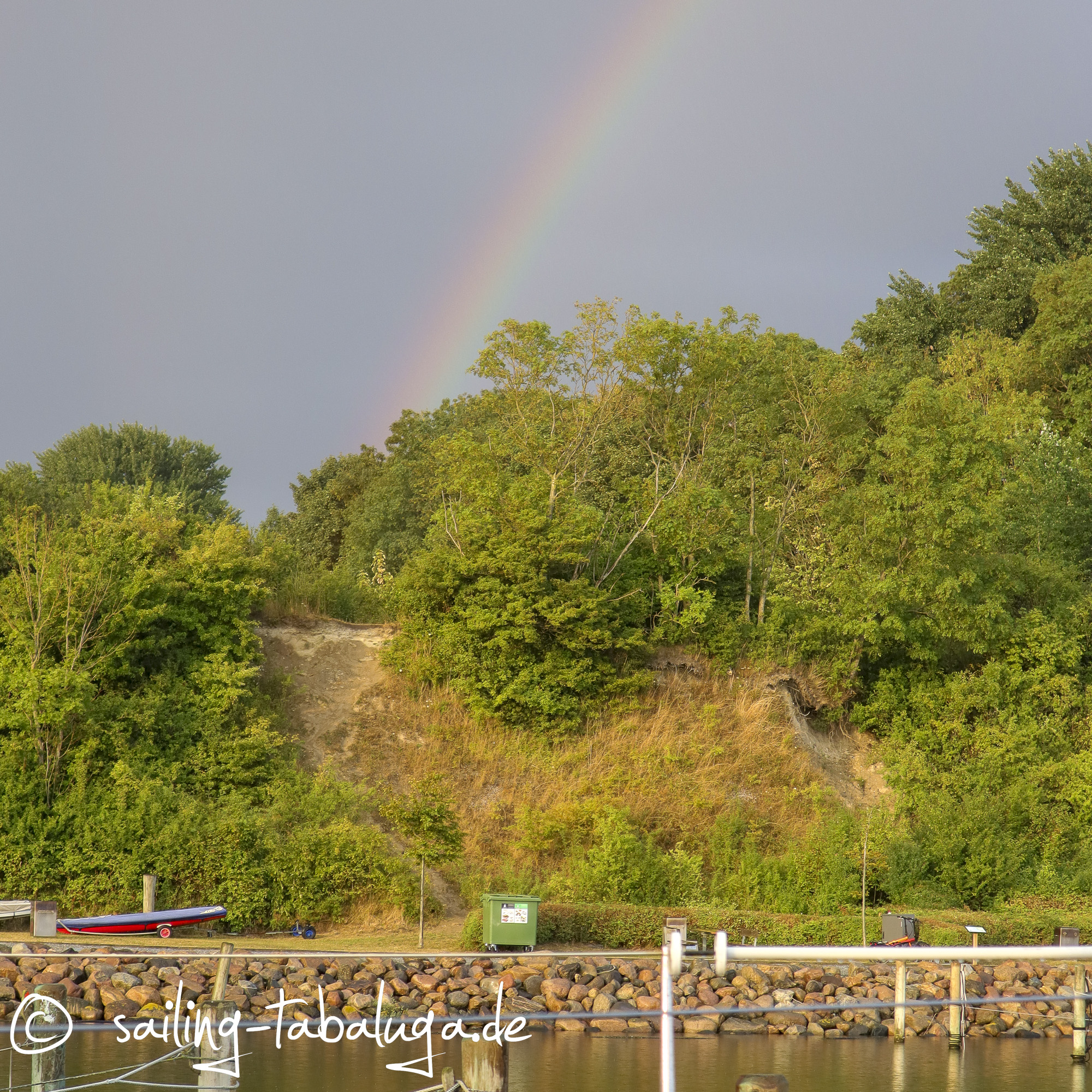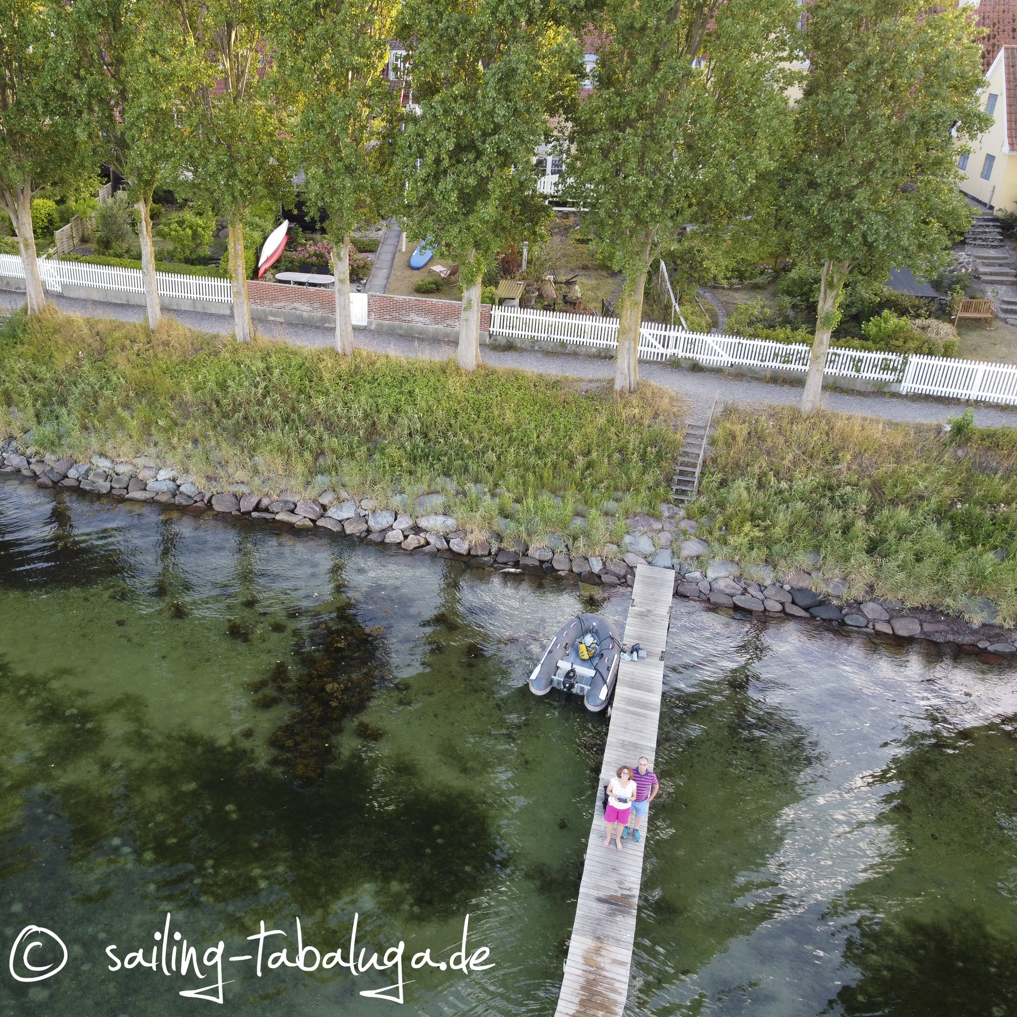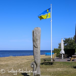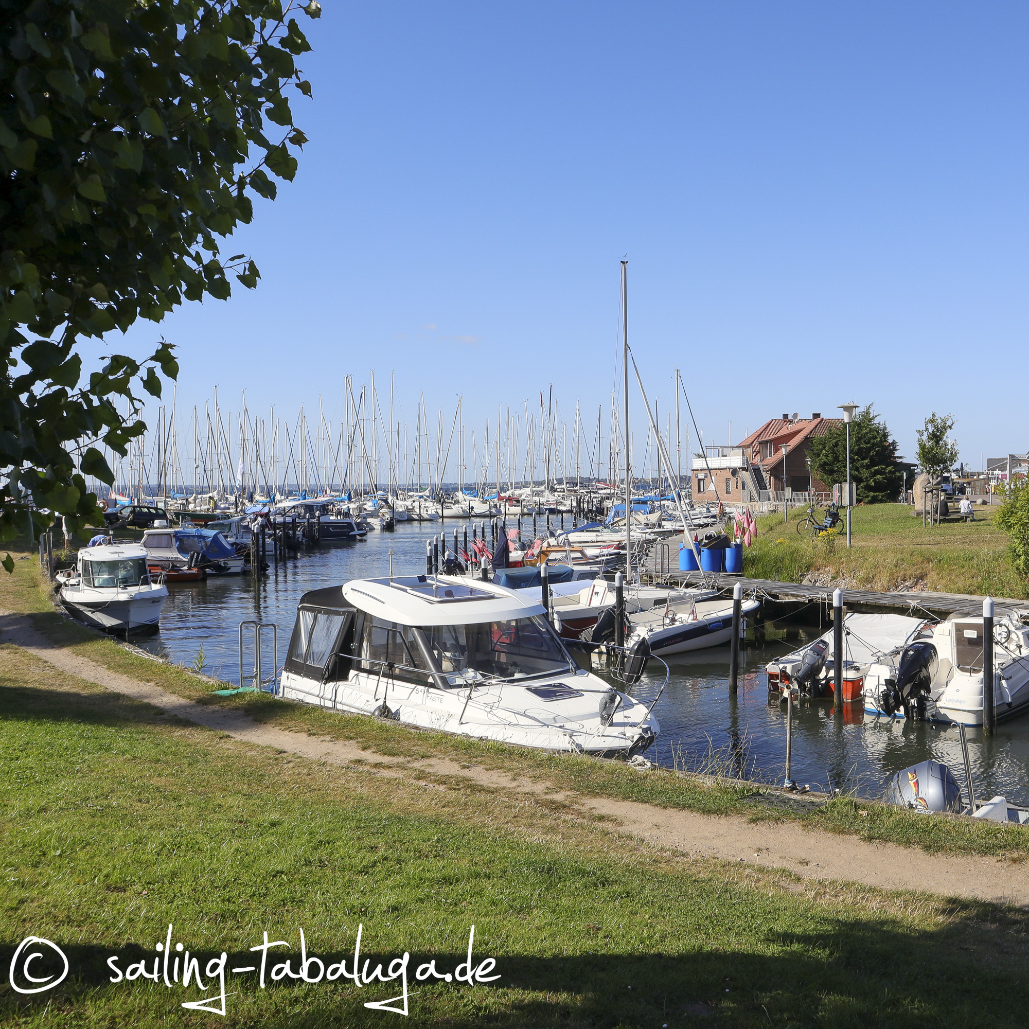 Ein Dokument fehlt Tabaluga noch und zwar ist die Gasprüfung nach deutschem Standard noch nicht durchgeführt worden. Im Hafen “gegenüber” könnte ein Herr das heute noch machen, also tuckern wir die 5 Seemeilen nach Langballigau. Wir können direkt vorm Hafenmeisterbüro quasi in der Hafeneinfahrt anlegen. Der Wind drückt uns auf den Steg, aber alles geht gut, auch vor einigen Schaulustigen. Carsten kommt wie versprochen an Bord, jammert ein wenig über die französischen Yachtbauer, aber alles ist soweit in Ordnung und wir bekommen das versprochene Siegel.