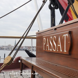 Gebaut im Jahr 1911 zunächst als Frachtsegler zwischen Europa und Südamerika, in den Fünziger Jahren als Segelschulschiff eingesetzt, umrundete sie 39mal das Kap Hoorn. 1957 wurde sie außer Dienst gestellt, da es sich nicht mehr rentierte, Segler dieser Größe zu betreiben. Sie zeigte ausgezeichnete Segeleigenschaften, erreichte unter 4.100 m² Segelfläche eine Geschwindigkeit von bis zu 18 Knoten. Seit 1959 gehört die Passat der Hansestadt Lübeck, was bis heute so geblieben ist. Sie diente als Ausbildungsstätte, Jugendherberge, Veranstaltungsort und steht mittlerweile unter Denkmalschutz. Sie ist zwar noch schwimmfähig, aber nicht mehr fahrtüchtig. Eine Initiative diesbezüglich wurde von der Stadt Lübeck bisher immer abgelehnt, da die Kosten nicht abschätzbar wären. Schade, denn der Blick über den Klüverbaum Richtung offenes Meer ist so vielsagend. Auch für ein Schiff, wenn man wie wir daran glaubt, dass auch ein Schiff eine Seele hat…